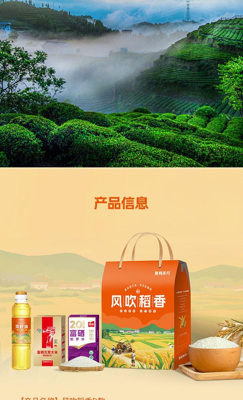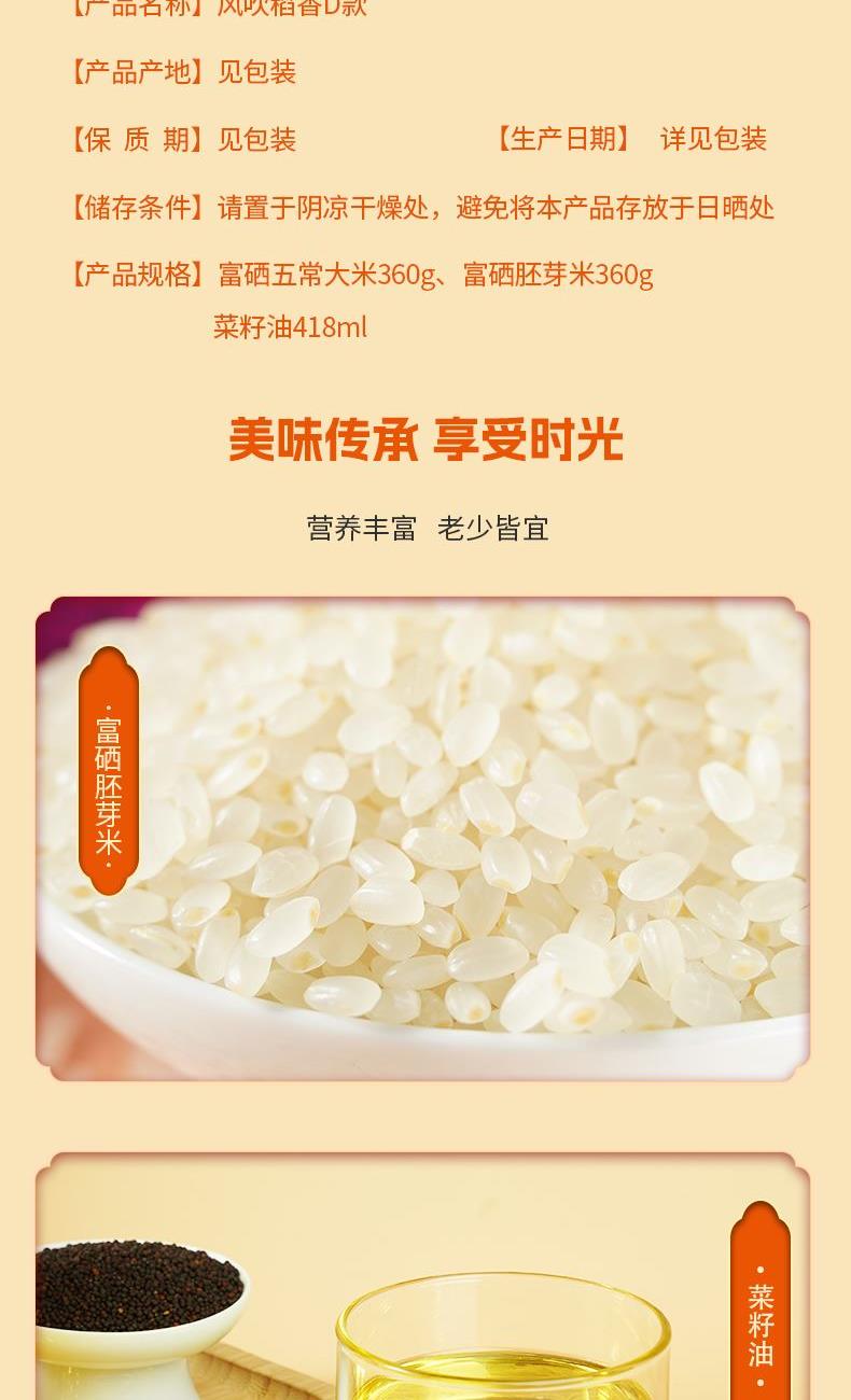 产品信息 品 名:风吹稻香D款 规 格:富硒五常大米360g、富硒胚芽米360g, 菜籽油418ml, 包 装:长25cm宽7cm高32cm 产品特色 1、富硒大米富含有机硒,每100g平均硒含量≥20ug;更易被人体利用吸收 2、正宗五常大米,稻花香二号。胚芽米保留米粒“生命核心”--米胚芽 3、菜籽油油品透亮、香味浓郁,烟点高、炒菜油烟少、低温下不易凝固等特点;菜籽油中还含有丰富的维生素E以及油酸、亚油酸、亚麻酸等 4、精美礼盒,送礼佳品。