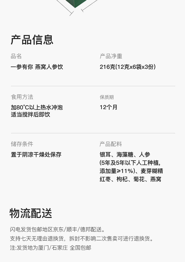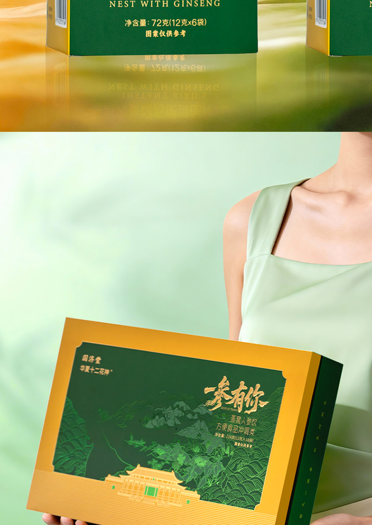 规格:冲调燕窝人参饮12克/袋*6袋/盒*2盒 冲泡杯1个 净含量:144克 食用方法:本产品拆袋放置于容器中,加入200-250mL开水,冲泡搅拌均匀,即可食用。 配料:银耳、海藻糖、人参(5年及5年以下人工种植,添加量≥11%)、麦、芽糊精、红枣、枸杞、菊花、燕窝(添加量≥0.07%) 保质期:12个月 贮存条件:置于阴凉干燥处保存 尺寸:23.1*36.6*9.5cm