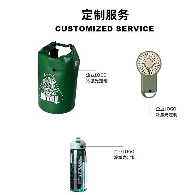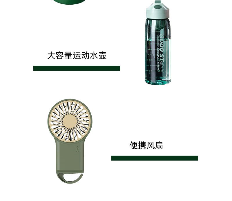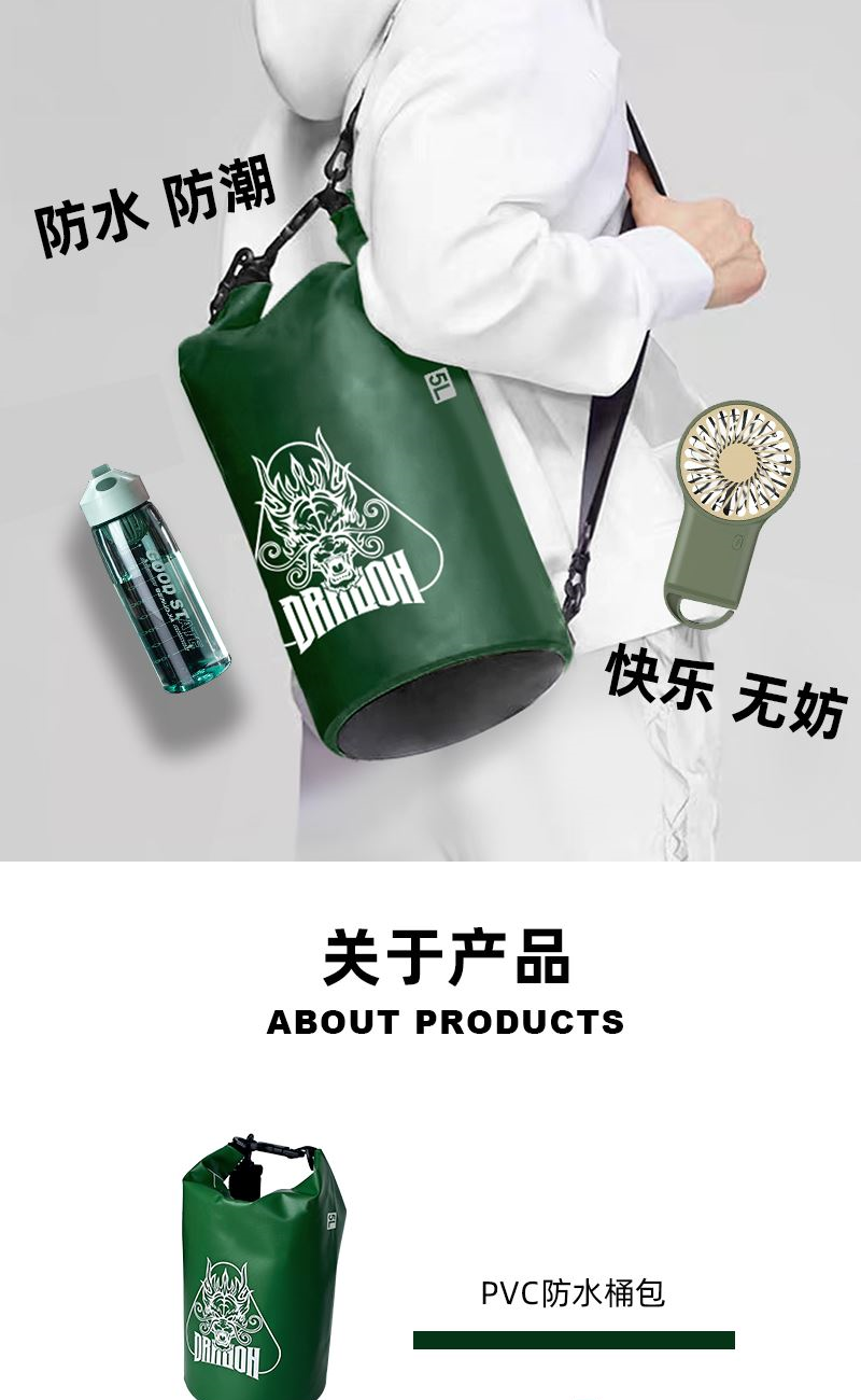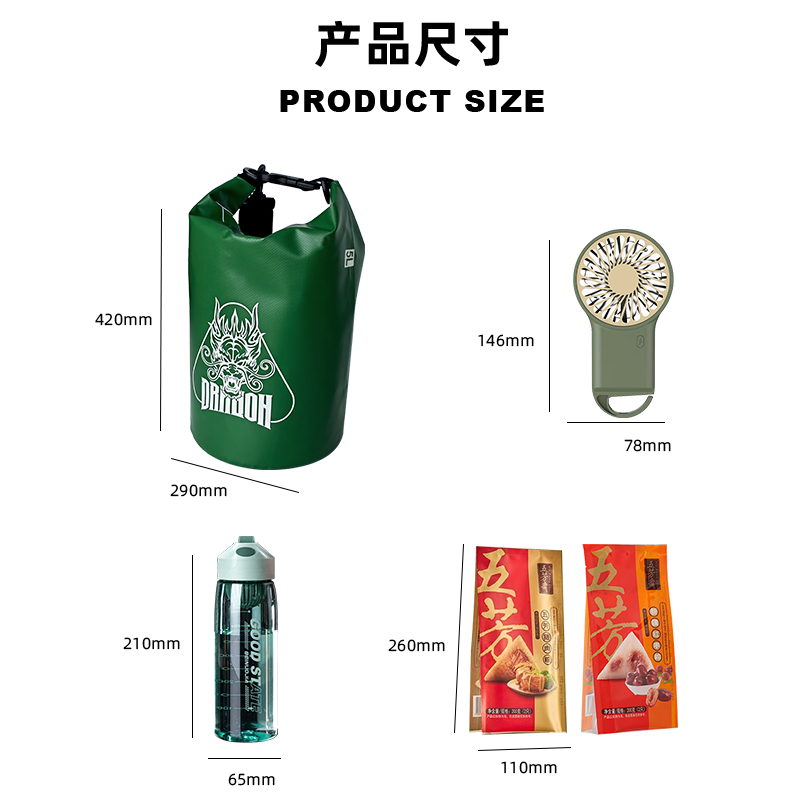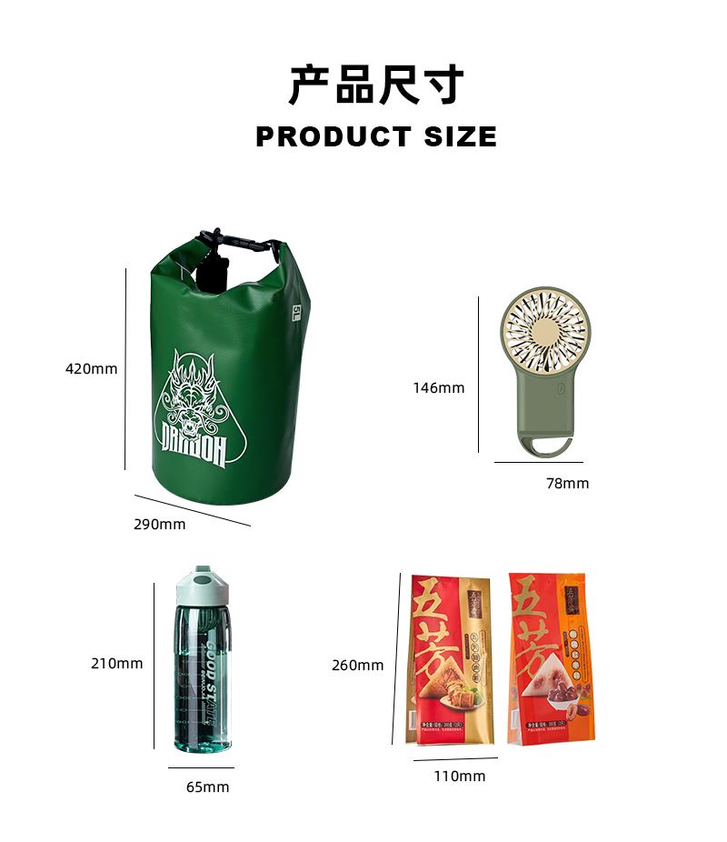 礼盒参数: 礼盒尺寸:18*18*32cm 套装重量:1000g/套 外箱尺寸:46.5*43.5*45.5cm 详细介绍: 1.防水桶包 材质:500D PVC底夹网布 容量:5L 2. 大容量运动水壶 超大容量、加厚耐摔、 带搅拌网格 颜色:绿、咖(随机) 杯体:食品级塑料 容量:550ML 3.便携风扇 悬挂、立握 三档风速 USB充电接口 4.粽子4枚 ◆ 100克鲜肉粽 2个/袋 ◆ 100克红枣粽 2个/袋