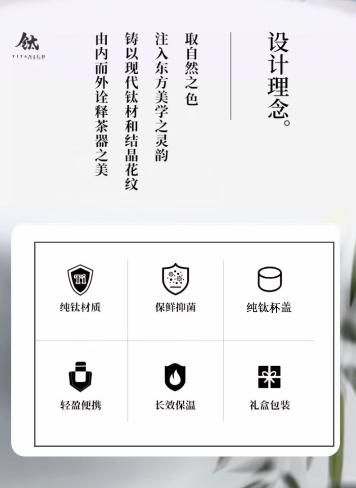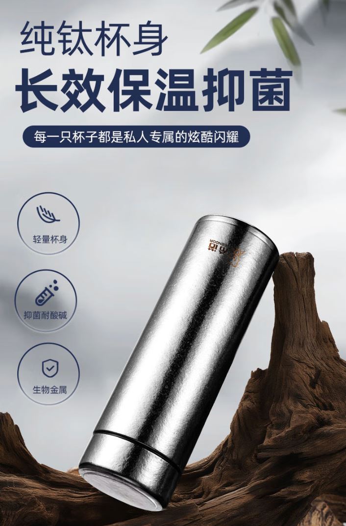 产品规格: 容量:XN-T2926/450ml 规格:XN-T2926/19.8*6.5*口径3.9cm 颜色:银月白、远天蓝、云海雾凇 杯体:TA1纯钛 杯盖:TA1纯钛+PP 滤网:TA1+硅橡胶 产品卖点: 1.方便携带,轻巧材质,随行随饮 2.纯钛杯身,y菌耐酸碱 3.夏季可盛放冰镇饮品,冬季可盛放热水花茶享受恰到好处的温度。 4.纯钛内胆具有保鲜效果,使用过程中无重金属析出,且不产生任何异味