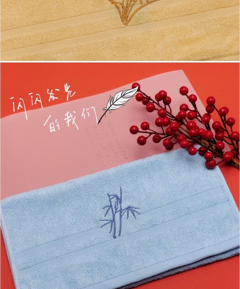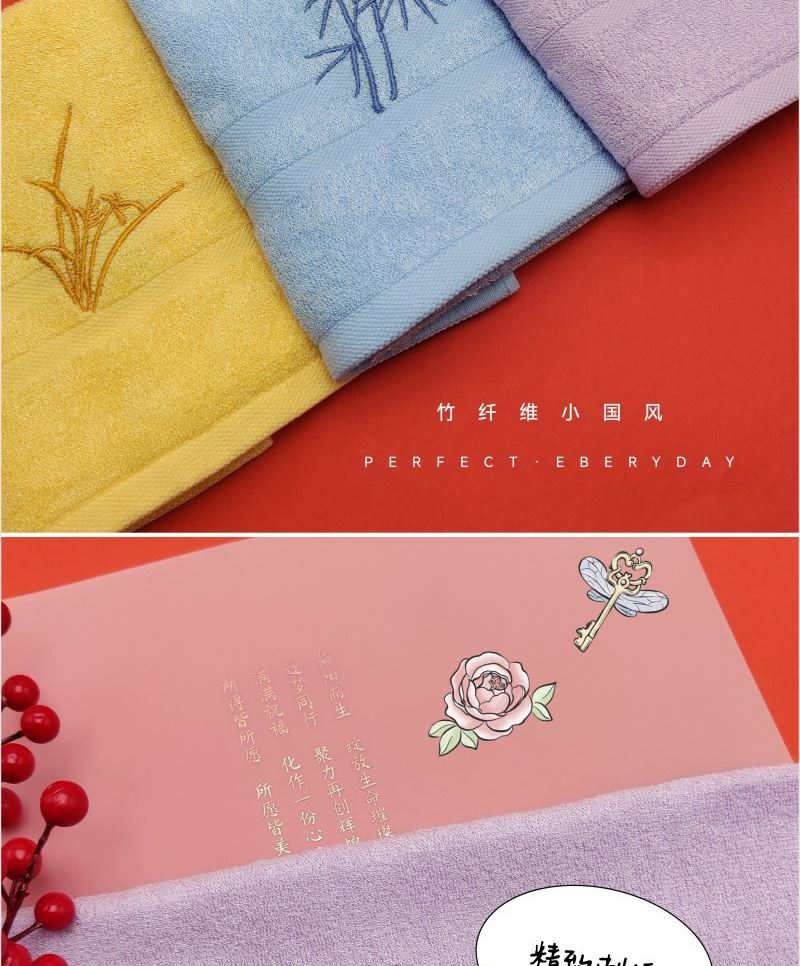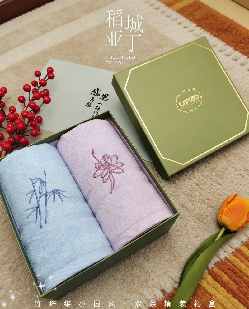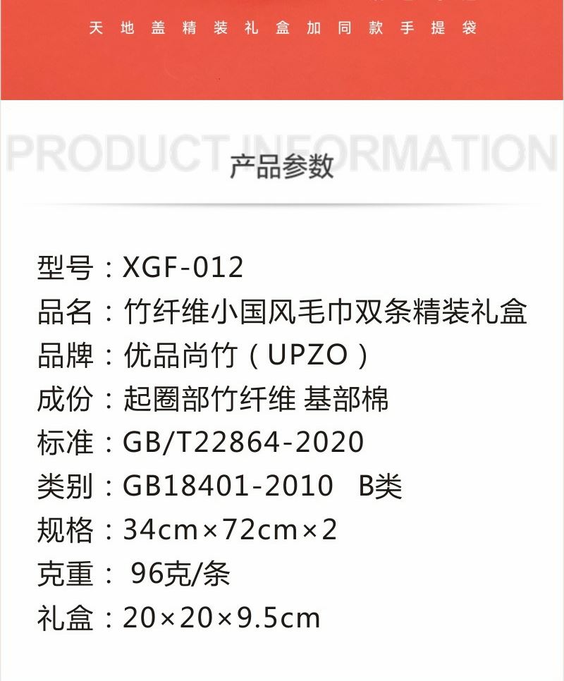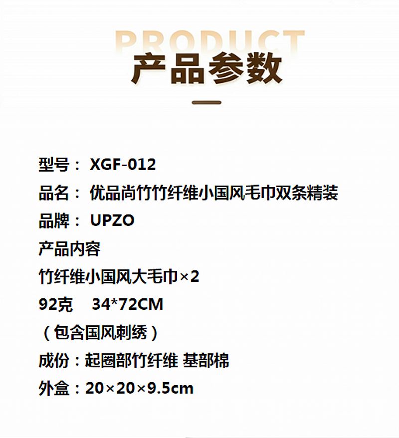 型号: XGF-012 产品内容 竹纤维小国风大毛巾×2 92克 34*72CM (包含国风刺绣) 成份:起圈部竹纤维 基部棉 外盒:20×20×9.5cm 精选竹纤维材质 结合国风刺绣 优质好礼