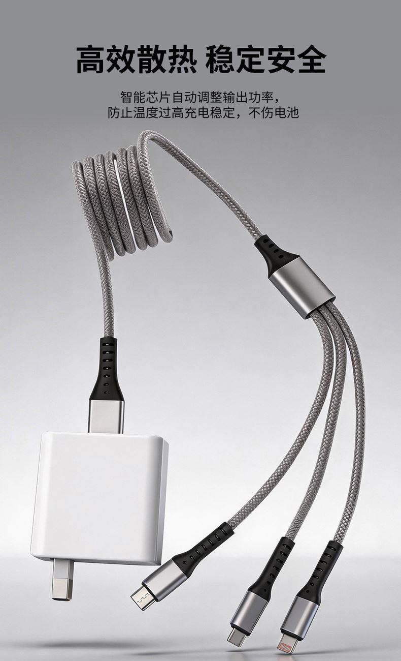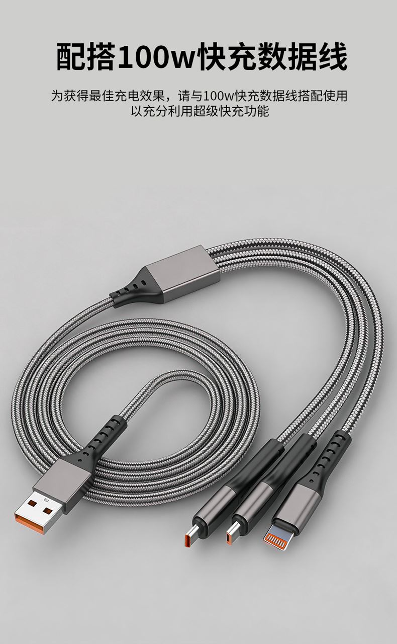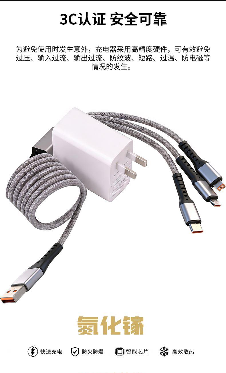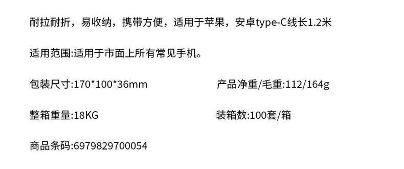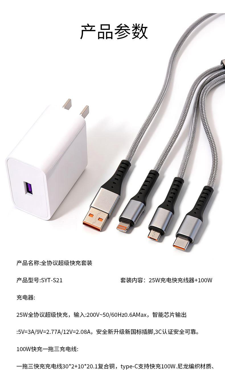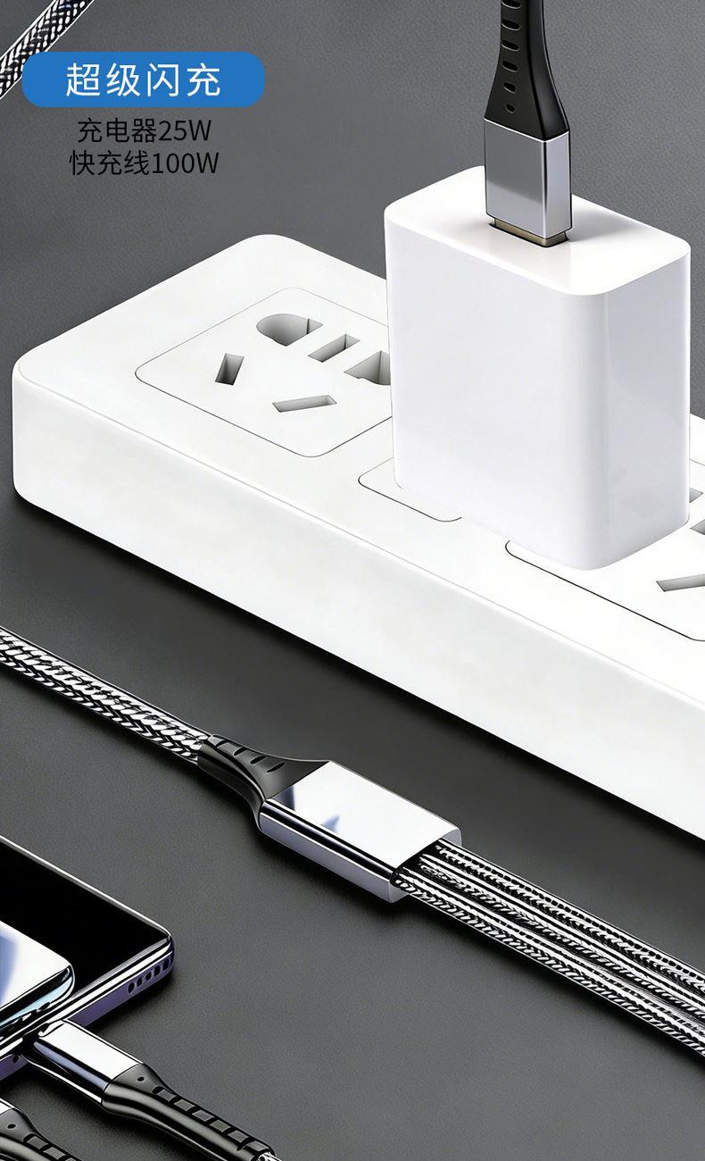 充电器: 25W全协议超级快充,输入:200V~50/60Hz 0.6A Max,智能芯片输出:5V=3A/9V=2.77A/12V=2.08A,安全新升级新国标插脚,3C认证安全可靠。 100W快充一拖三充电线: 一拖三快充充电线 30*2+10*2 0.1复合铜, type-C支持快充100W,尼龙编织材质、耐拉耐折,易收纳,携带方便,适用于苹果,安卓type-C线长1.2米,适用范围:适用于市面上所有常见手机。