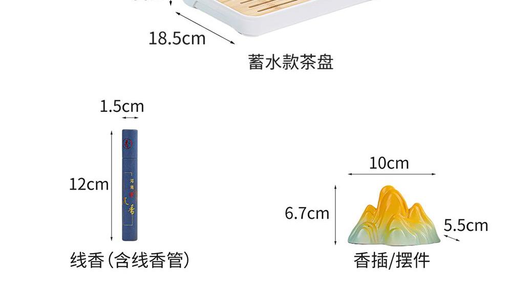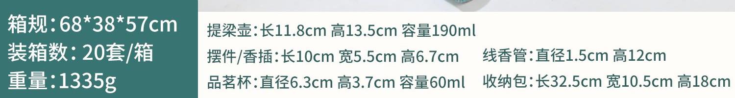 壶:11.8*13.5厘米 190ml 香插:10*6.7*5.5厘米 品茗杯:6.3*3.8厘米60ml 礼盒:32.5*10.5*18厘米 天然矿物釉,高温烧制无铅镉 ,精挑原料细筛瓷土,搭配礼盒包装,自用赠礼两宜,品质保障,甄选好礼。
