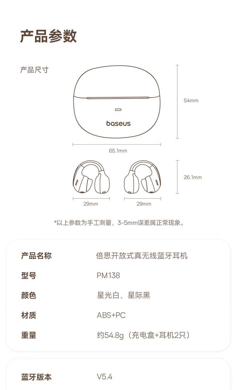 型号:PM138 材质:ABS+PC 颜色编码:星际黑A00083500122-00 星光白A00083500222-00 产品尺寸:6.5*2.9*5.3CM 包装尺寸:13*3.5*8.5CM 单品重量:约194g 电池容量:耳机50mAh 充电仓600mAh 充电时间:约1.5小时(线充) 蓝牙版本:蓝牙5.4 传输距离:约10M 适用设备:具有蓝牙功能的播放设备; 气囊鱼骨创新舒适防掉落; IPX7防水等级,无忧运动体验; 10.8mm定制三强磁铁低音喇叭; AI自适应低音增强算法; 四麦环绕型ENC通话降噪; 40小时超长续航,没有续航焦虑。