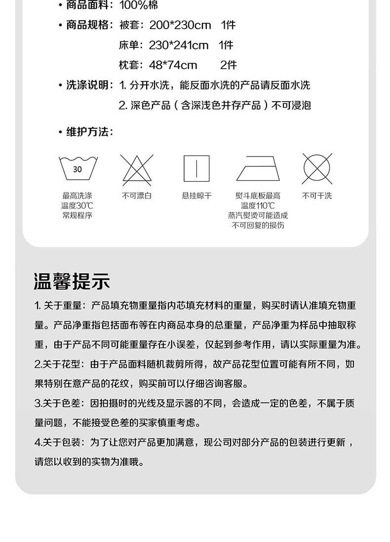 规 格 :200*230cm 被 套 :200*230(cm)*1 被 单 :230*241(cm)*1 枕 套 :48*74(cm)*2 面 料 :棉 包 装 :礼盒包装 海风拂面,蓝天白云作伴,此刻的心情仿佛与大海融为一体,波澜壮阔。脚下细沙柔软,留下一串串足迹,指向美好的远方。在海边游玩,感受大自然的无尽魅力,尽享悠长假日