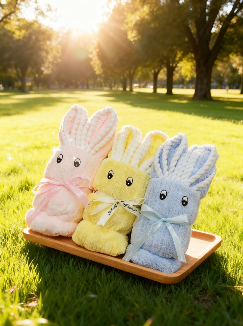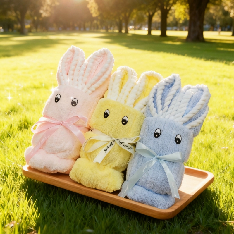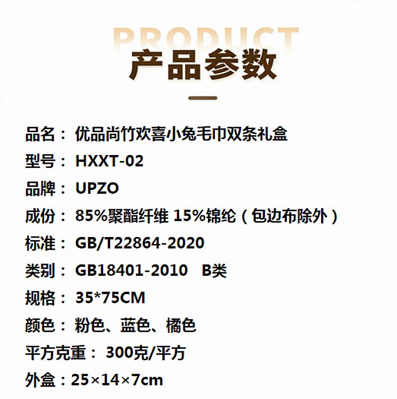 型号: HXXT-02 成份: 85%聚酯纤维 15%锦纶(包边布除外) 标准: GB/T22864-2020 类别: GB18401-2010 B类 规格: 35*75CM 颜色: 粉色、蓝色、橘色 平方克重: 300克/平方 外盒:25×14×7cm 升级款小兔 波浪纹面料 高平方克重 精美包边工艺