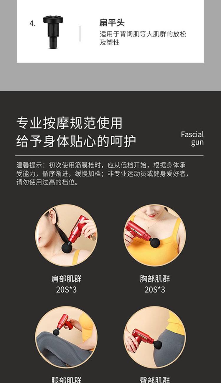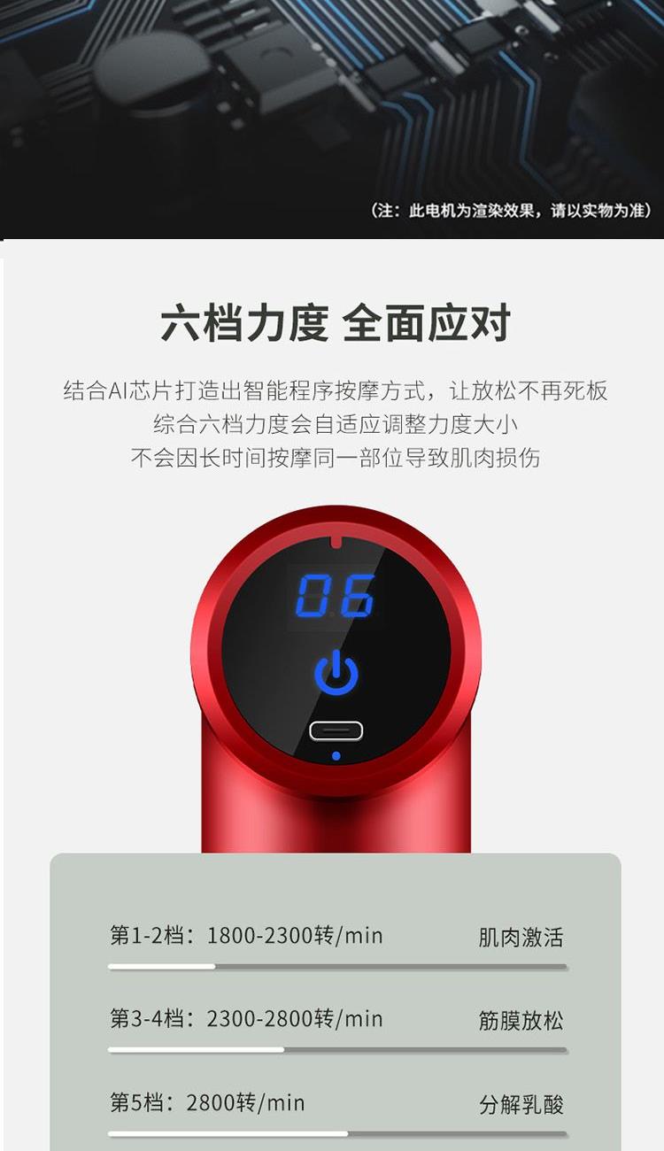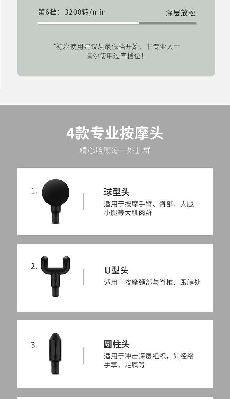 产品规格: 1、充电接口:type-C接口 2、重量:约600g3、功率:25W 4、档位模式:1-6档 1、精致小巧,居家日用, 外出携带都无惧挑战,随 时享受; 2、TYPE-C接口,同充电器直充,随 时随地补充电量,也可 使用充电宝充电; 3、多档调节,随心所欲调节,内置创新降噪电机力度强劲深层舒缓肌肉疲劳; 4、多款按摩头专业级呵护,升级四大按摩头细心呵护每一处肌群; 5、采用静音降噪技术,内置创新降噪电机,不扰他人安静得只剩下呼吸声。