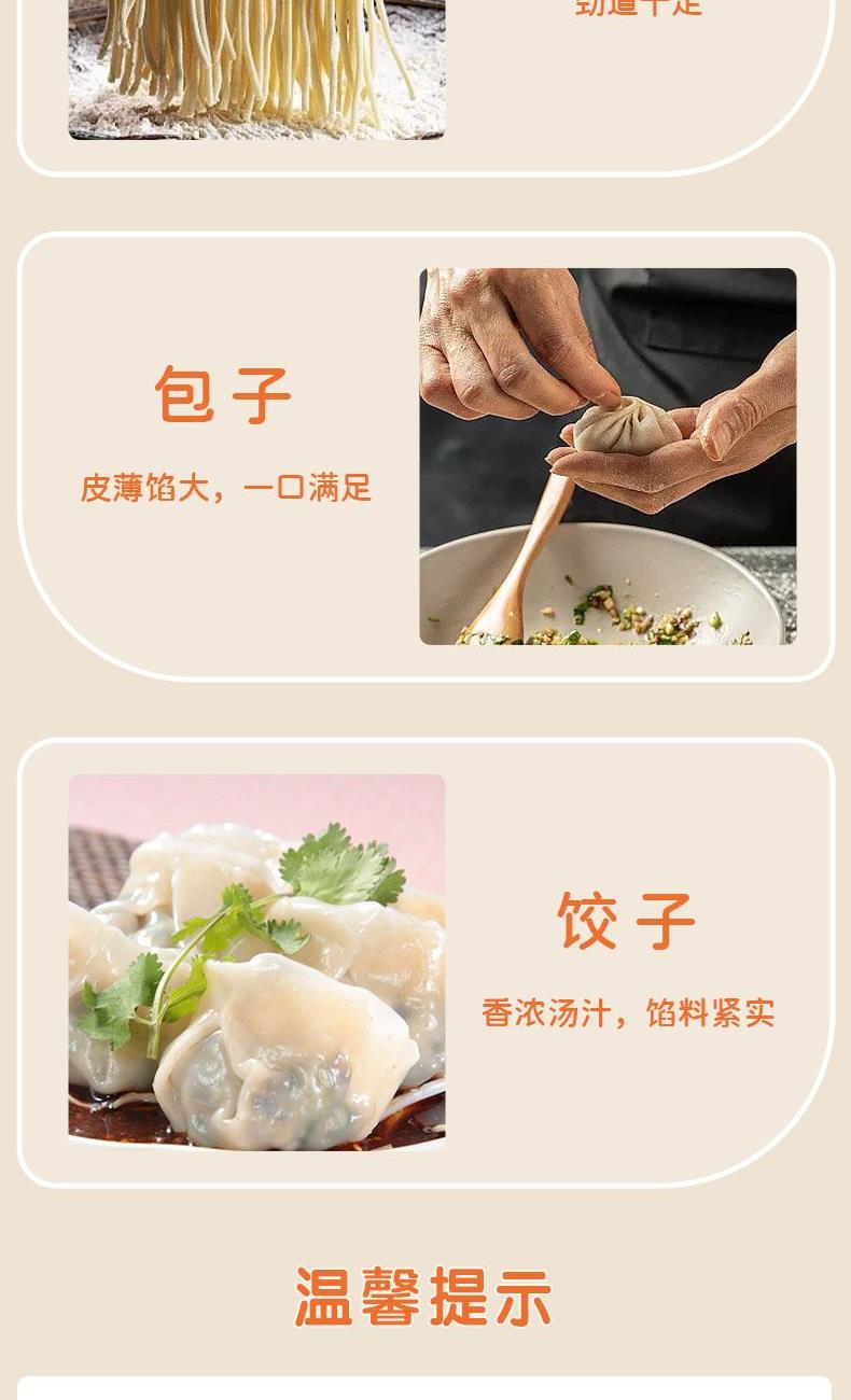 产品信息 品 名:富硒大小麦粉(风吹稻香·天下粮仓) 规 格:1kg 20袋/箱 包 装:单层包装 产品特色 1、精选小麦品种,采用现代制粉技术,全封闭研磨筛理系统加工而成; 2、适合家庭面食制作:做饺子、面条、馒头、包子、烙饼、面包等; 3、富硒的,更营养;面粉自然白净,粉质细腻,筋度适中,延展性高
