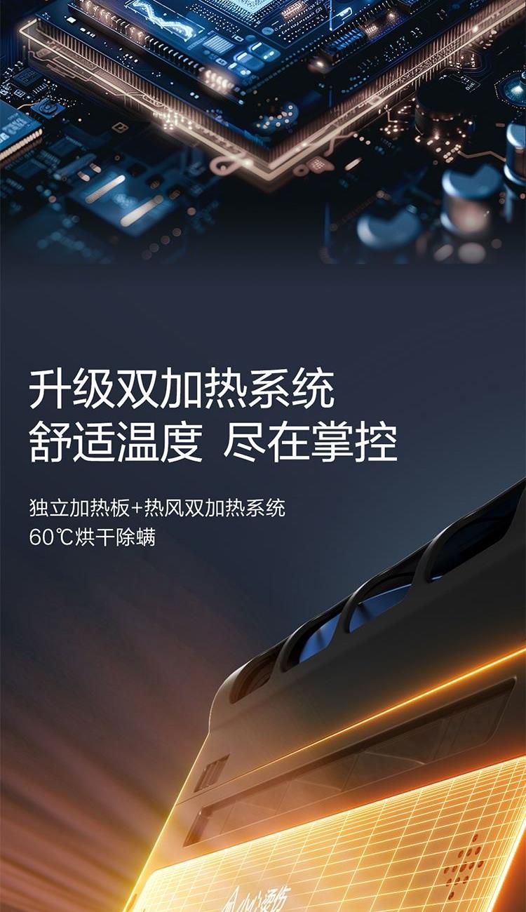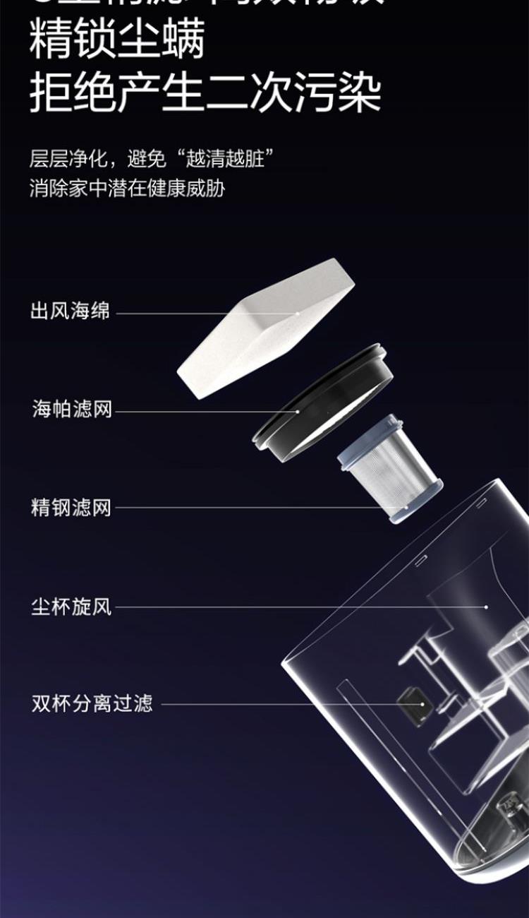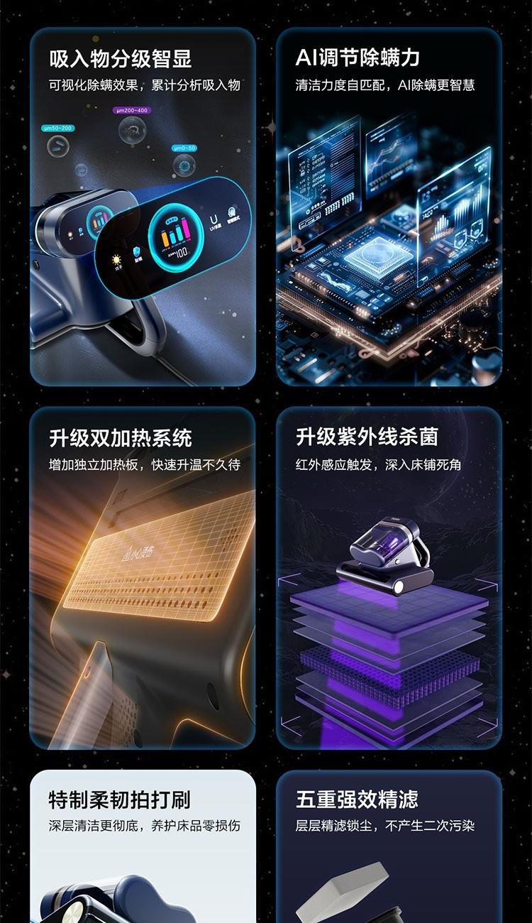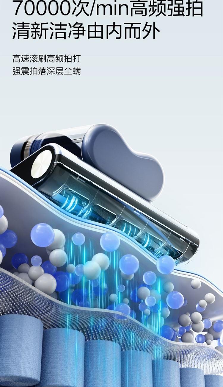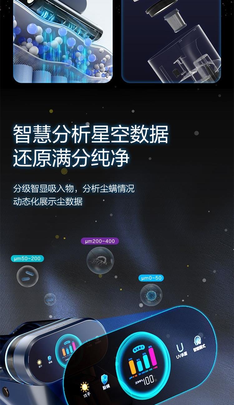 集尘容量: 0.5L 拍打频次 :70000次/min 额定功率: 650 w 真空度 :16KPA 加热方式 :热风+金属面板 电源线 :5m 过滤方式: 海帕+不锈钢网罩 海绵 1.除螨效果清晰可见:屏幕吸入物分级显示+整体洁净度显示+环形指示灯显示 2.烘干快捷舒适:60℃恒温控制,独立加热板+热风双加热系统,加热板触摸把手自动开启