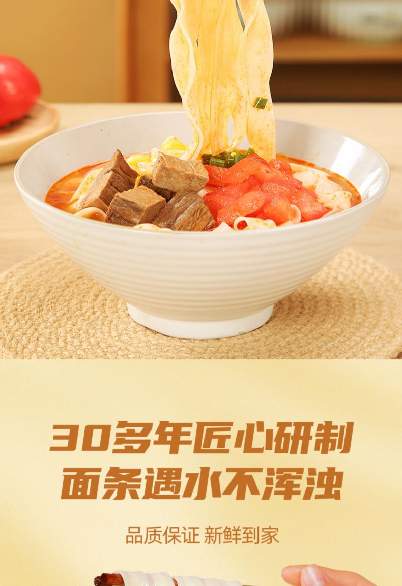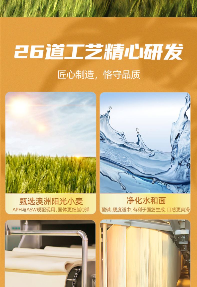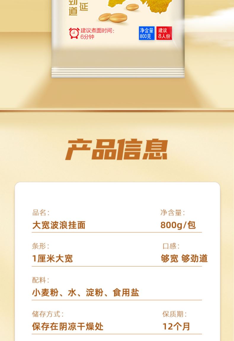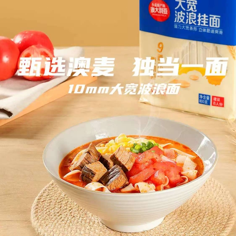 产品规格: 大宽波浪 800g*4包 选用澳洲进口小麦粉 3蒸3醒,九道压延 中高温慢速烘烤, 立体Q弹柔滑