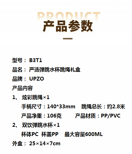 型号: B3T1 产品内容 1、 炫彩跳绳×1 手柄尺寸:140*33mm 跳绳总长:约2.8米 产品净重:115克 产品材质:PP/PVC 2、 双饮弹跳水杯×1 杯体PC 杯盖PP 容量600ML 双饮弹跳水杯 三段式开启方式 (可吸管小饮 可弹跳直饮 亦可旋转开启畅饮)品质优异 杯体中间搭配隔热软胶设计 杯盖结合PP提手设计 跳绳双层手柄设计 体感更好 设计清爽 材质优异