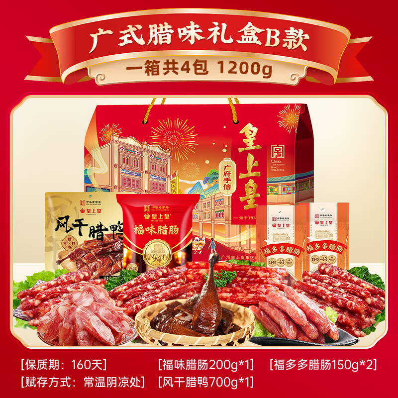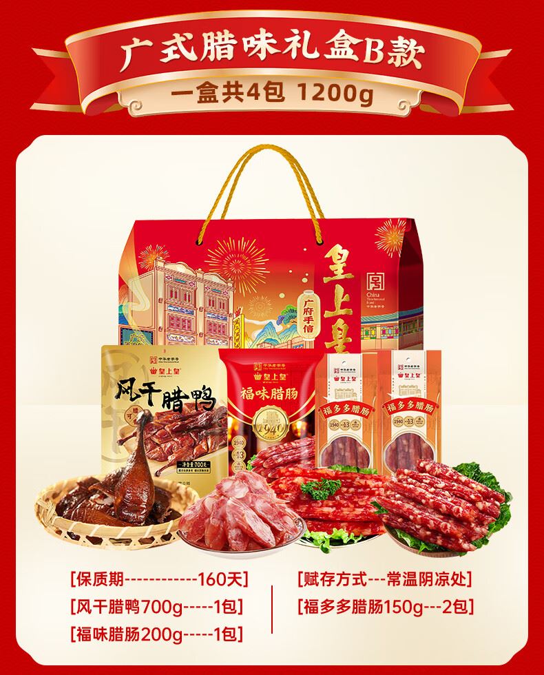 产地:广东 特产品类:广式腊肠 口味:原味 食用方法:烹饪食用 加工工艺:烘干 保质期:120天 内配:风干腊鸭700g*1 福多多腊肠150g*2 三鲜腊肠200g*1 广式腊味礼盒*1