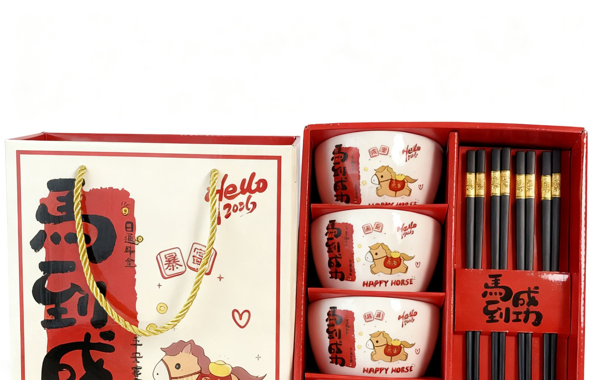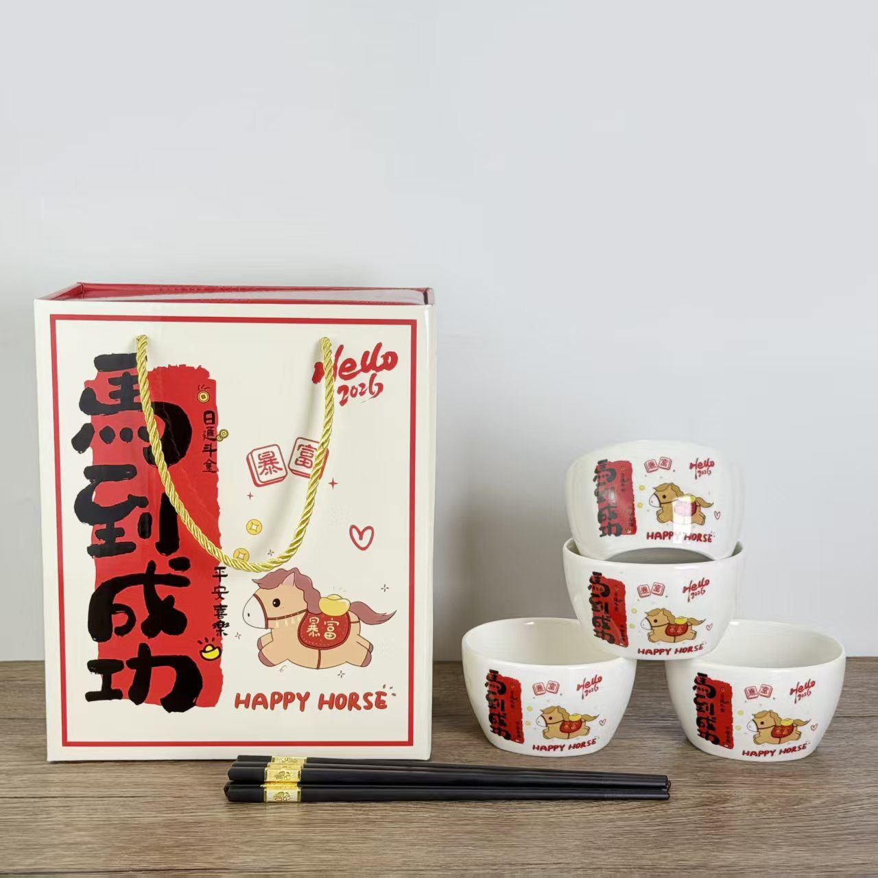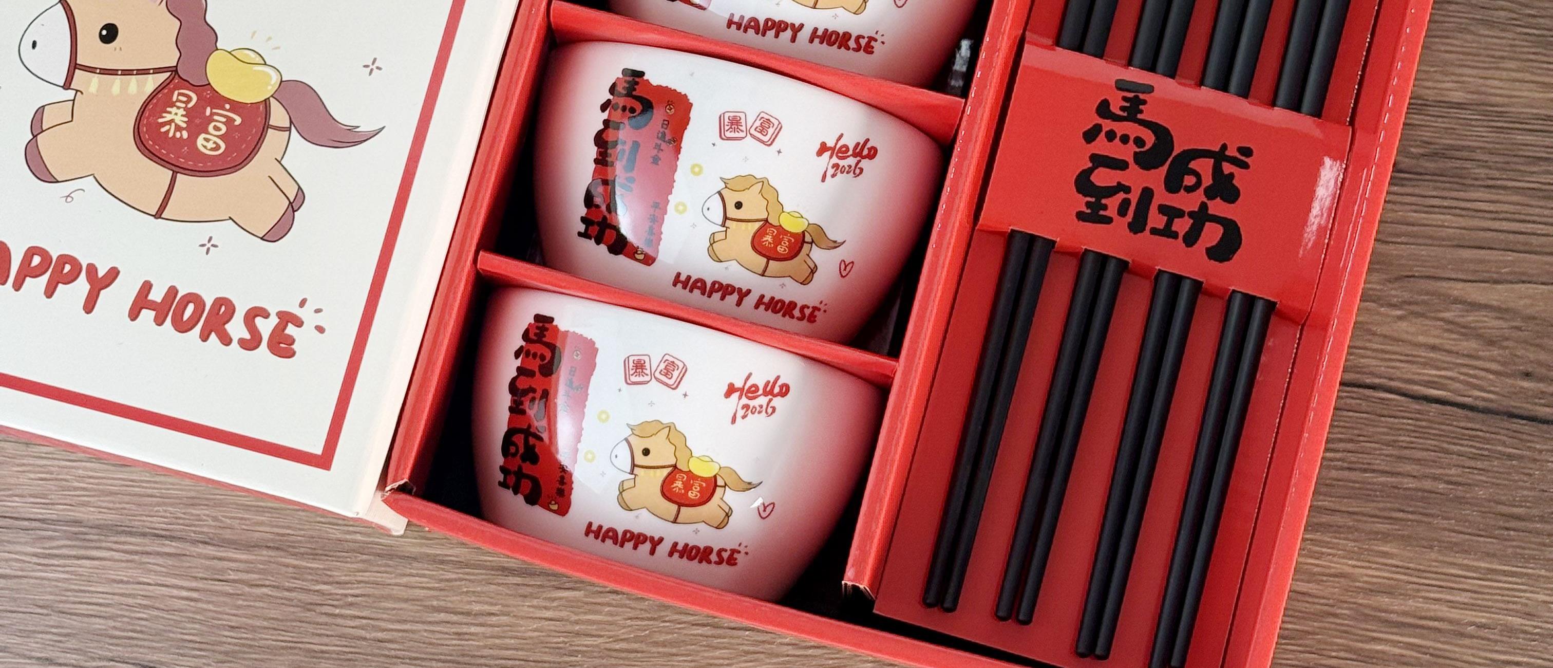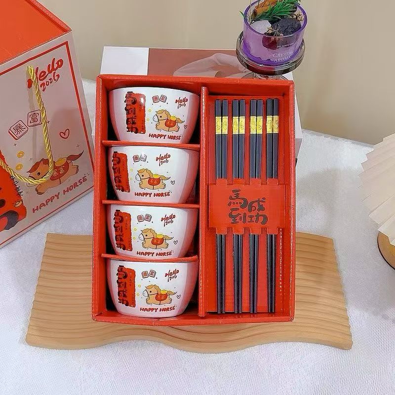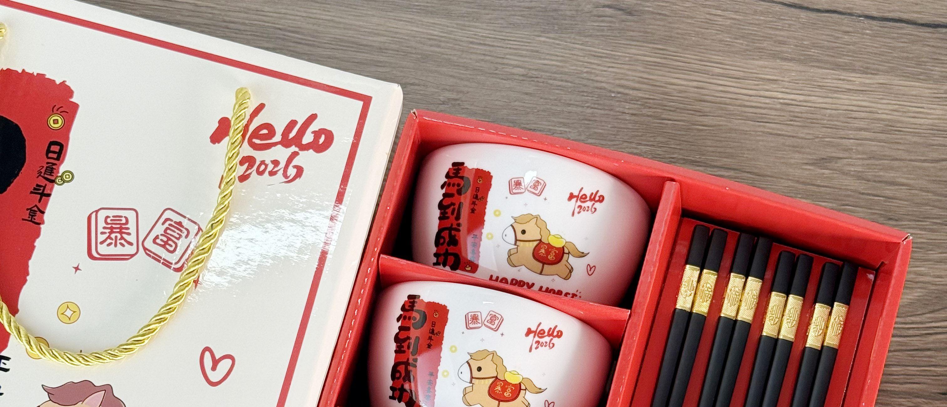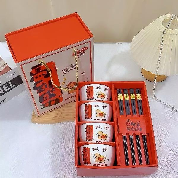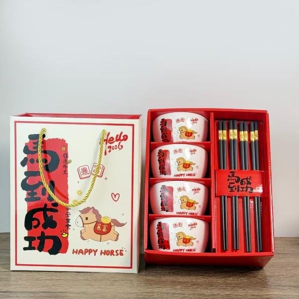 礼盒尺寸:24*13*27cm 外箱尺寸: 62*45*55CM 配 法:4个4.5寸碗+4双筷子 1.2kg 材 质:新骨瓷+密胺金属筷 包装方式:礼盒包装 “马到成功”+“暴富平安”的祝福直接刻在碗上,4碗4筷的配置,自己用讨个好彩头,送朋友更是心意满满~红礼盒一拎,颜值仪式感全拉满!新的一年,就让每一餐都吃出自带好运的快乐✨
