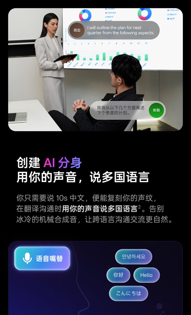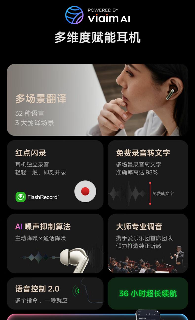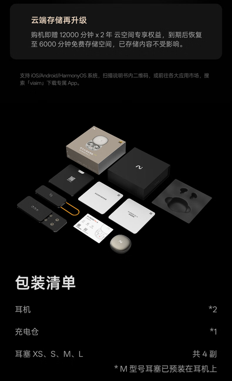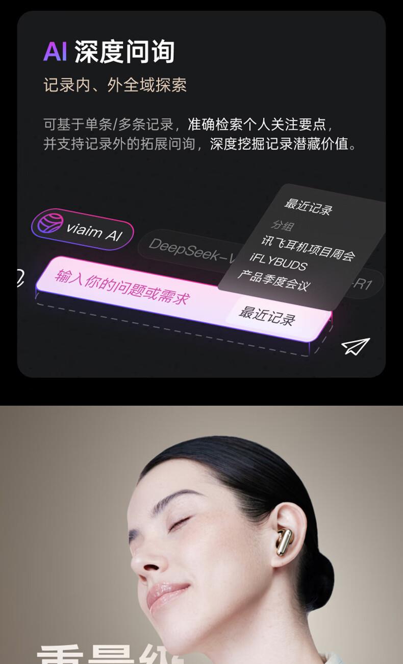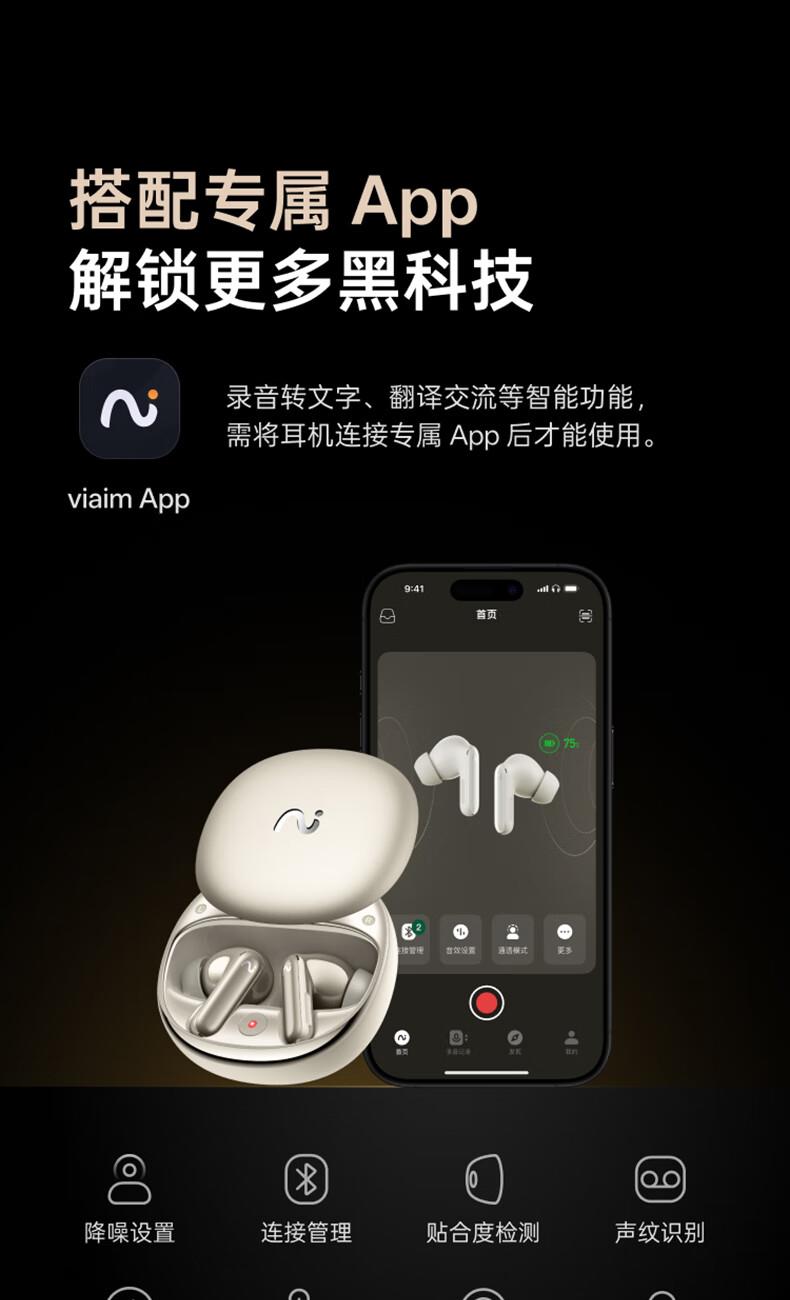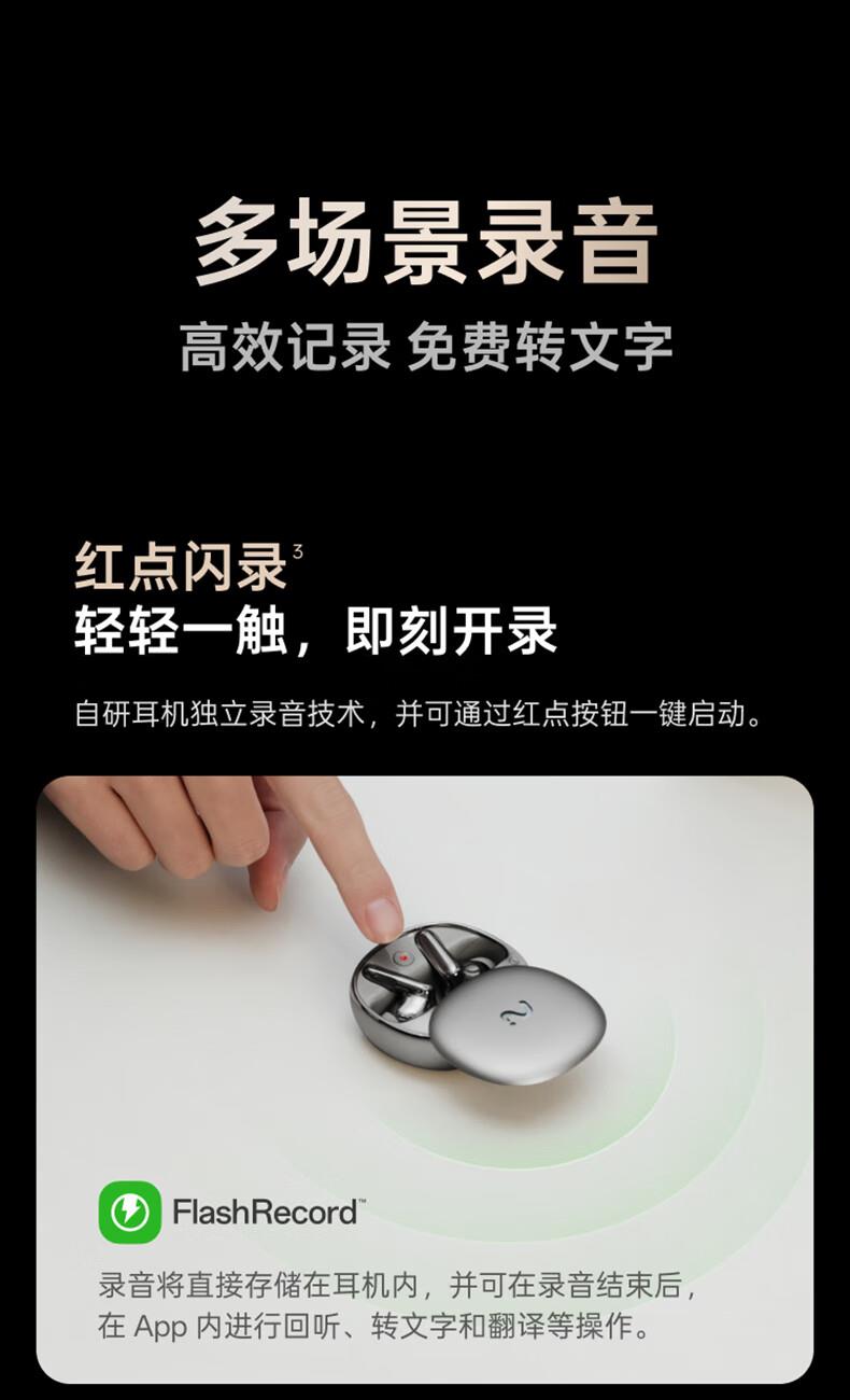 1、大师调音,殿堂音质:爱乐乐团联合调音,Hi-res金biao音质认证,支持LHDC高清音频解码 2、语音控制2.0:新增降噪切换、录音语音控制,搭载viaim Al与DeepSeek-R1双模型,支持脑图、离线翻译等功能 3、全镜面感耳机机身,充电仓轻薄便携 4、12000分钟云空间(其中6000分钟为2年有效) 5、面对面翻译,耳机方无需操作耳机