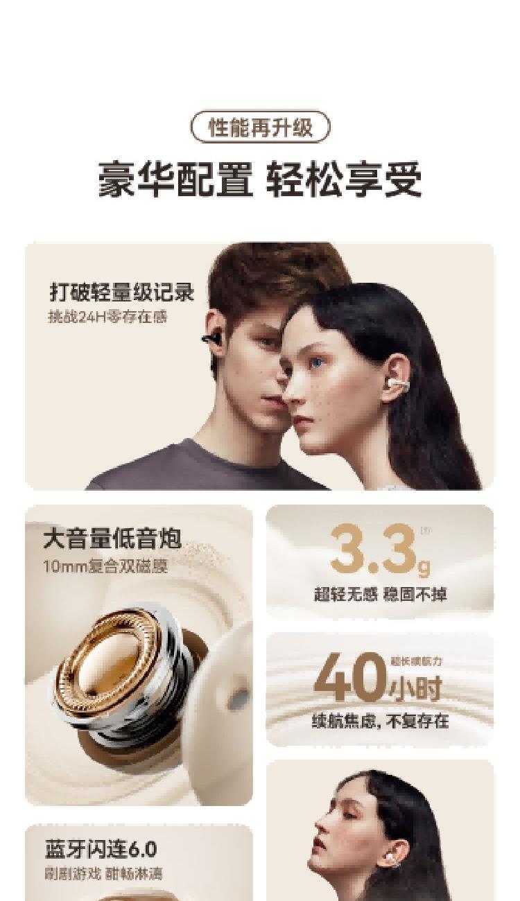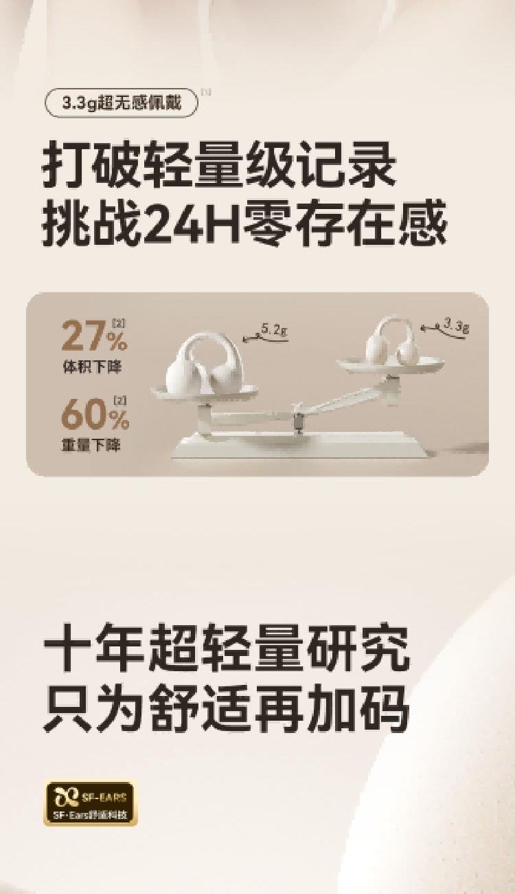 · 3.3g超无感佩戴,上耳即无感,多久都不累,轻便到几乎忘记它的存在;