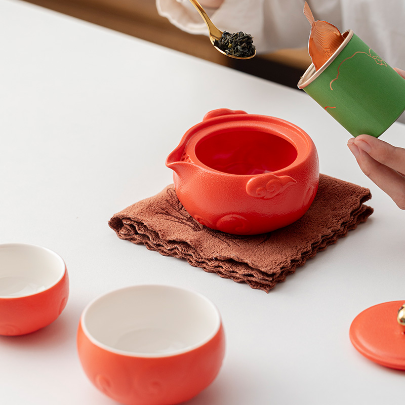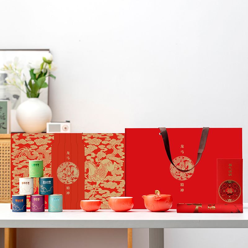 产品配置:茶壶*1、客杯*1、主人杯*1、对联*1、红包*6、小罐茶*6(赠:大红袍、子君观音、云雾绿茶、正山小种、茉莉花茶、蜜香红茶各一罐)、浮雕烫金礼盒、礼袋