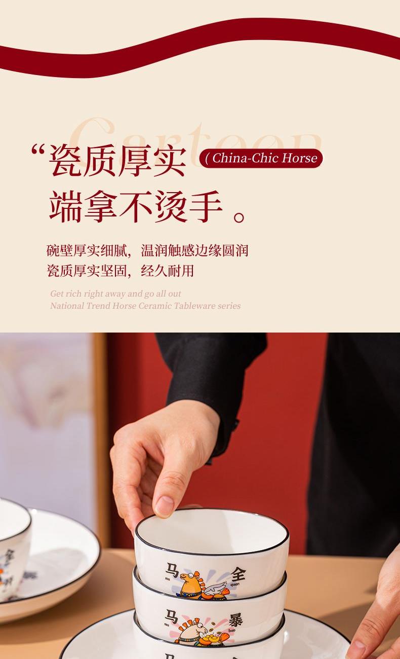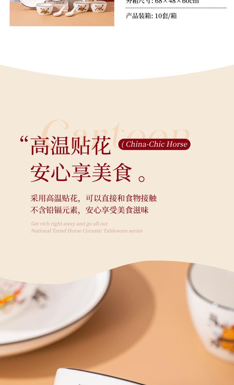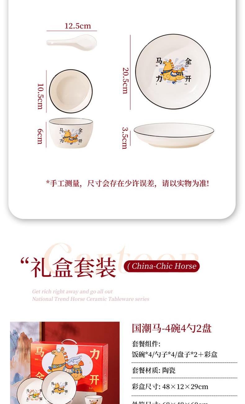 产品组成:整套=4碗4勺+2盘 产品材质:强化瓷 产品规格:陶瓷碗=口径10.5cm,高度6cm;盘子直径20.5cm, 高3.5cm;二针勺=长12.5cm 彩盒尺寸:48×12×29cm 外箱毛重:9头19公斤,10头22公斤 外箱尺寸:68×48×60cm --------------“活力十足+财运满满”双buff叠满的礼品套装! 「翼马踏燕」纹样灵动鲜活,仿佛骏马振翅带风,踏出满室生机;不是老气的纹样,反而有点卡通新国风那味儿,摆桌上直接拉满视觉张力;让人新的一年活力十足,马力全开。 「元宝驮马」图案精致讨喜,圆润金元宝衬着矫健骏马,一眼见财气。马上驮的金元宝更绝,画得圆滚滚还带点小俏皮,像刚从“财富星球”运回来的,看着就超有范!!