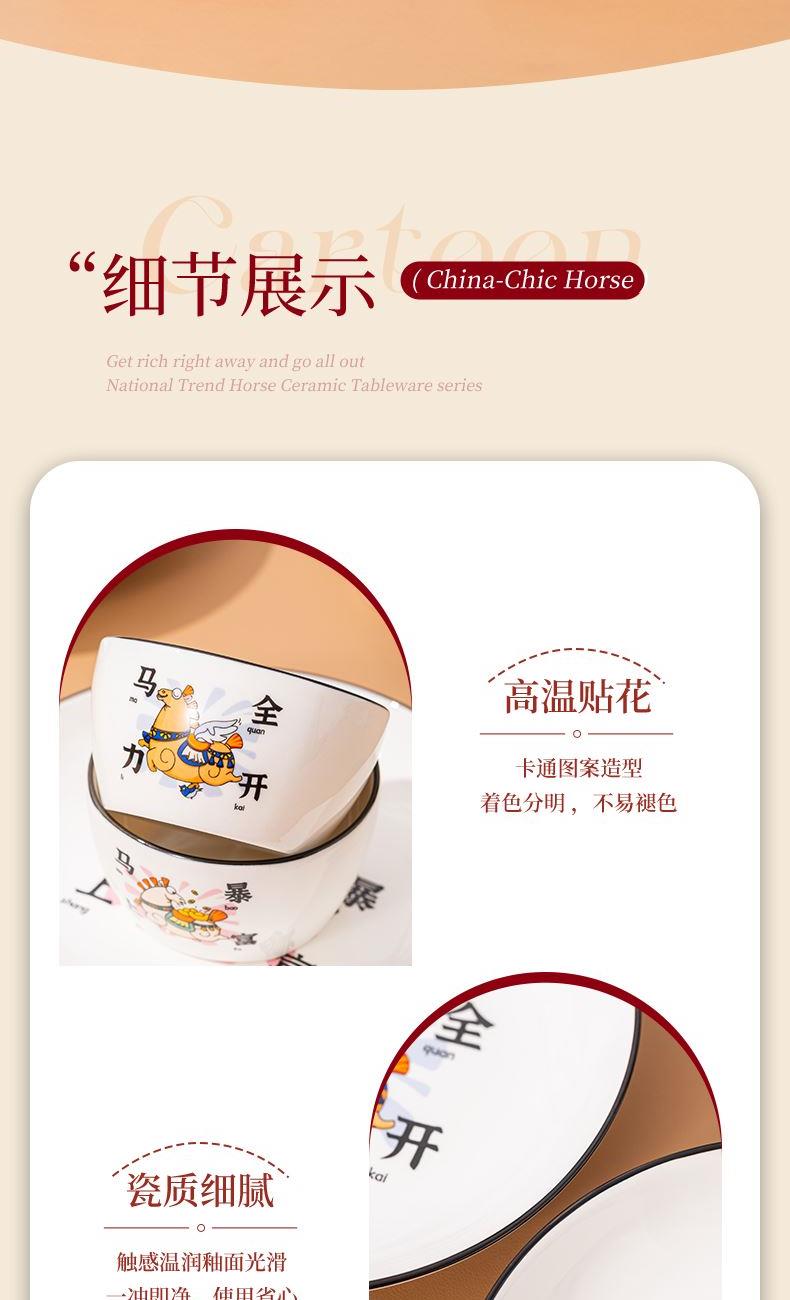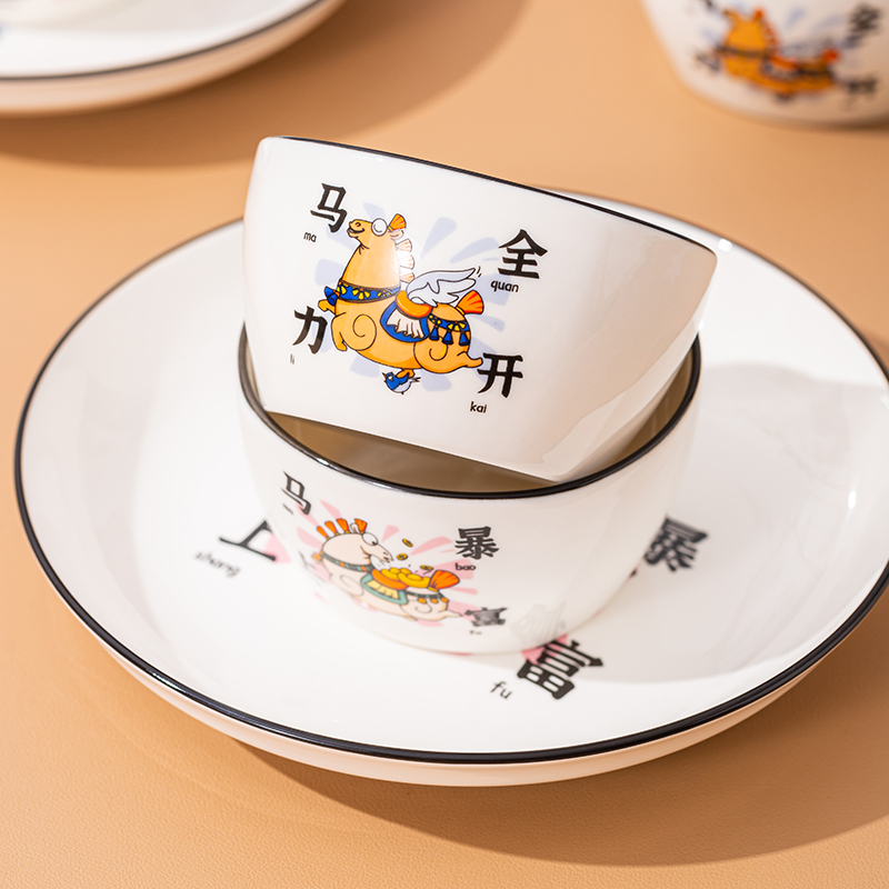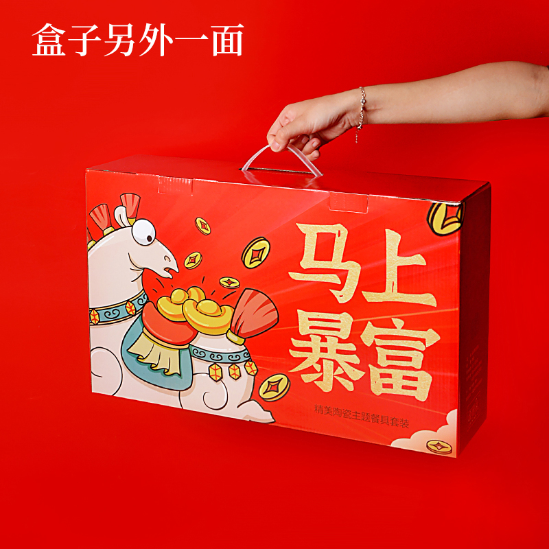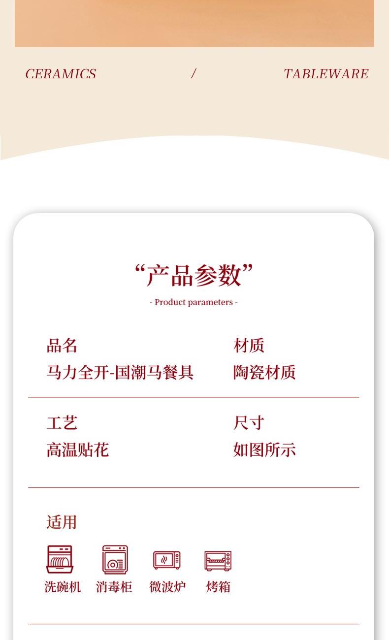 产品组成:整套=4碗4勺+2盘 产品材质:强化瓷 产品规格:陶瓷碗=口径10.5cm,高度6cm;盘子直径20.5cm, 高3.5cm;二针勺=长12.5cm 彩盒尺寸:48×12×29cm 外箱毛重:9头19公斤,10头22公斤 外箱尺寸:68×48×60cm --------------“活力十足+财运满满”双buff叠满的礼品套装! 「翼马踏燕」纹样灵动鲜活,仿佛骏马振翅带风,踏出满室生机;不是老气的纹样,反而有点卡通新国风那味儿,摆桌上直接拉满视觉张力;让人新的一年活力十足,马力全开。 「元宝驮马」图案精致讨喜,圆润金元宝衬着矫健骏马,一眼见财气。马上驮的金元宝更绝,画得圆滚滚还带点小俏皮,像刚从“财富星球”运回来的,看着就超有范!!