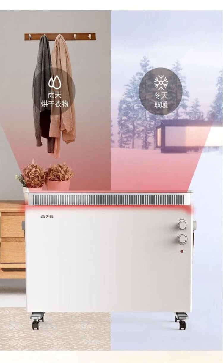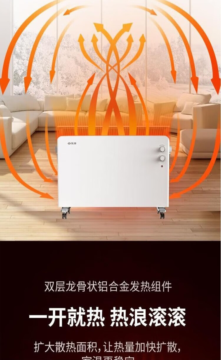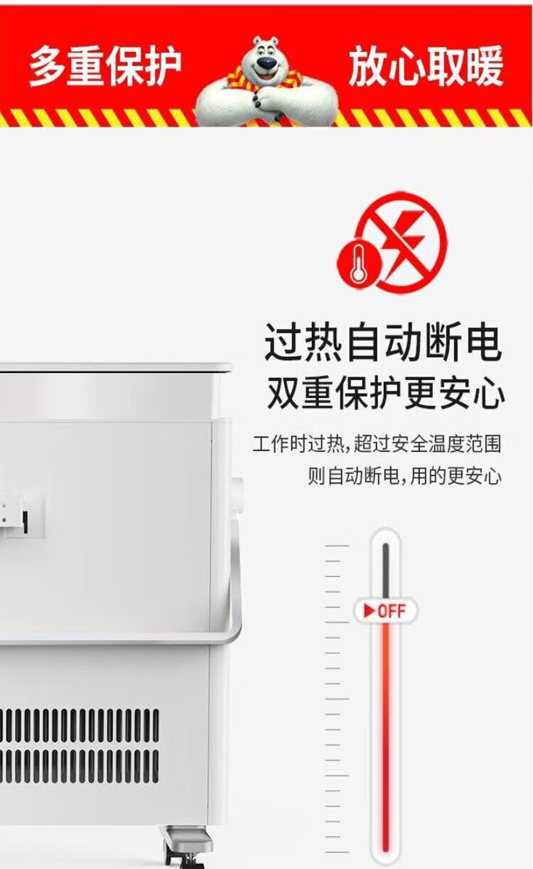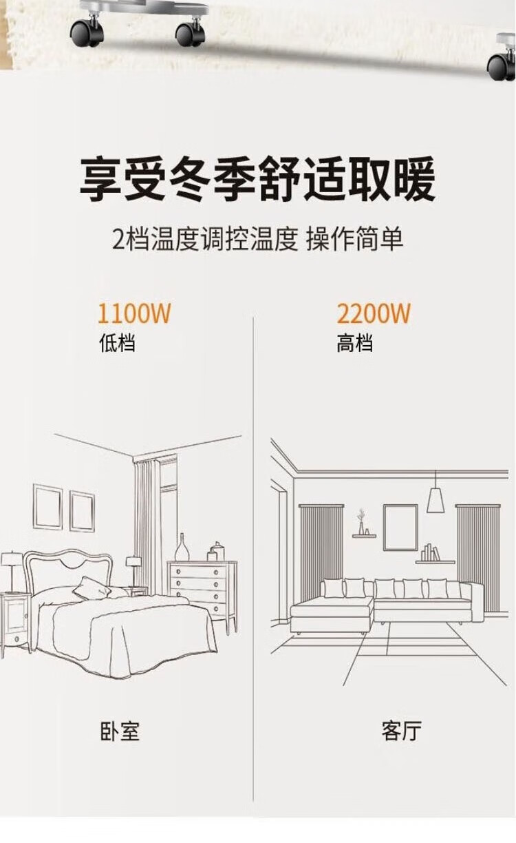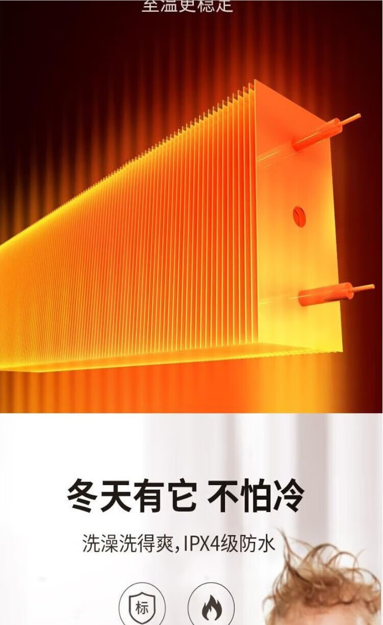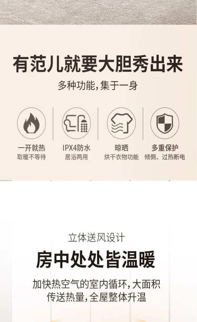 1.IPX4级防水,居浴两用 360°防溅水 2.即开即热 3.防水铝片发热体+碳纤维发热线 4.铝合金烘衣架,人性化设计,快干衣物 5.带脚轮脚板,移动更方便 6.弧形风道设计,加大出风口,加快热对流 7.倾倒自动断电,高温断电保护,安全更安心