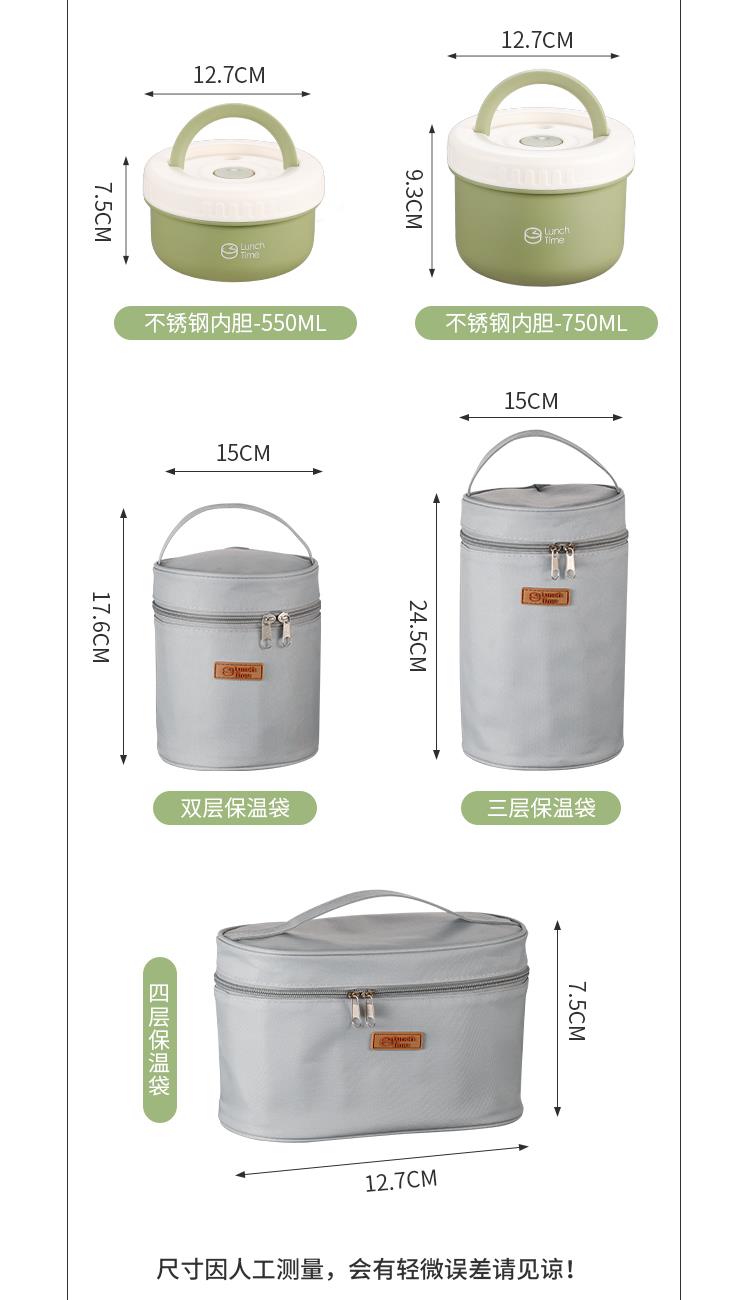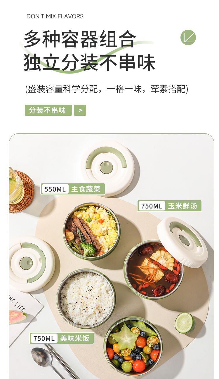 产品容量:三层1850ML 产品材质:304不锈钢 装 箱 数:三层16套 食品级304不锈钢内碗,健康安心每一餐; 一格一味,自由搭配,营养分隔不串味; 内外层分离设计,端拿防烫,保温效果更佳; 硅胶密封圈双重保护,有效防止汤水撒漏,搭配保温袋,户外露营/学生/上班族外出带餐更方便;