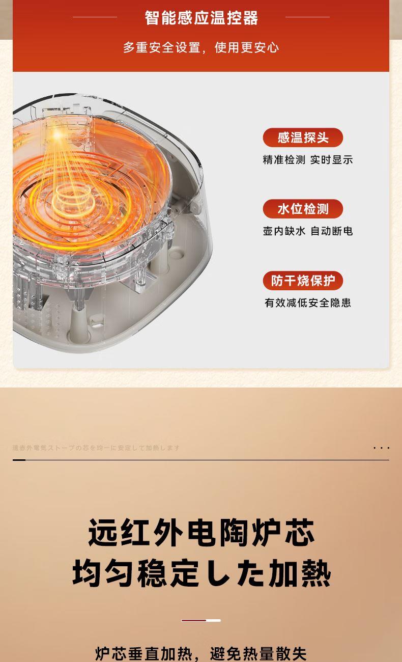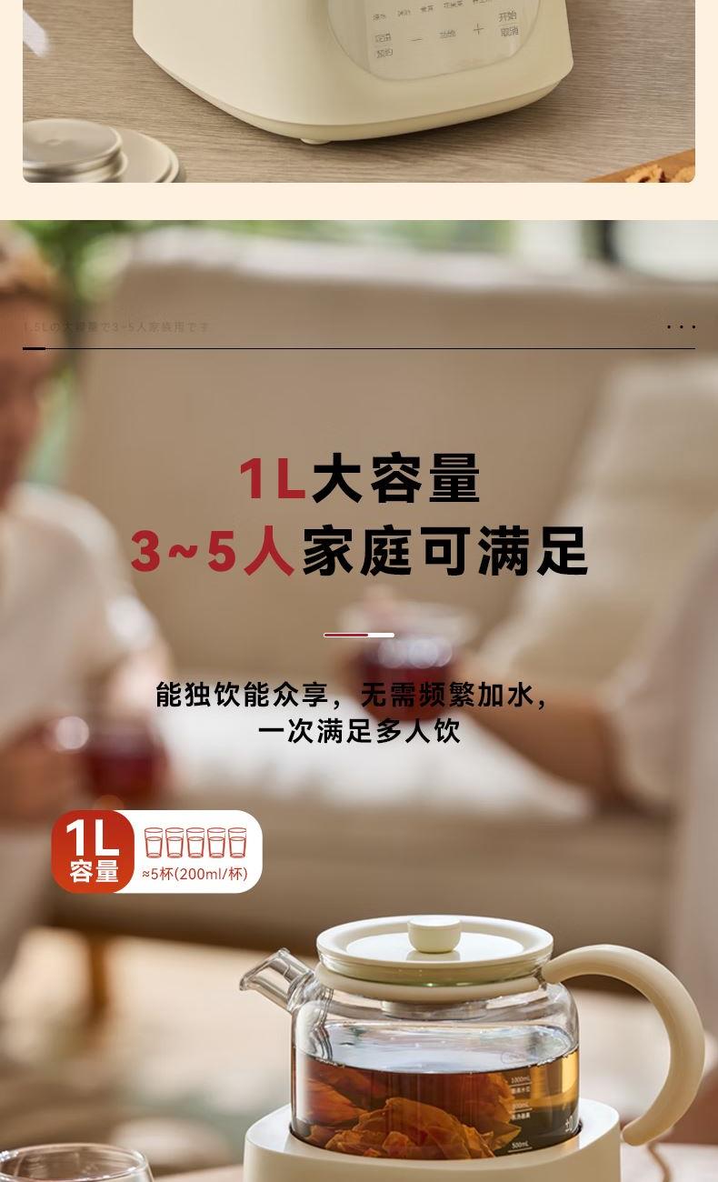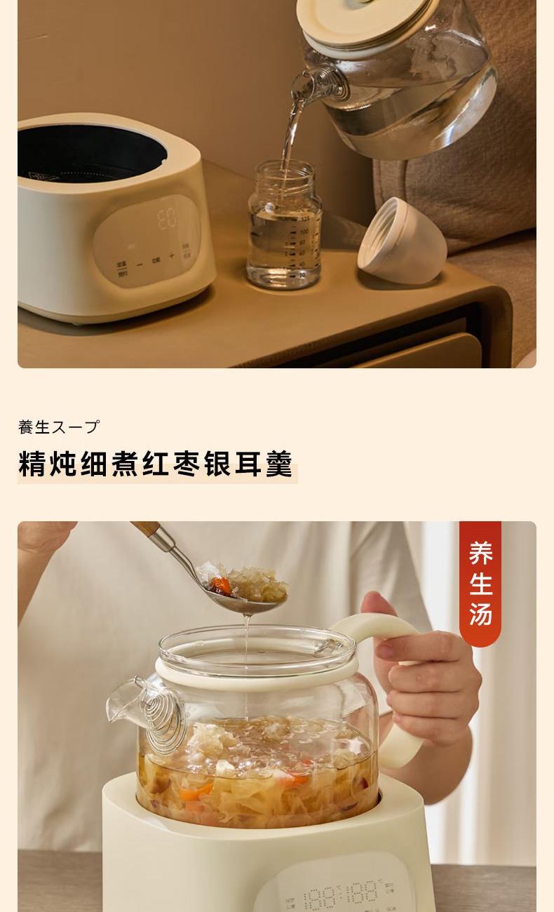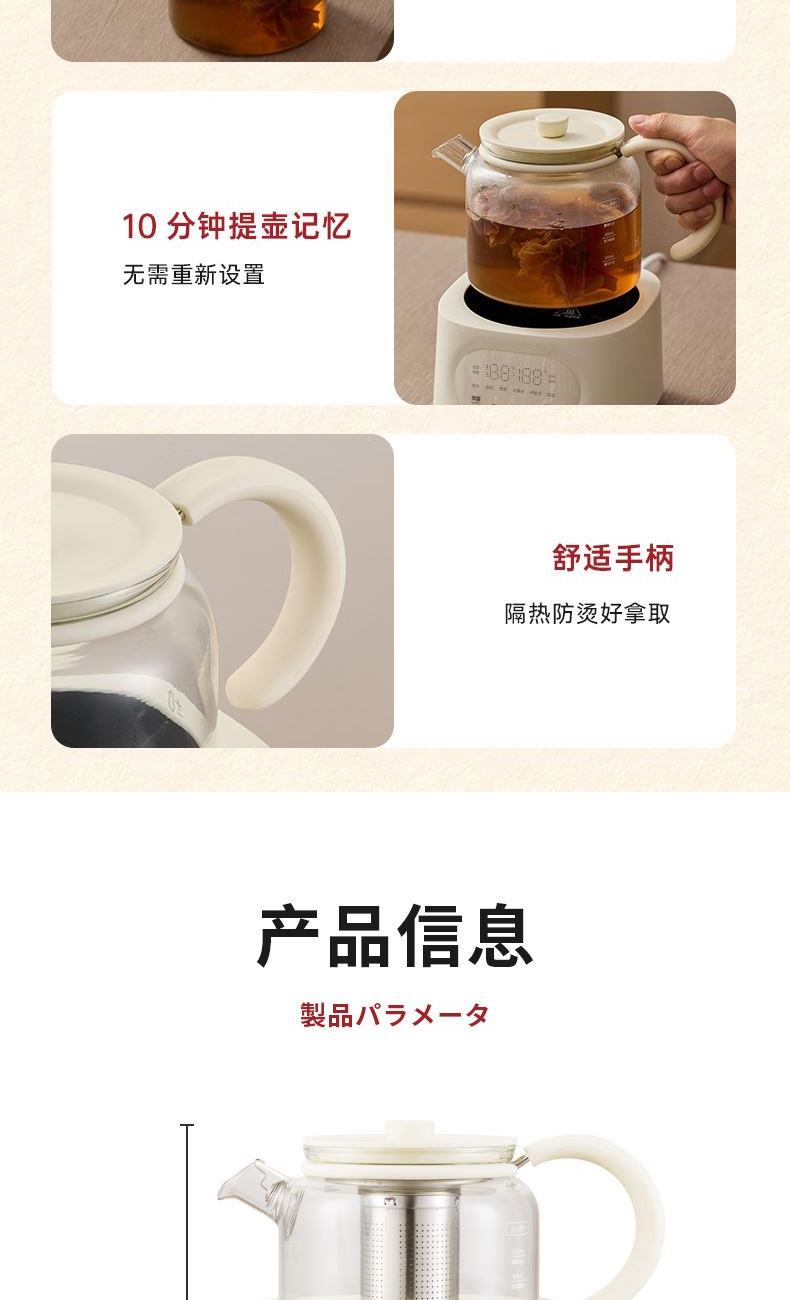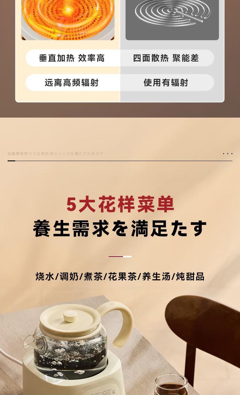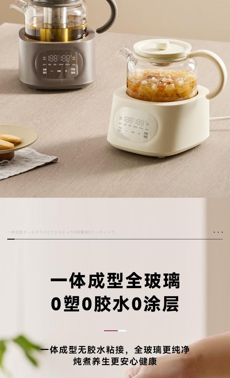容量1L 额定电压220V 额定功率900W 全玻璃一体 可拆上盖 发热盘涂层材质 0涂层 12小时长效预约,24小时自动保温 5大花样菜单,养生需求全满足 远红外电陶炉芯,升温更快,加热更均匀 加厚高硼硅玻璃,无磨底,无惧骤冷骤热