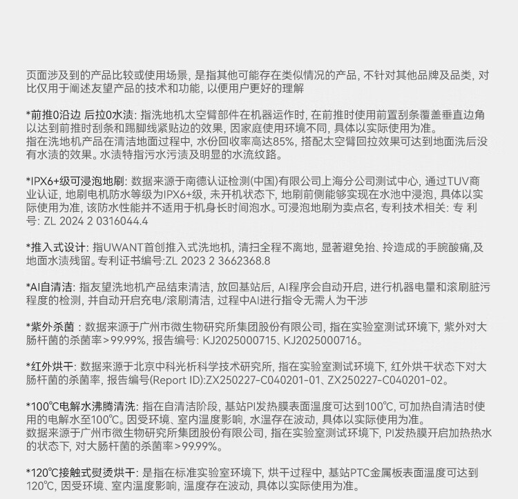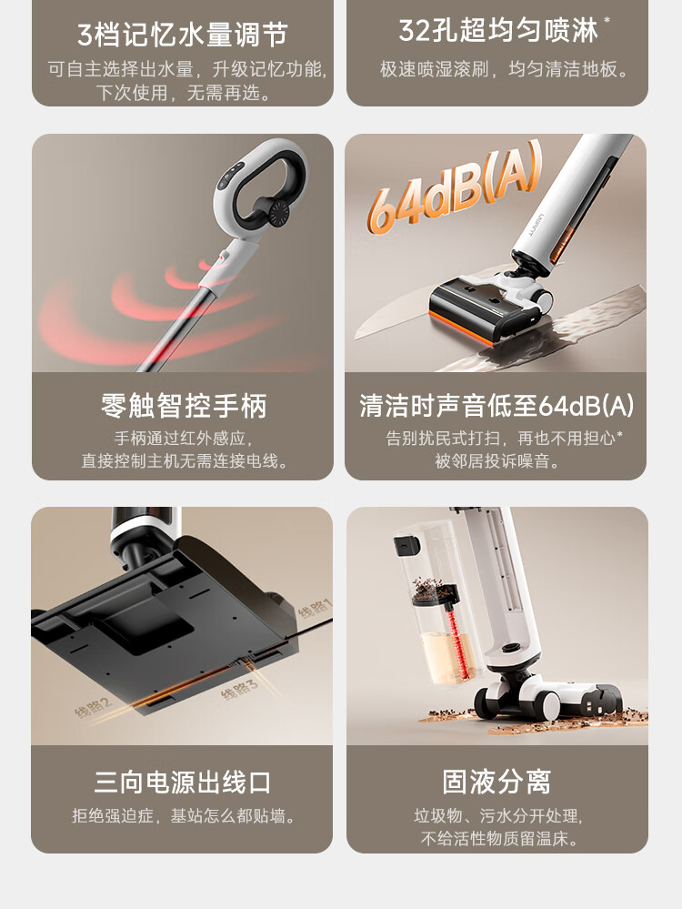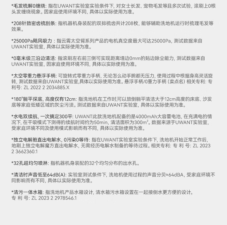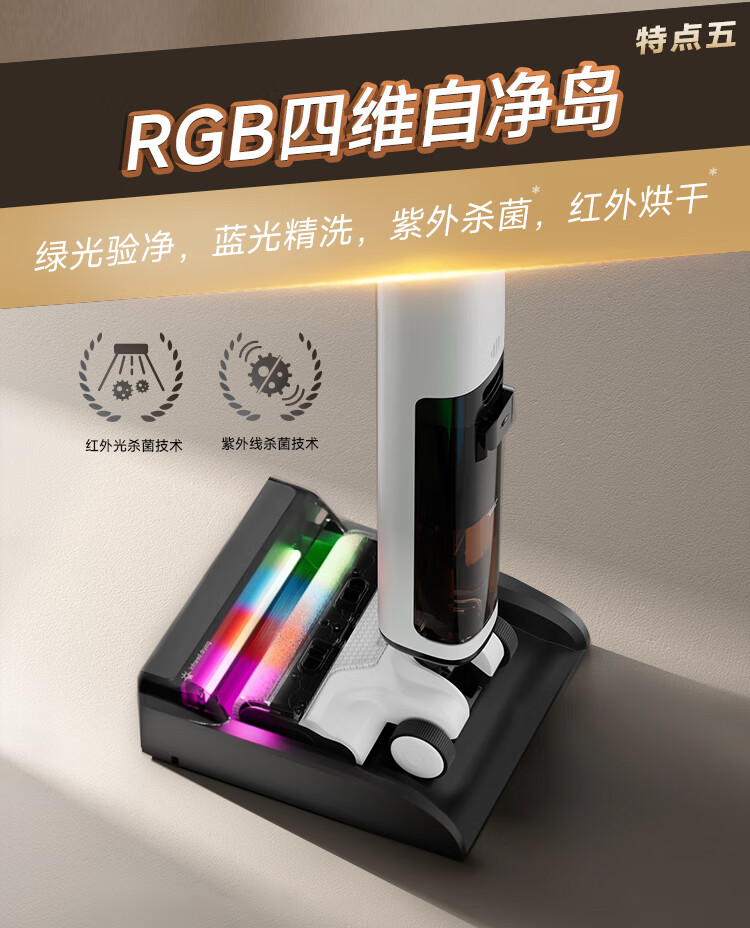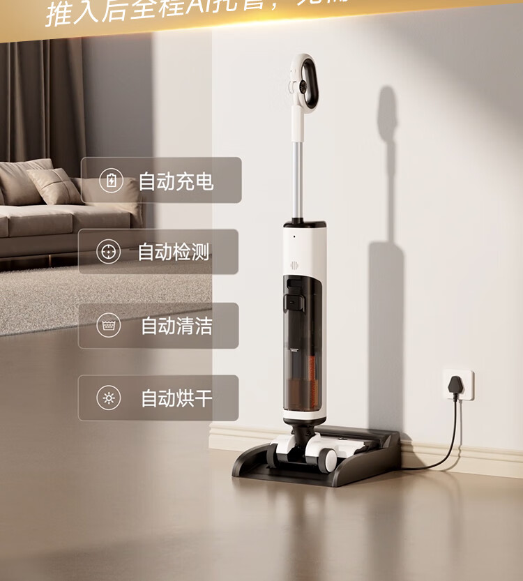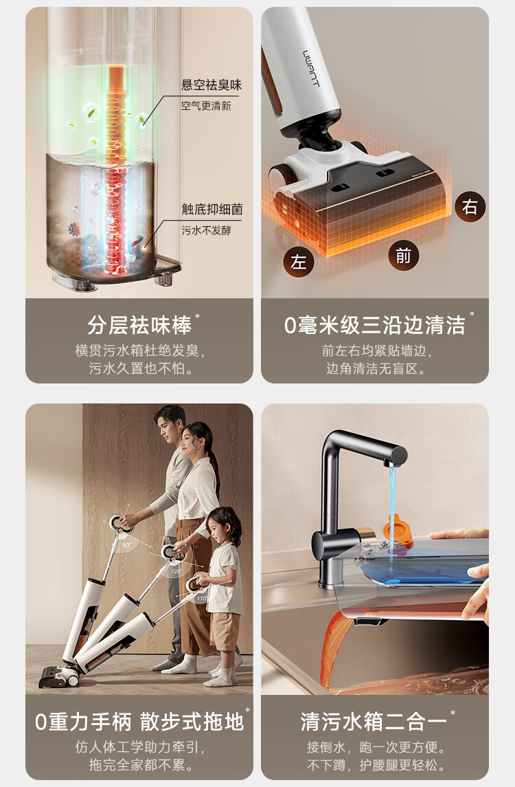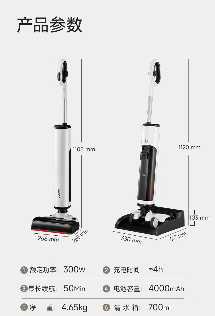 产品参数: 额定功率:300W 续航:50Min 净重:4.65kg 充电时间:4h 电池容量:4000mAh 清水箱:700ml 产品卖点: 分层祛味棒,横贯污水箱杜绝发臭,污水久置也不怕。 0毫米级三沿边清洁,前左右均紧贴墙边,边角清洁无盲区。