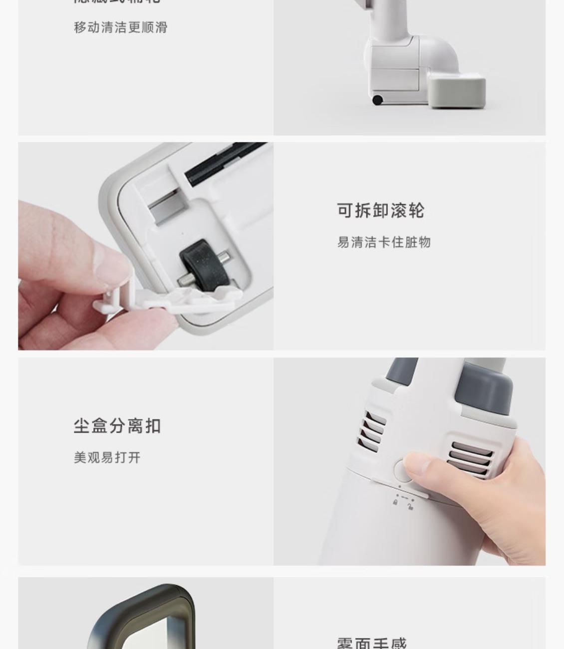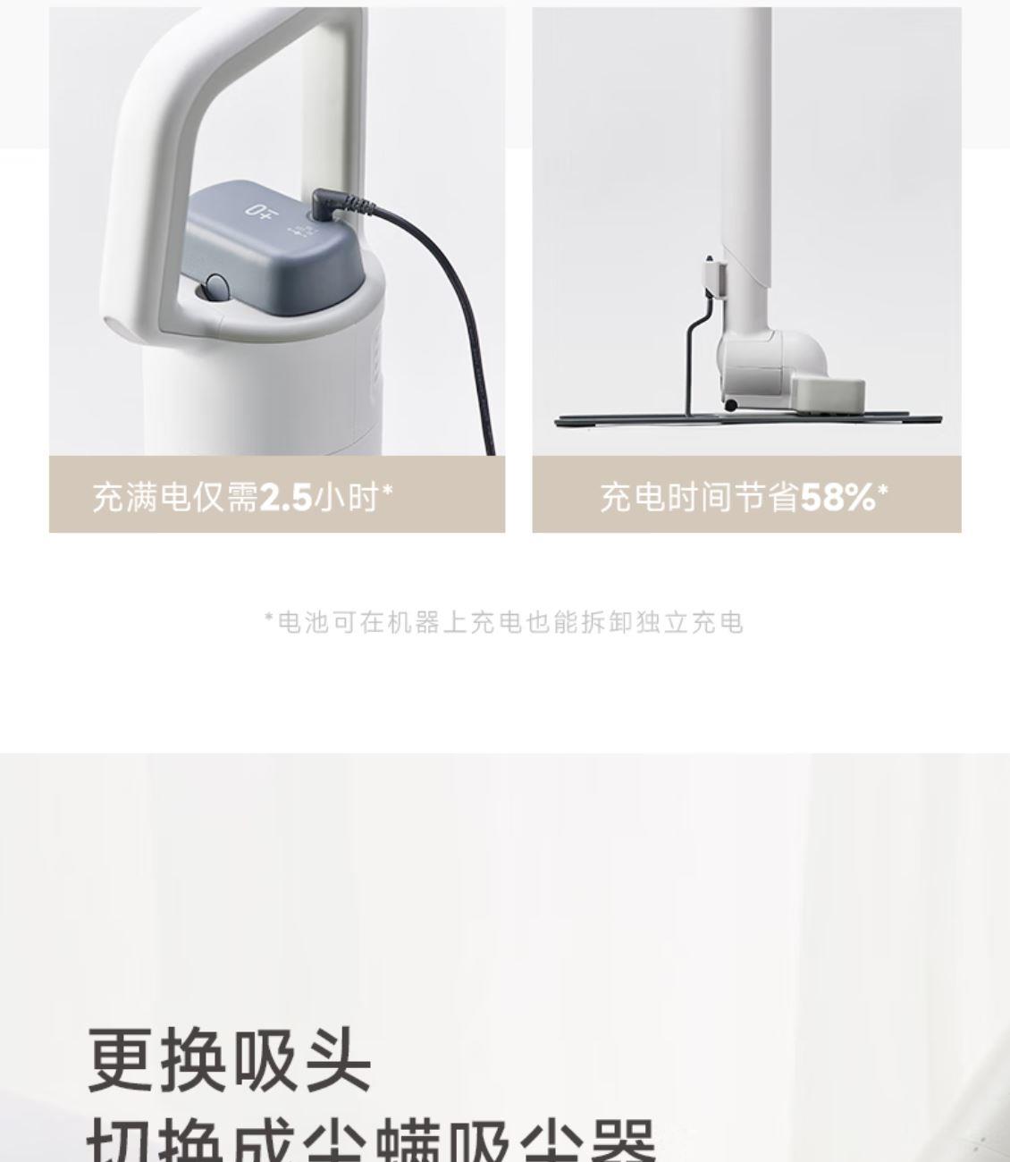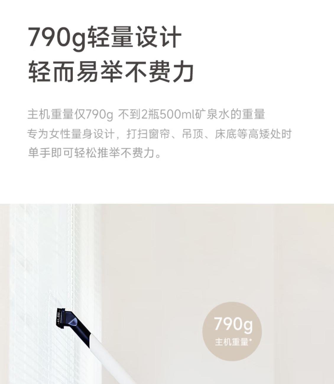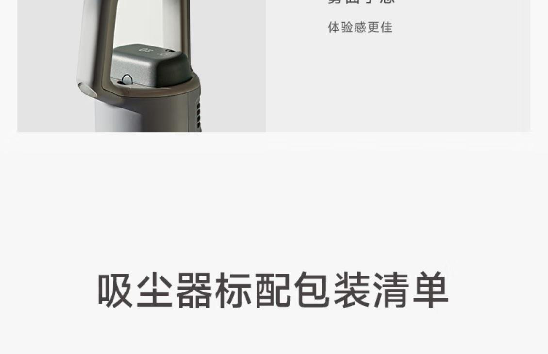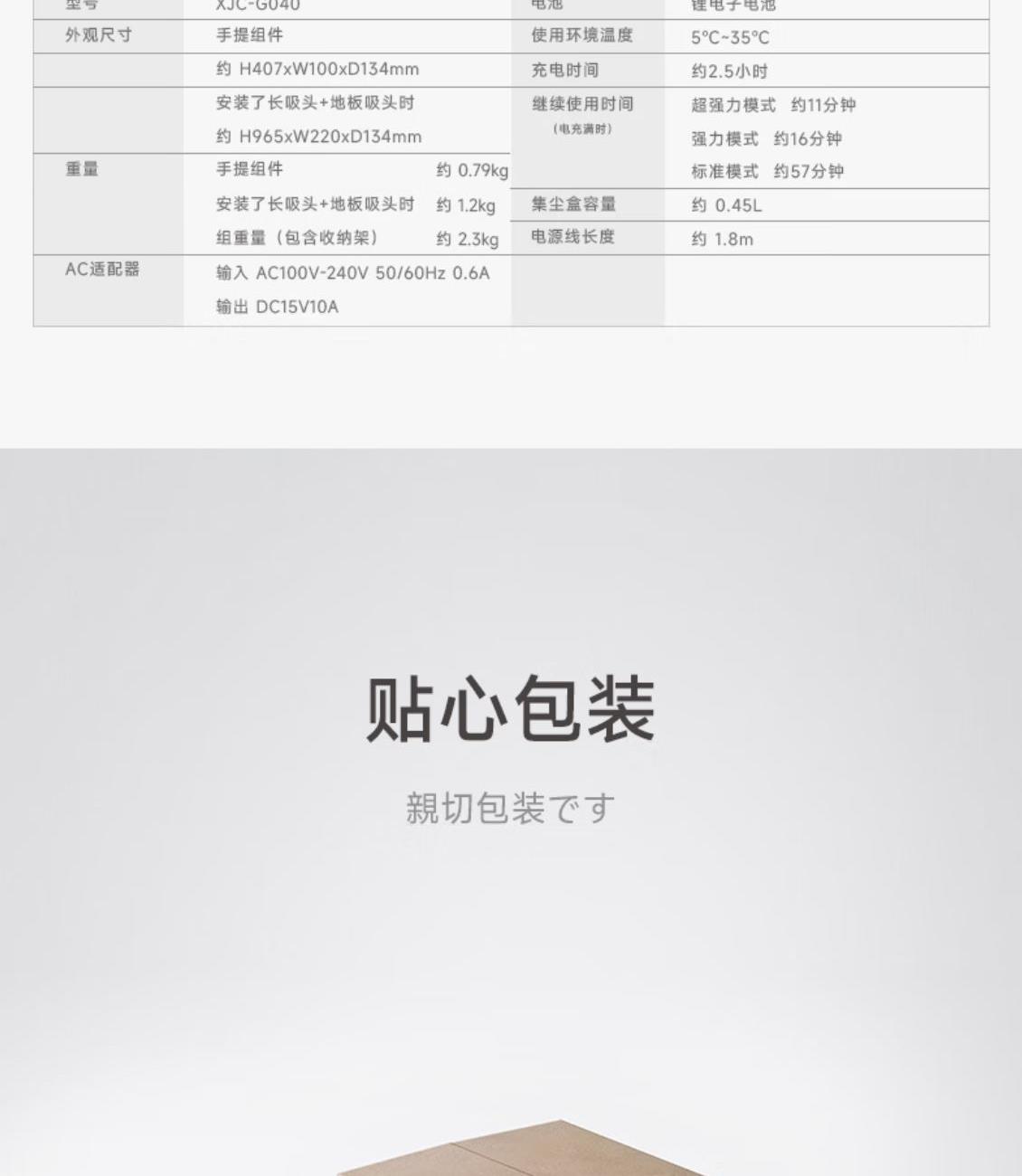 重量:手提组件 约0.8kg 安装了吸头+地板吸头:约1.2kg 电池:锂电子电池 充电时长:约2.5小时 使用时长:标准57分钟,强力16分钟,超强11分钟 集尘盒容量:约0.45L 790g轻量化设计、单手操作也无负担 持久续航,标准模式下连续清洁57分钟 清洁简单,旋转打开即可轻松清洗滤网及集尘盒 6钟清洁方式,满足全屋清洁 日本电产研发的高能锂电池,衰减慢、寿命长、充满电仅需2.5小时
