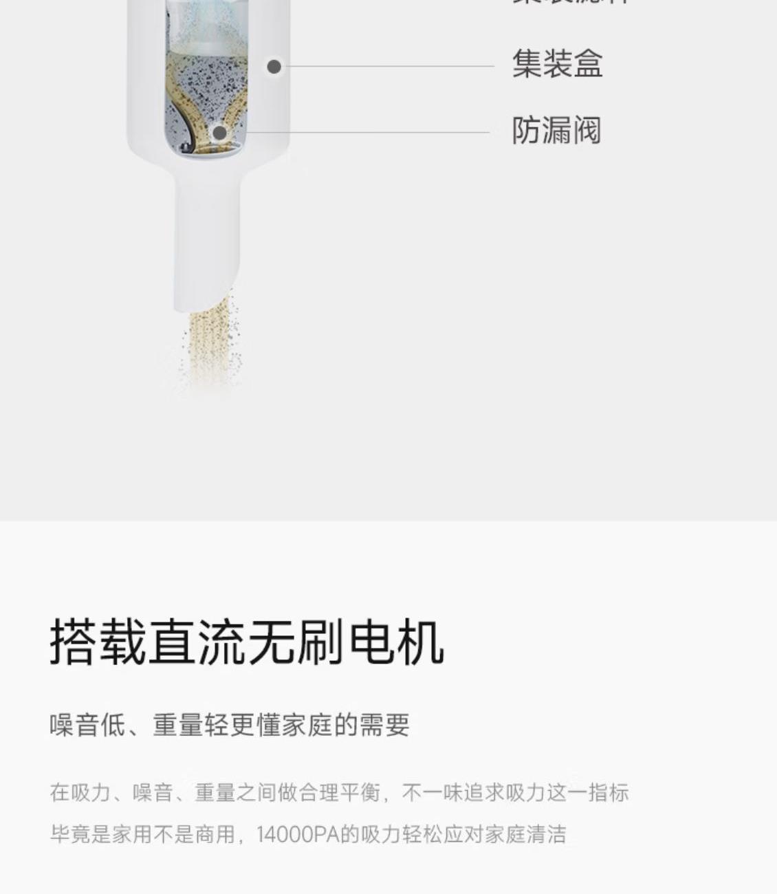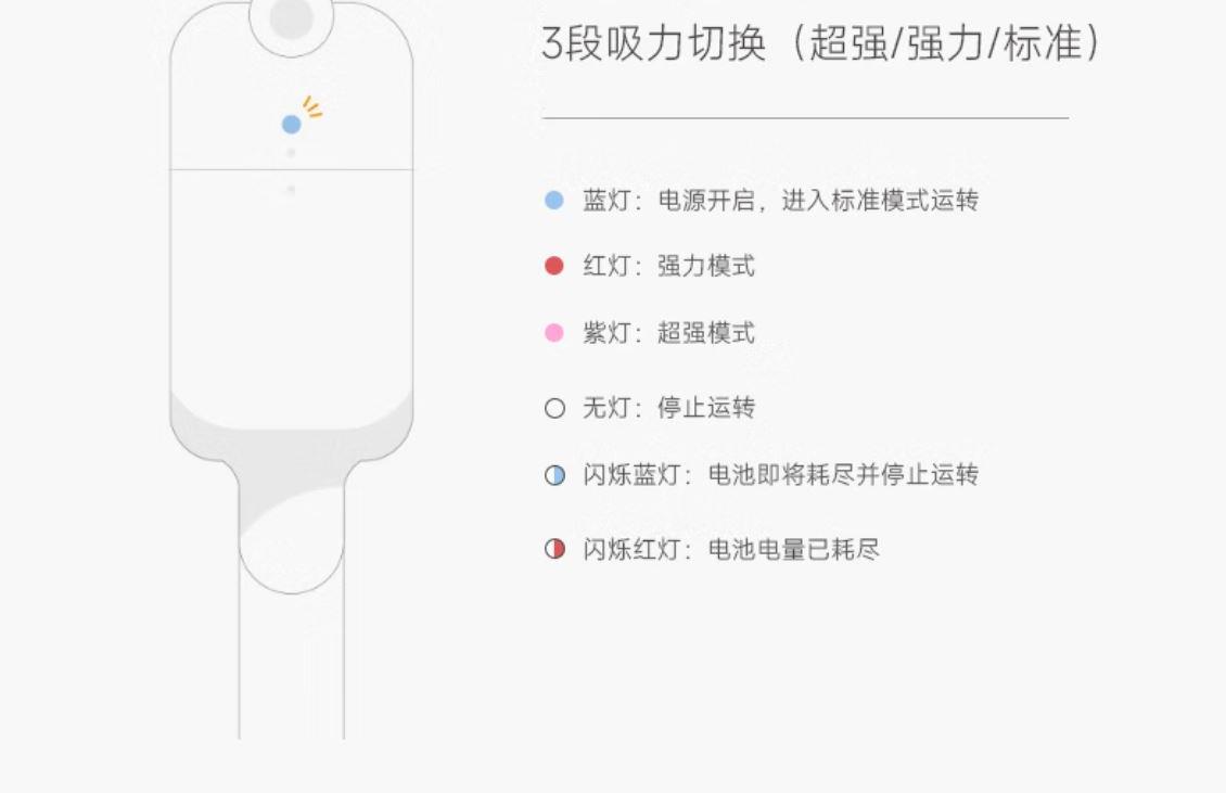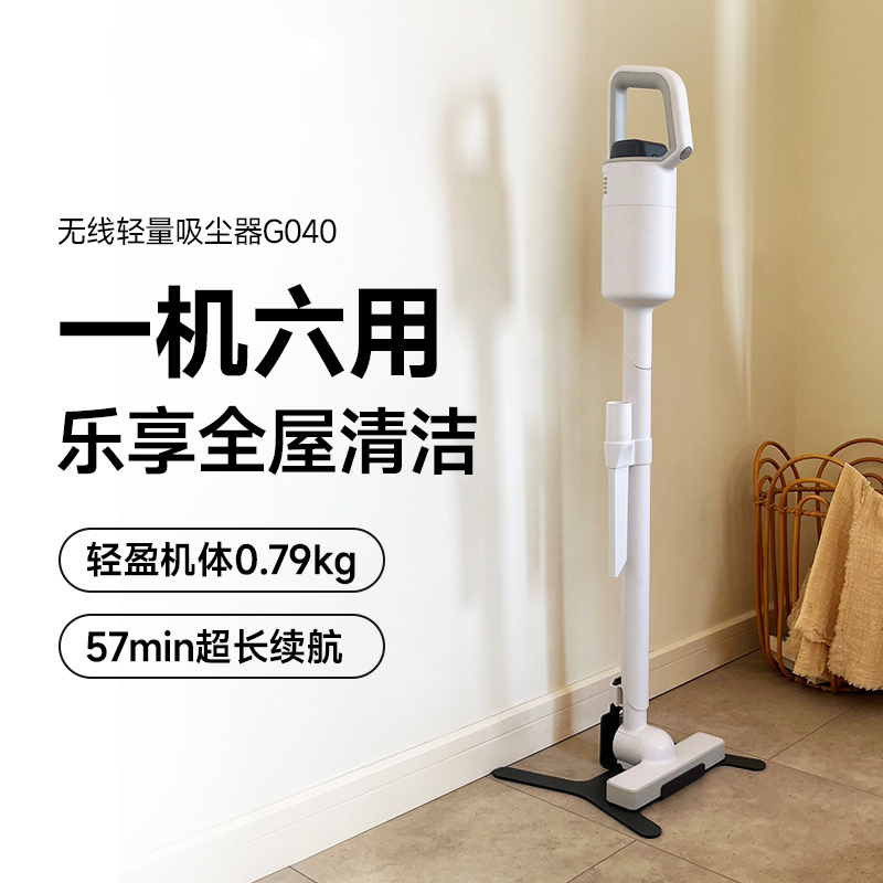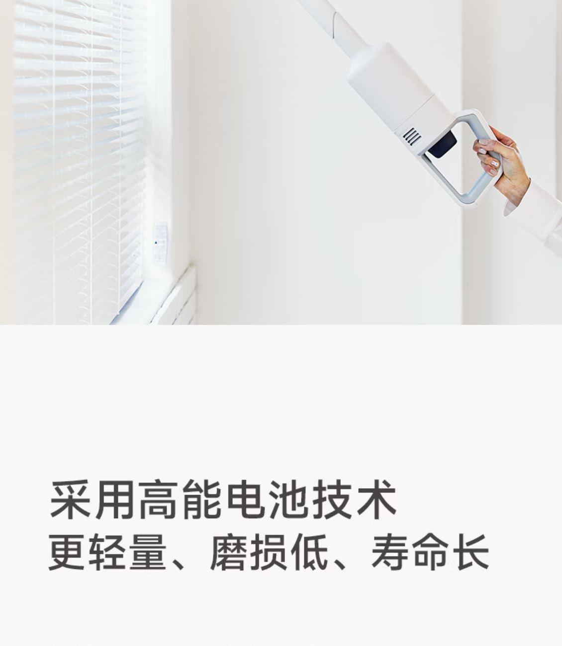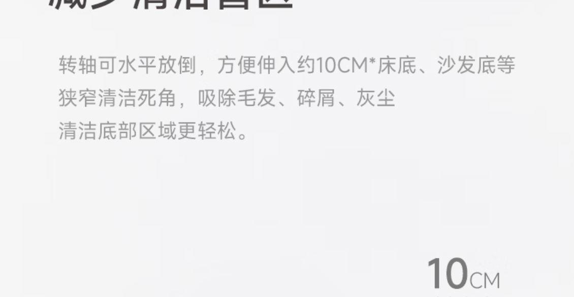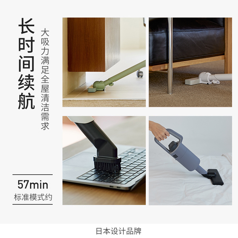 重量:手提组件 约0.8kg 安装了吸头+地板吸头:约1.2kg 电池:锂电子电池 充电时长:约2.5小时 使用时长:标准57分钟,强力16分钟,超强11分钟 集尘盒容量:约0.45L 790g轻量化设计、单手操作也无负担 持久续航,标准模式下连续清洁57分钟 清洁简单,旋转打开即可轻松清洗滤网及集尘盒 6钟清洁方式,满足全屋清洁 日本电产研发的高能锂电池,衰减慢、寿命长、充满电仅需2.5小时