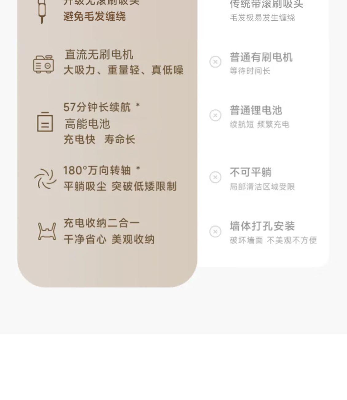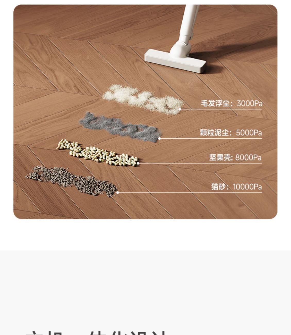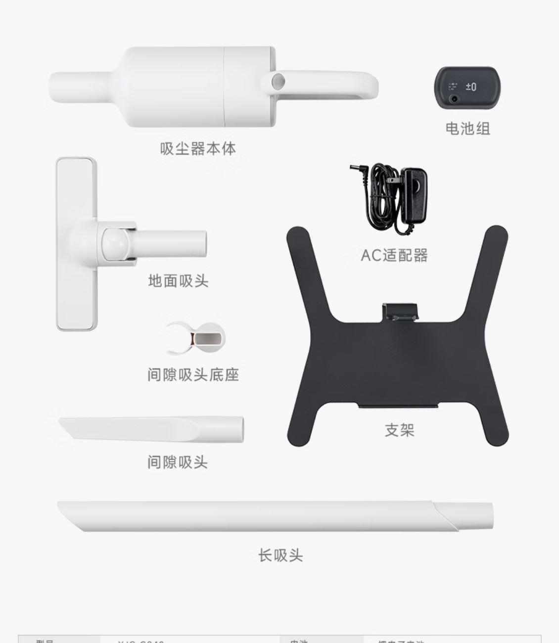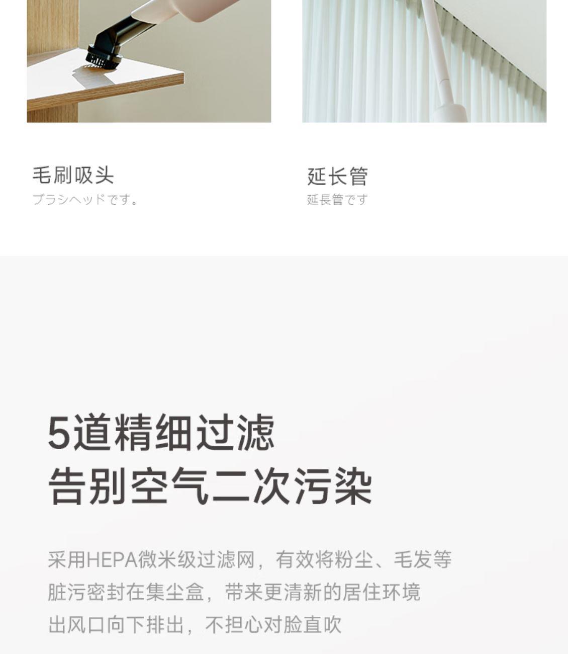 重量:手提组件 约0.8kg 安装了吸头+地板吸头:约1.2kg 电池:锂电子电池 充电时长:约2.5小时 使用时长:标准57分钟,强力16分钟,超强11分钟 集尘盒容量:约0.45L 790g轻量化设计、单手操作也无负担 持久续航,标准模式下连续清洁57分钟 清洁简单,旋转打开即可轻松清洗滤网及集尘盒 6钟清洁方式,满足全屋清洁 日本电产研发的高能锂电池,衰减慢、寿命长、充满电仅需2.5小时