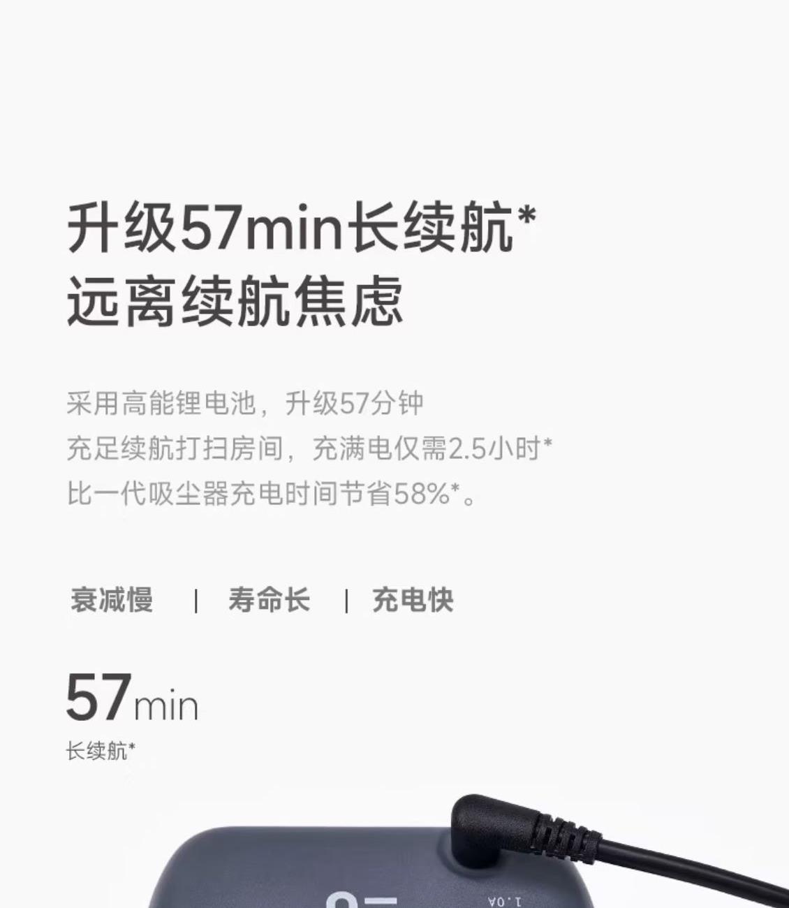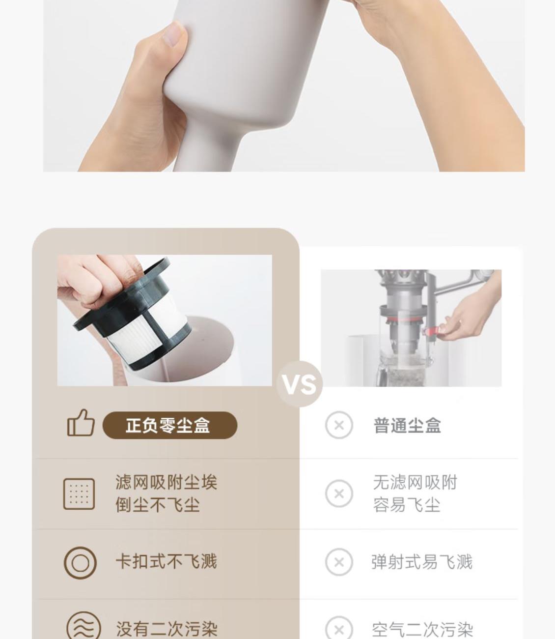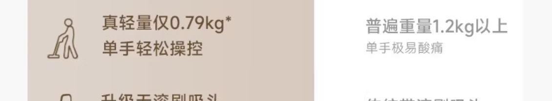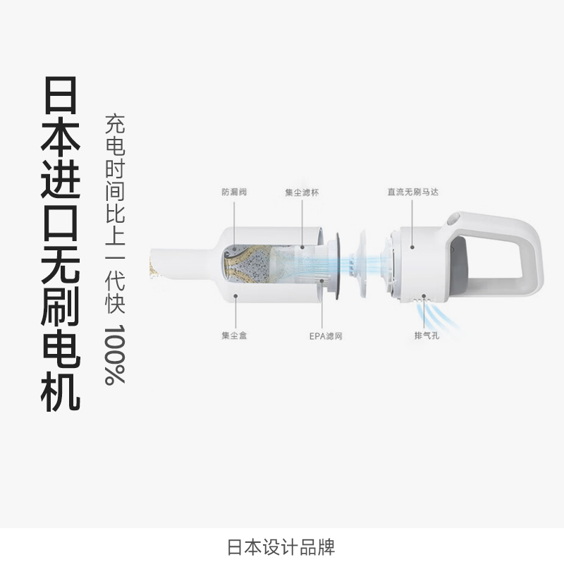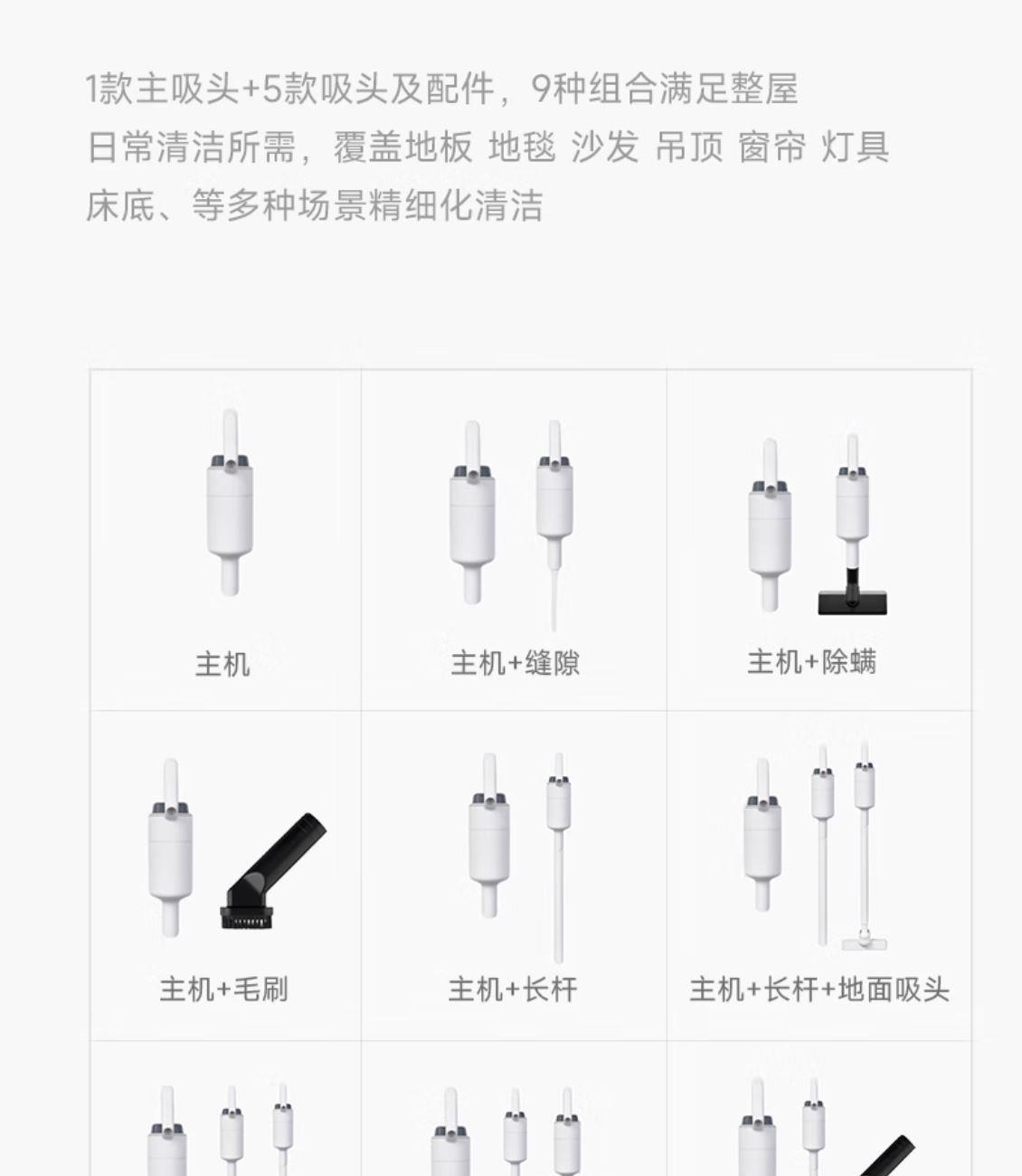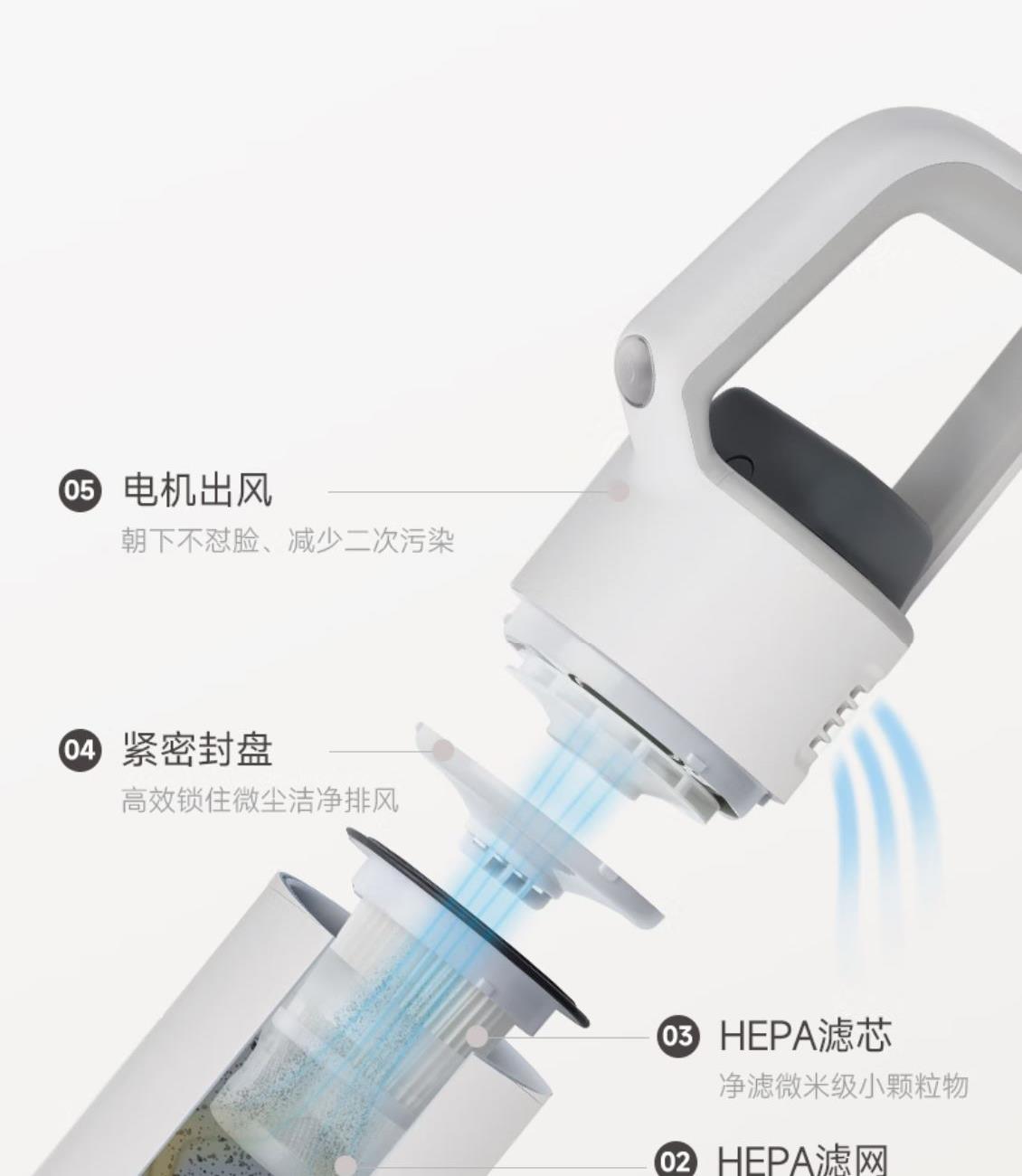 重量:手提组件 约0.8kg 安装了吸头+地板吸头:约1.2kg 电池:锂电子电池 充电时长:约2.5小时 使用时长:标准57分钟,强力16分钟,超强11分钟 集尘盒容量:约0.45L 790g轻量化设计、单手操作也无负担 持久续航,标准模式下连续清洁57分钟 清洁简单,旋转打开即可轻松清洗滤网及集尘盒 6钟清洁方式,满足全屋清洁 日本电产研发的高能锂电池,衰减慢、寿命长、充满电仅需2.5小时