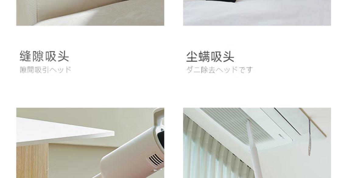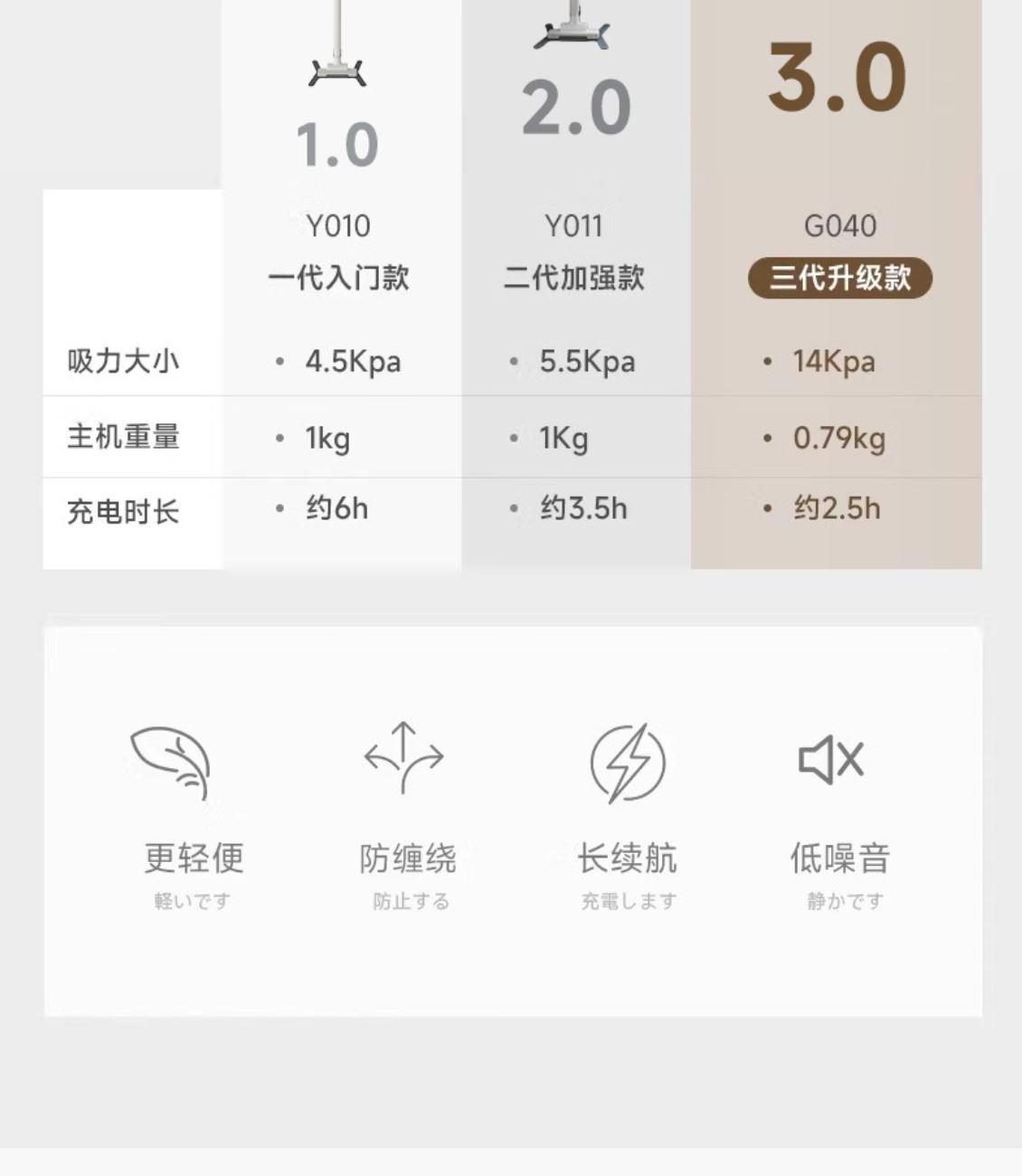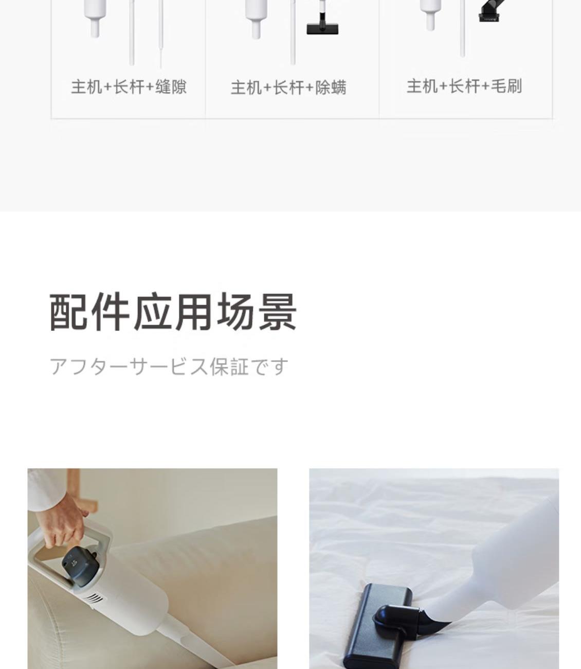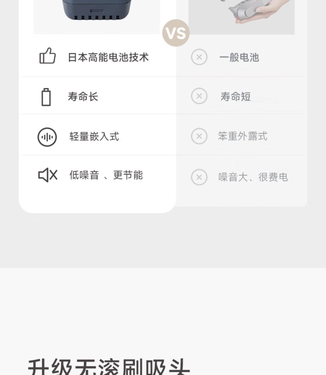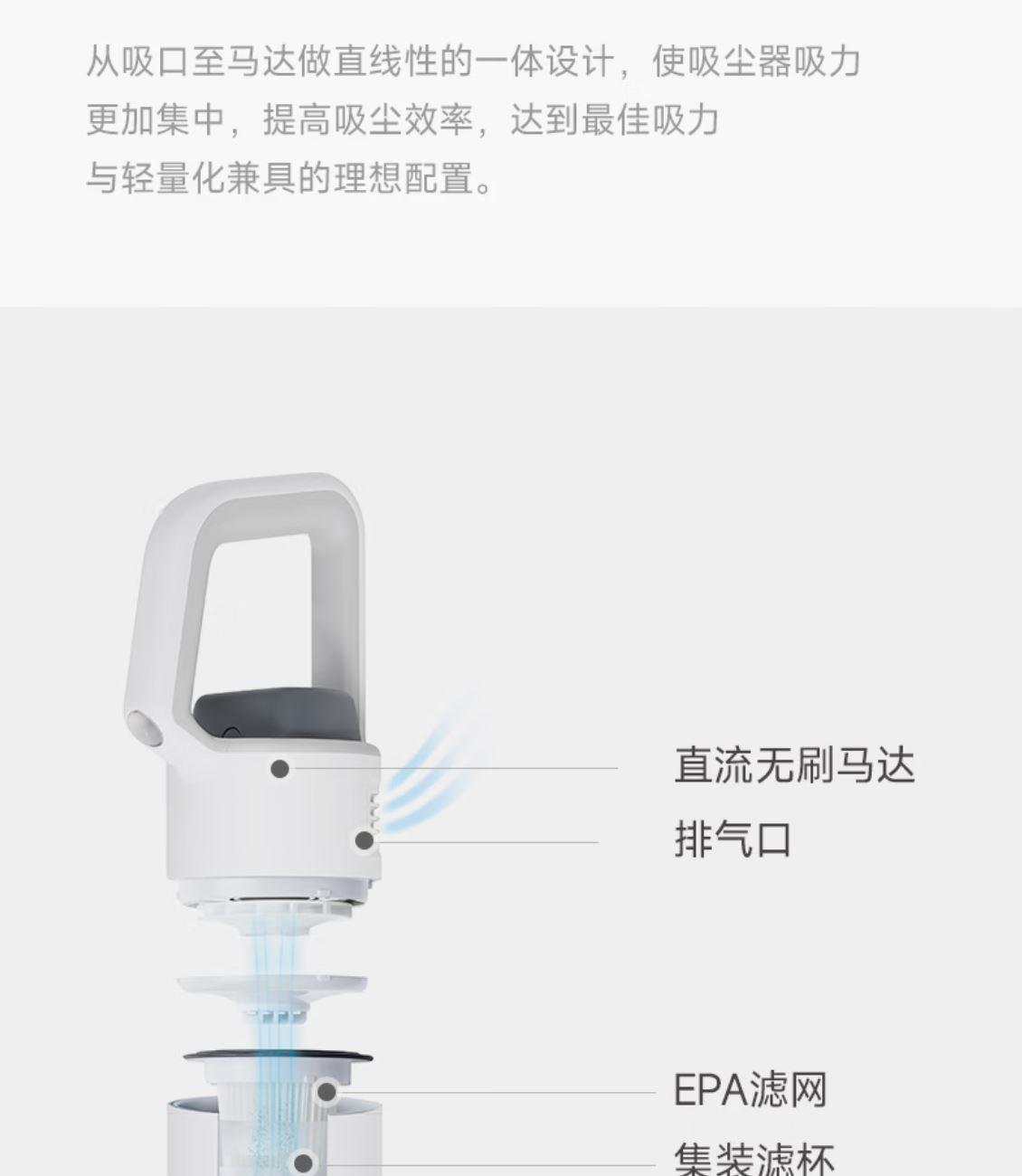 重量:手提组件 约0.8kg 安装了吸头+地板吸头:约1.2kg 电池:锂电子电池 充电时长:约2.5小时 使用时长:标准57分钟,强力16分钟,超强11分钟 集尘盒容量:约0.45L 790g轻量化设计、单手操作也无负担 持久续航,标准模式下连续清洁57分钟 清洁简单,旋转打开即可轻松清洗滤网及集尘盒 6钟清洁方式,满足全屋清洁 日本电产研发的高能锂电池,衰减慢、寿命长、充满电仅需2.5小时