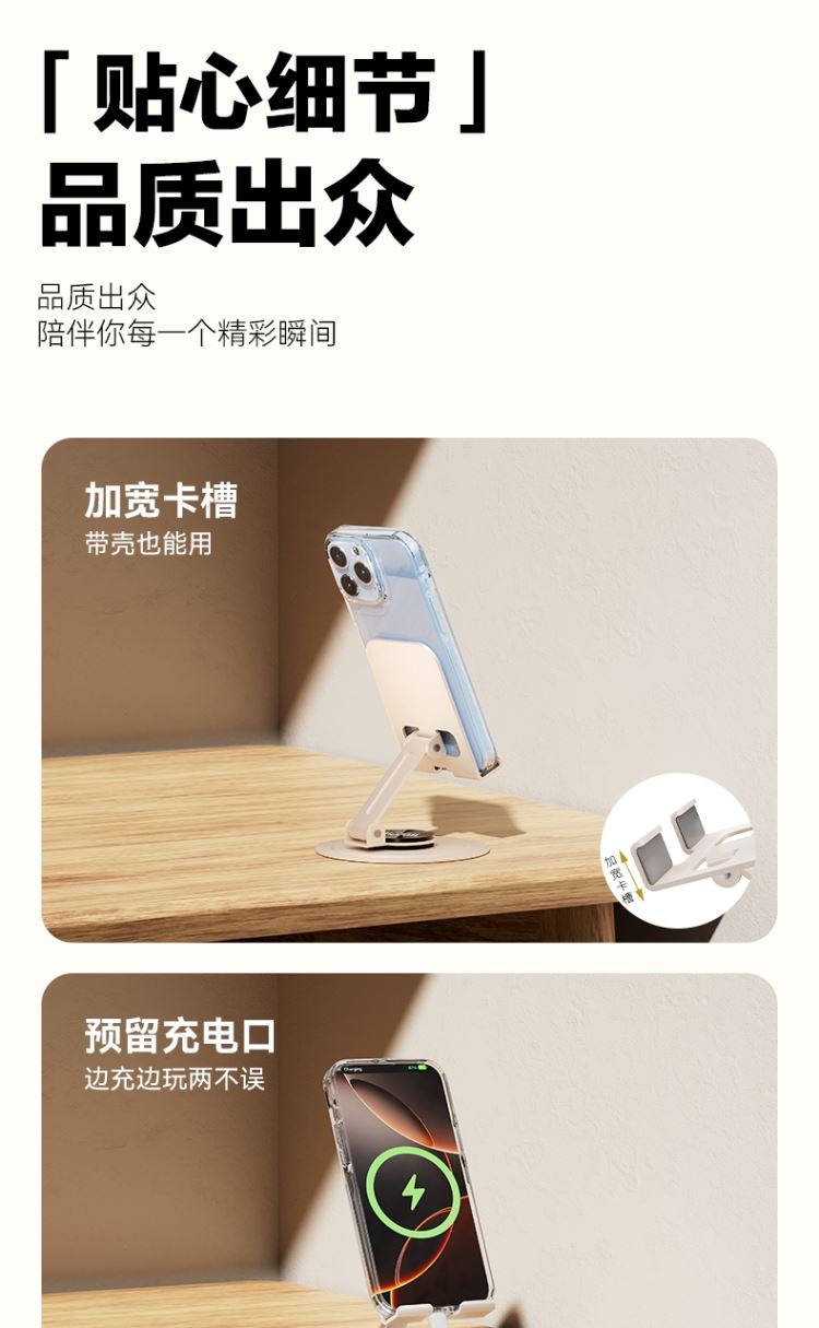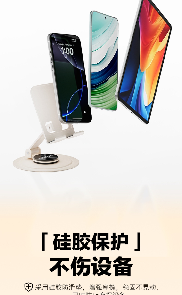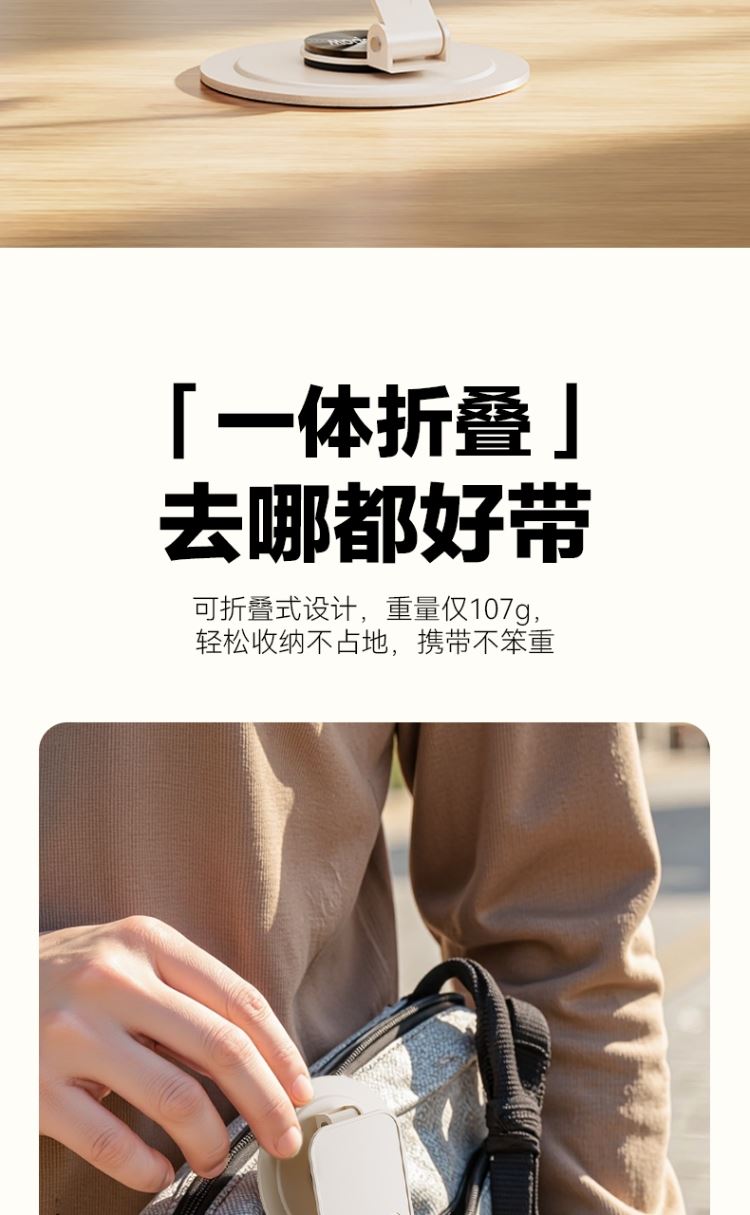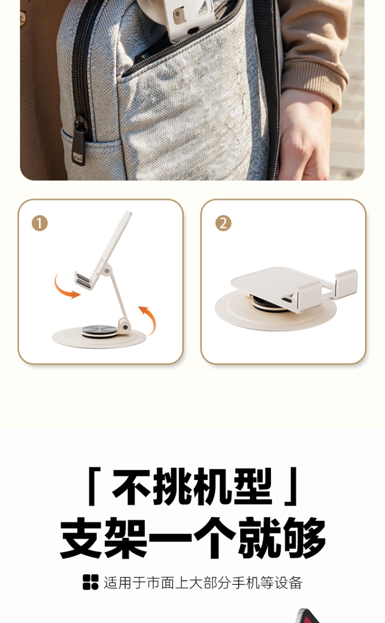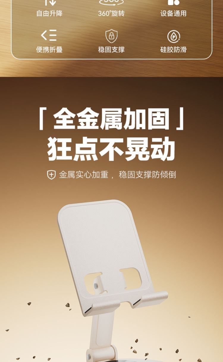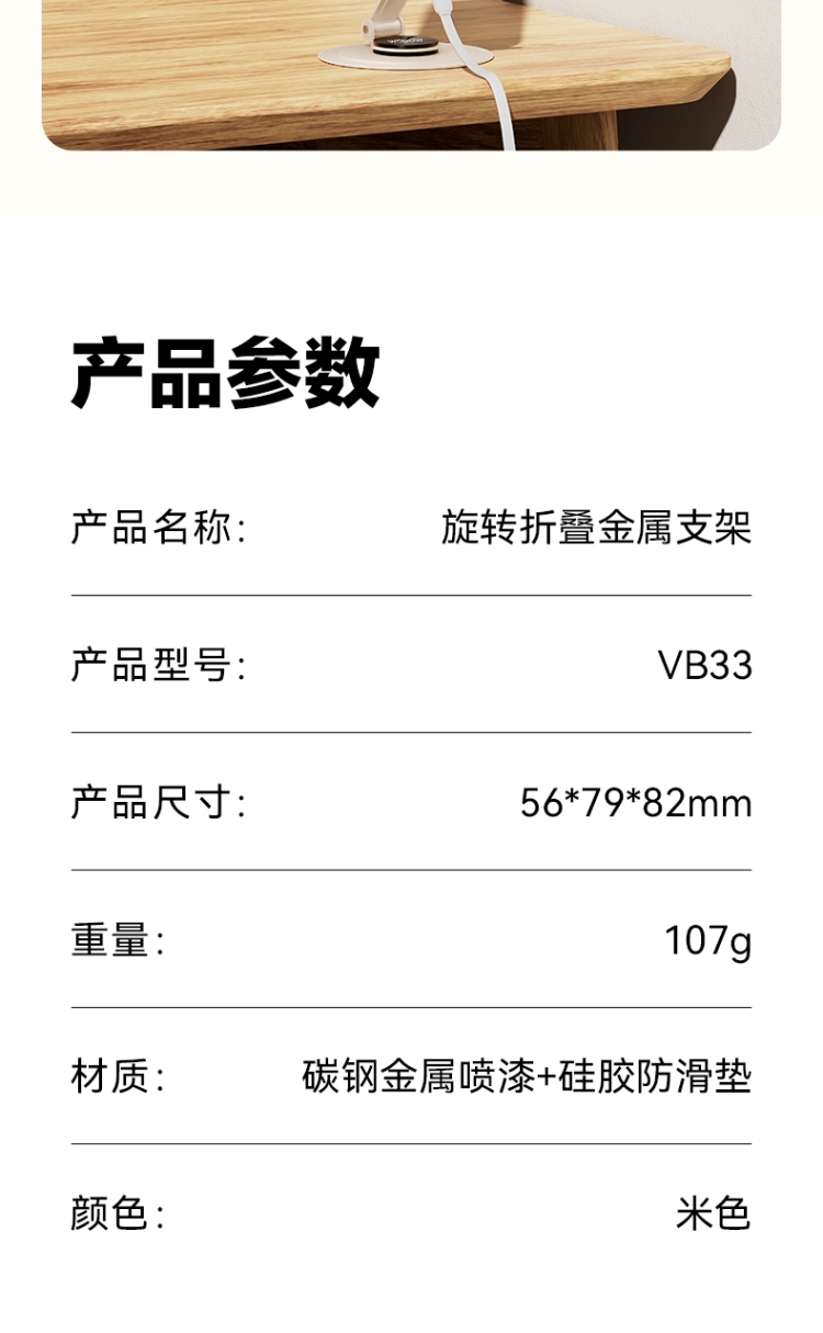 产品尺寸:56*79*82mm 包装尺寸: 84*104*32mm产品重量:107g 颜色:米色 材质:碳钢金属喷漆+硅胶防滑垫 使用场景:把支架平稳放置在桌面上,调节好舒适角度就可以放置手机,不使用的时候可以折叠起来,随身携带方便实用。 360度任意变换角度 可折叠方便携带 自由升降,支撑力大 金属材质,硅胶垫防滑垫。