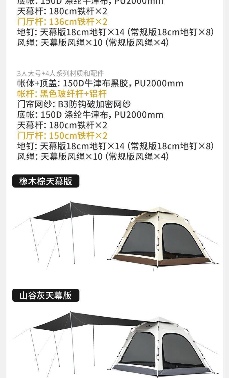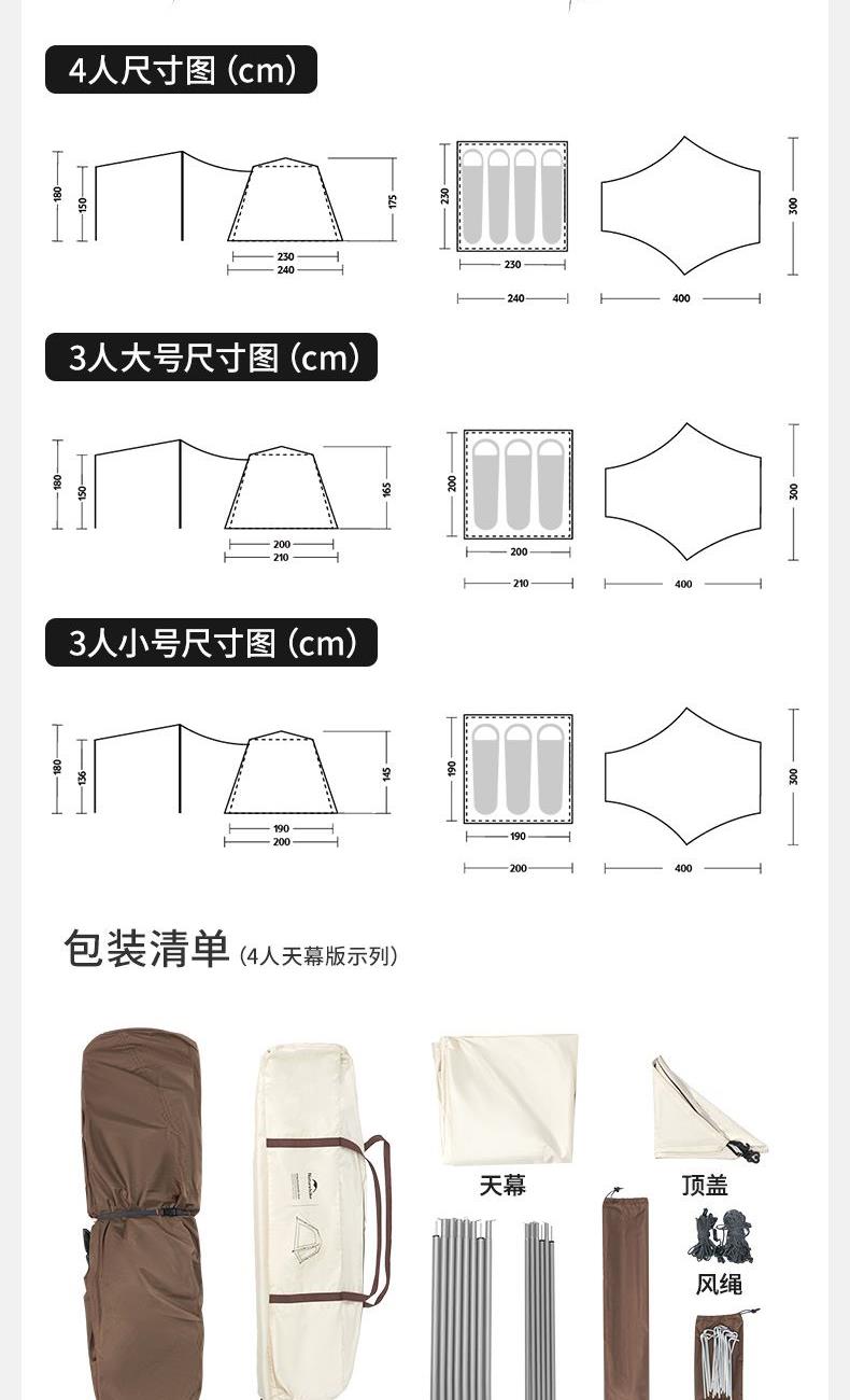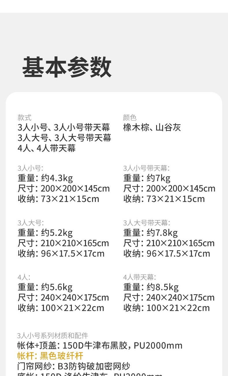 橡木棕/3人小号 外帐:150D牛津布黑胶 底帐:150D涤纶牛津布 帐杆:玻杆 3人小号:重量:约4.3kg尺寸:200x200x145cm收纳:73x21x15cm