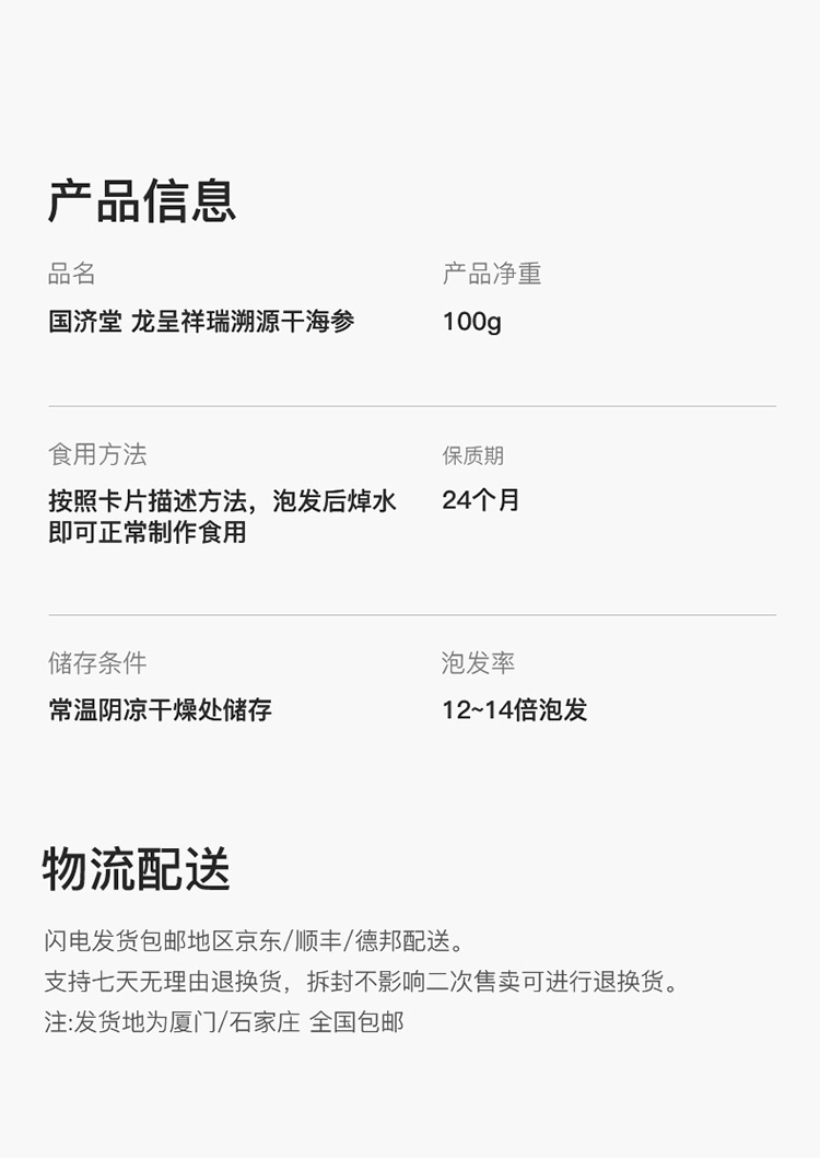 规格:50~80头; 类型及净含量:大连瓦房店溯源淡干海参 —100克; 泡发率:12倍泡发 储存方式:常温阴凉干燥处贮存 食用方法:按照卡片描述方法, 泡发后焯水,即可正常制作食用。 保质期:24个月 国济堂精选北纬39°地带冷水区域海参,深海养殖,精挑细选。口感Q弹爽滑,劲道有力。泡发率高,发头大。礼盒大气吸睛,区别于市面一般礼盒,送礼佳品。每盒带溯源标,参龄标,扫码追溯产地等。均有质检报告。