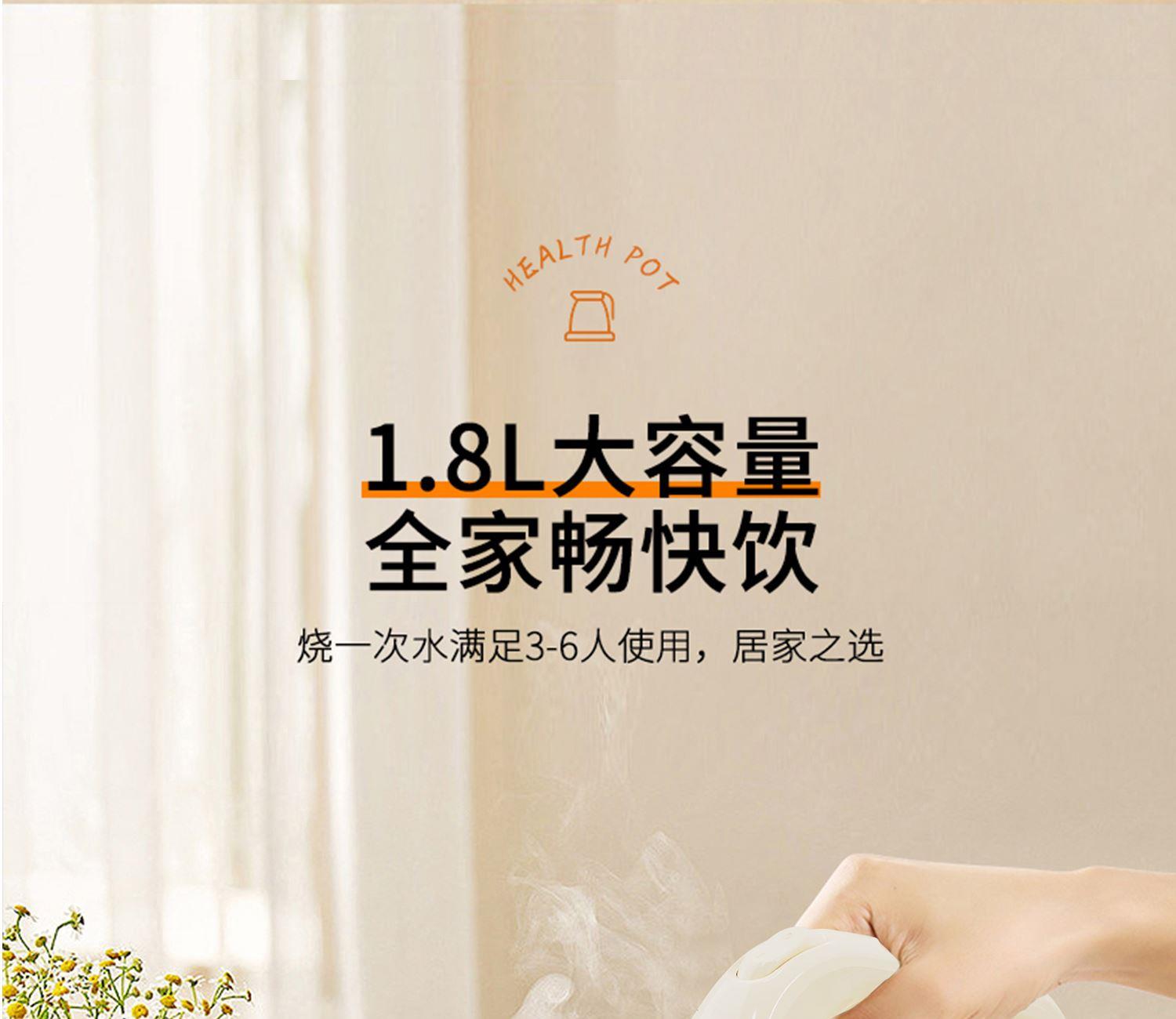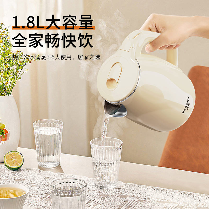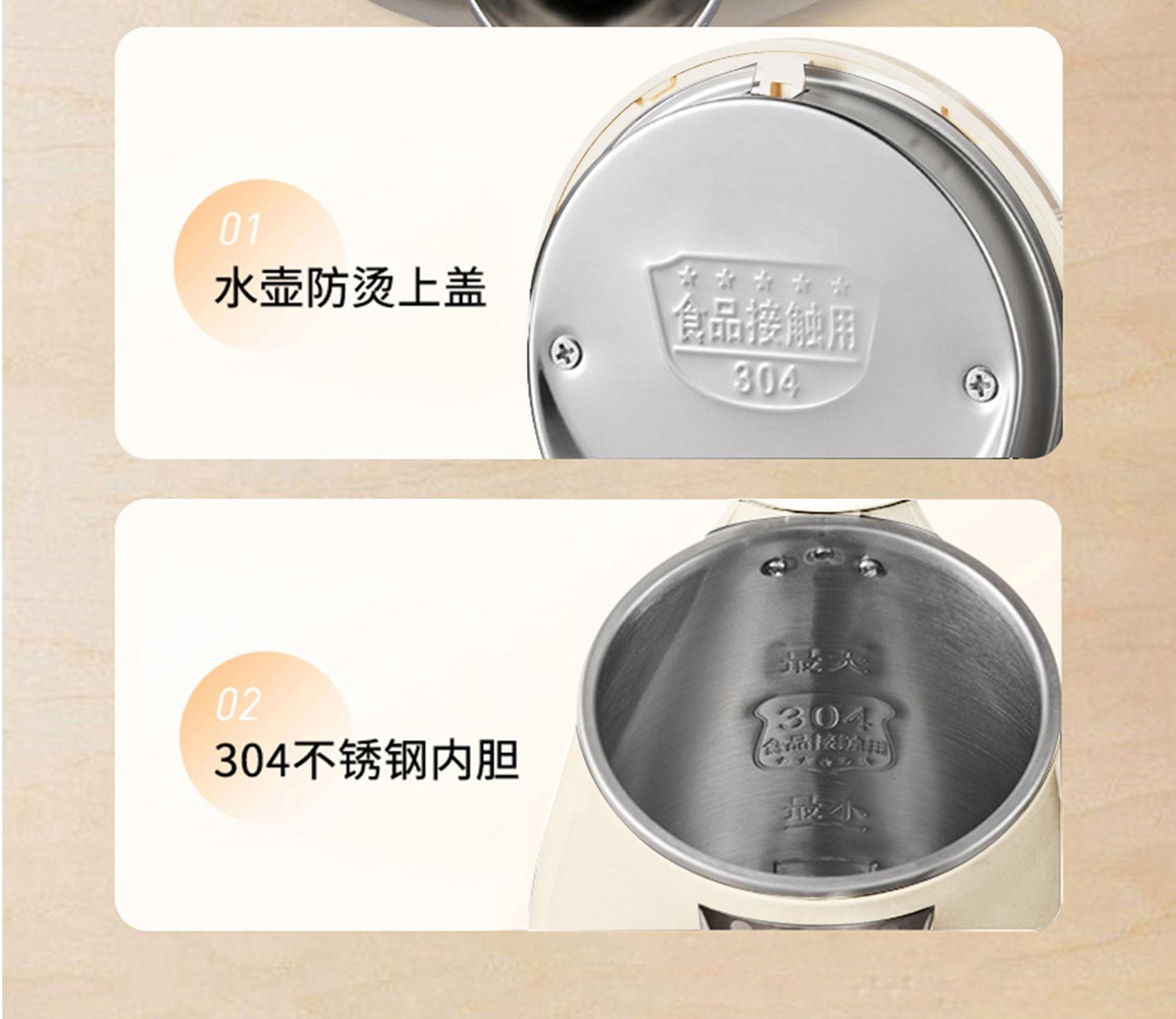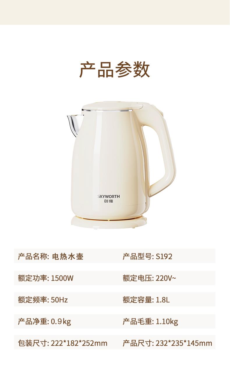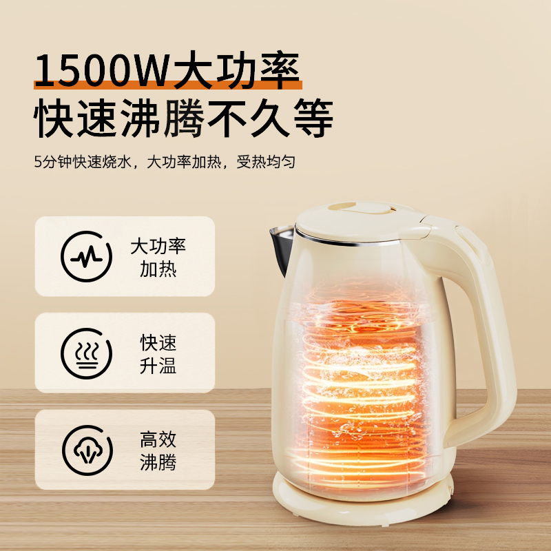 额定电压:220V~ 额定频率:50Hz 额定功率:1500W 容 量:1.8L 产品材质:壶盖:PP+不锈钢;壶嘴、壶胆:不锈钢;外壳、底座:PP 1、304不锈钢材质,用心选材; 2、1.8L大容量,居家之选,满足3-6人使用; 3、1500W大功率,快速沸腾,即烧即饮 4、优品温控器,控温,经久耐用; 5、不锈钢过滤壶嘴,滤出杂质; 6、双层防烫机身,保温不烫手。