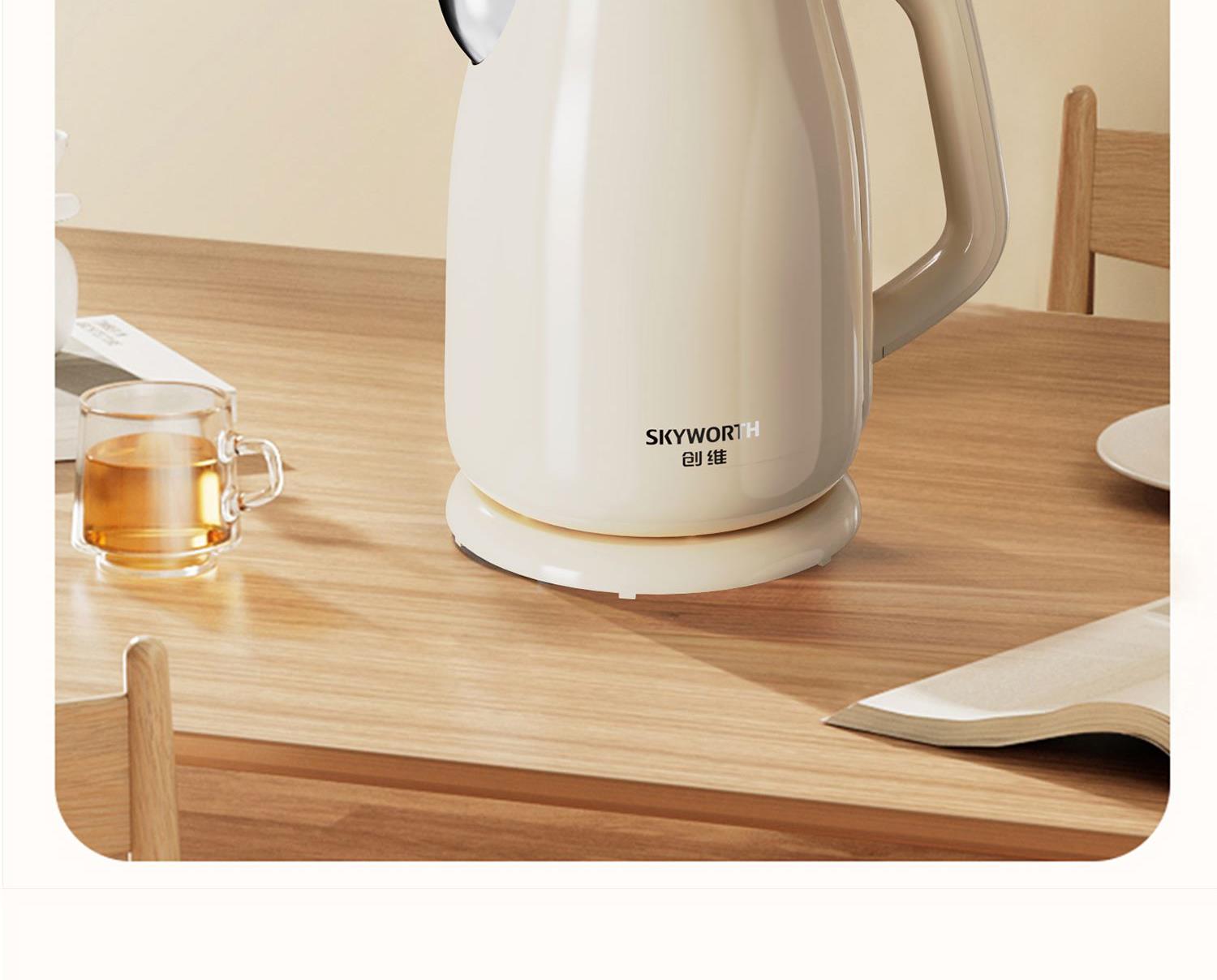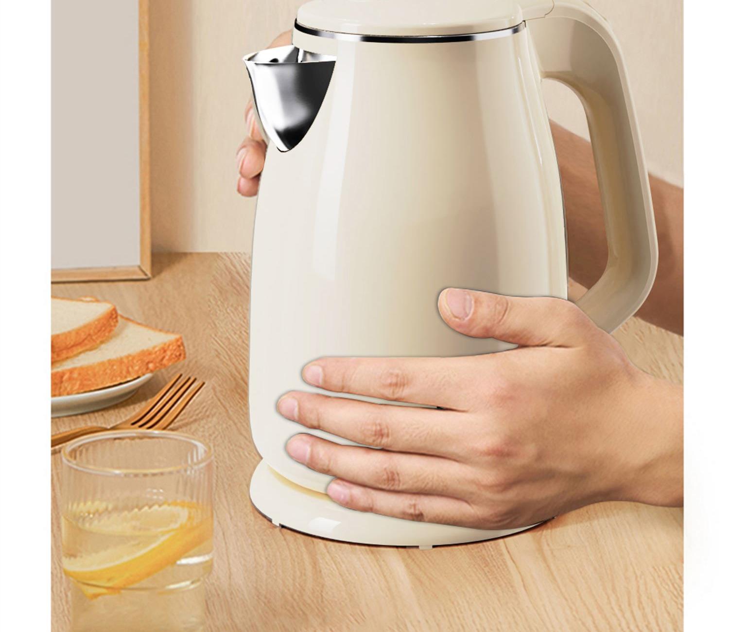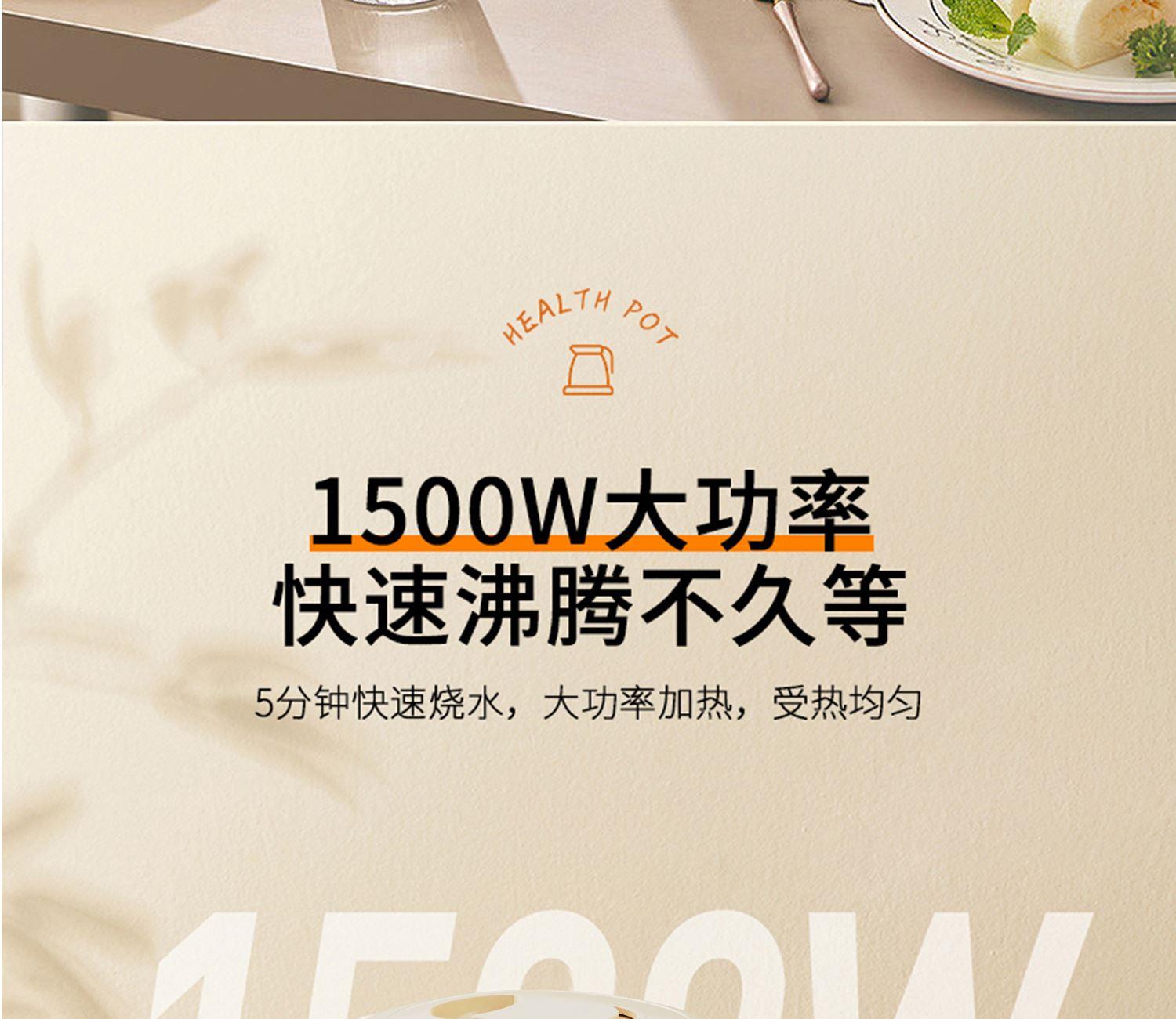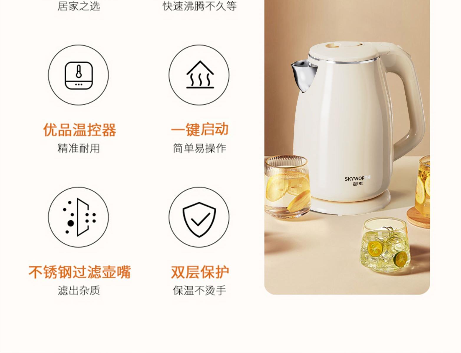 额定电压:220V~ 额定频率:50Hz 额定功率:1500W 容 量:1.8L 产品材质:壶盖:PP+不锈钢;壶嘴、壶胆:不锈钢;外壳、底座:PP 1、304不锈钢材质,用心选材; 2、1.8L大容量,居家之选,满足3-6人使用; 3、1500W大功率,快速沸腾,即烧即饮 4、优品温控器,控温,经久耐用; 5、不锈钢过滤壶嘴,滤出杂质; 6、双层防烫机身,保温不烫手。