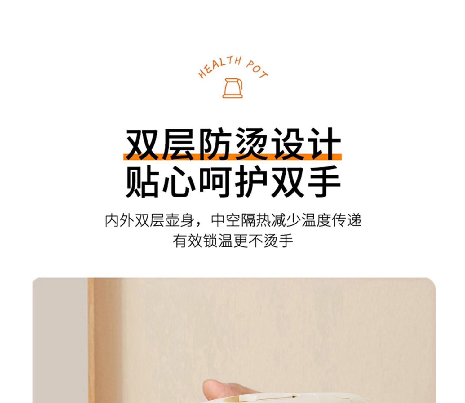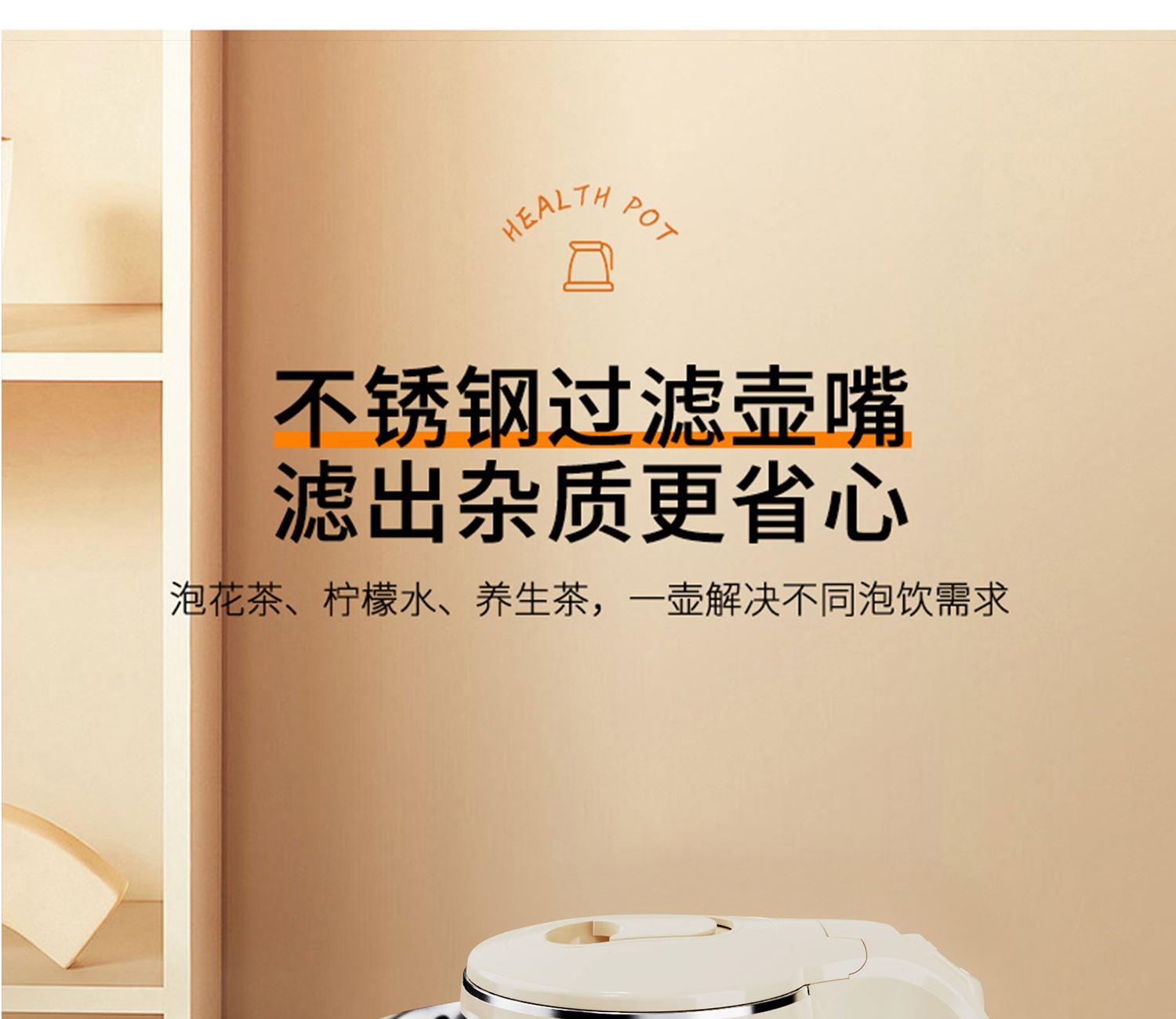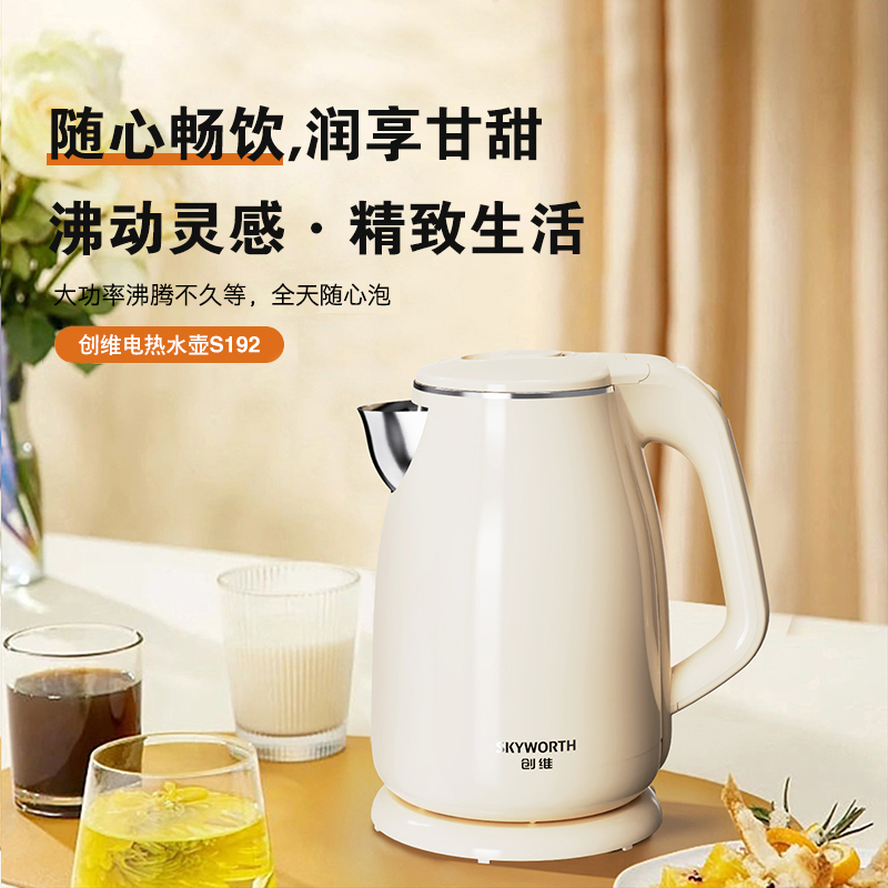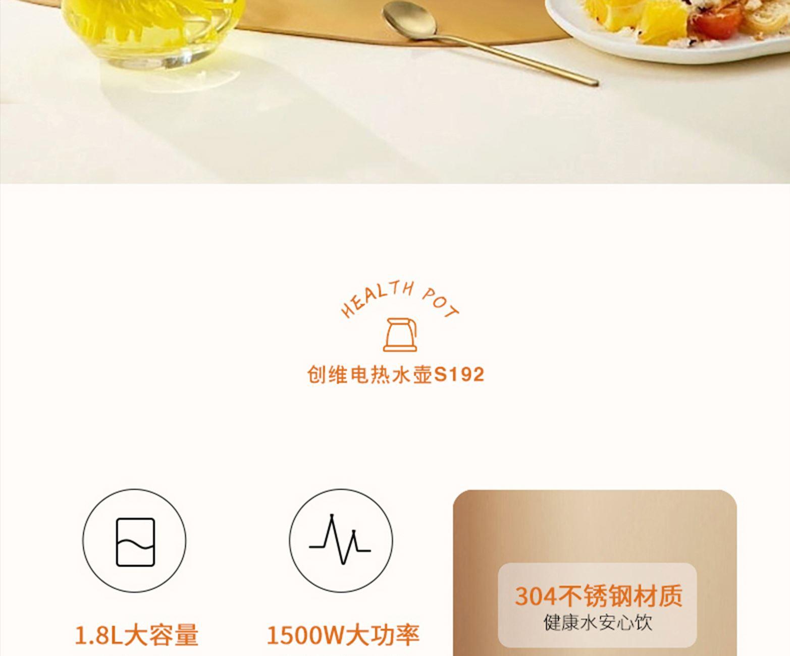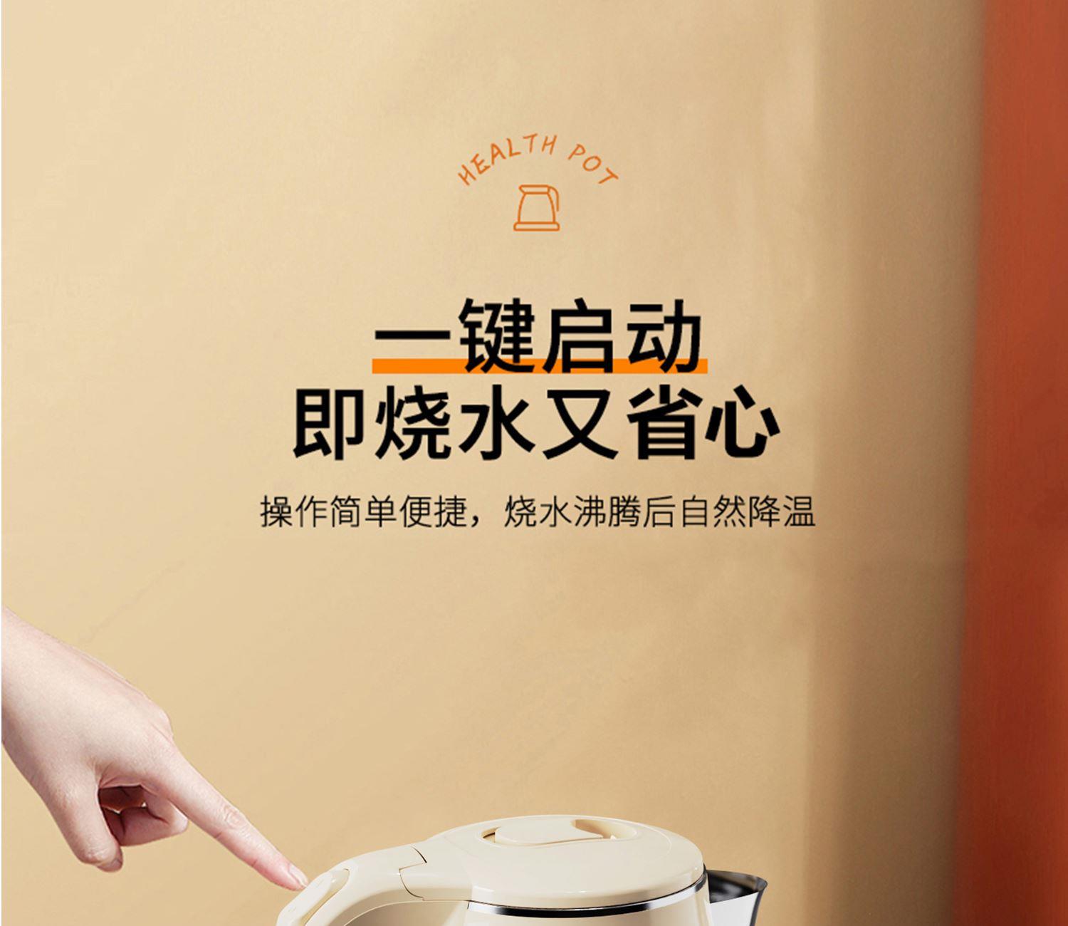 额定电压:220V~ 额定频率:50Hz 额定功率:1500W 容 量:1.8L 产品材质:壶盖:PP+不锈钢;壶嘴、壶胆:不锈钢;外壳、底座:PP 1、304不锈钢材质,用心选材; 2、1.8L大容量,居家之选,满足3-6人使用; 3、1500W大功率,快速沸腾,即烧即饮 4、优品温控器,控温,经久耐用; 5、不锈钢过滤壶嘴,滤出杂质; 6、双层防烫机身,保温不烫手。