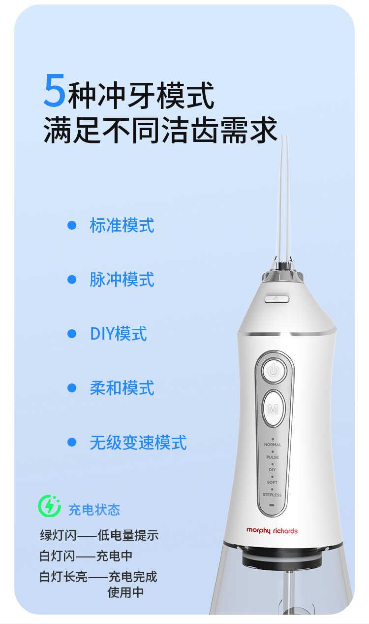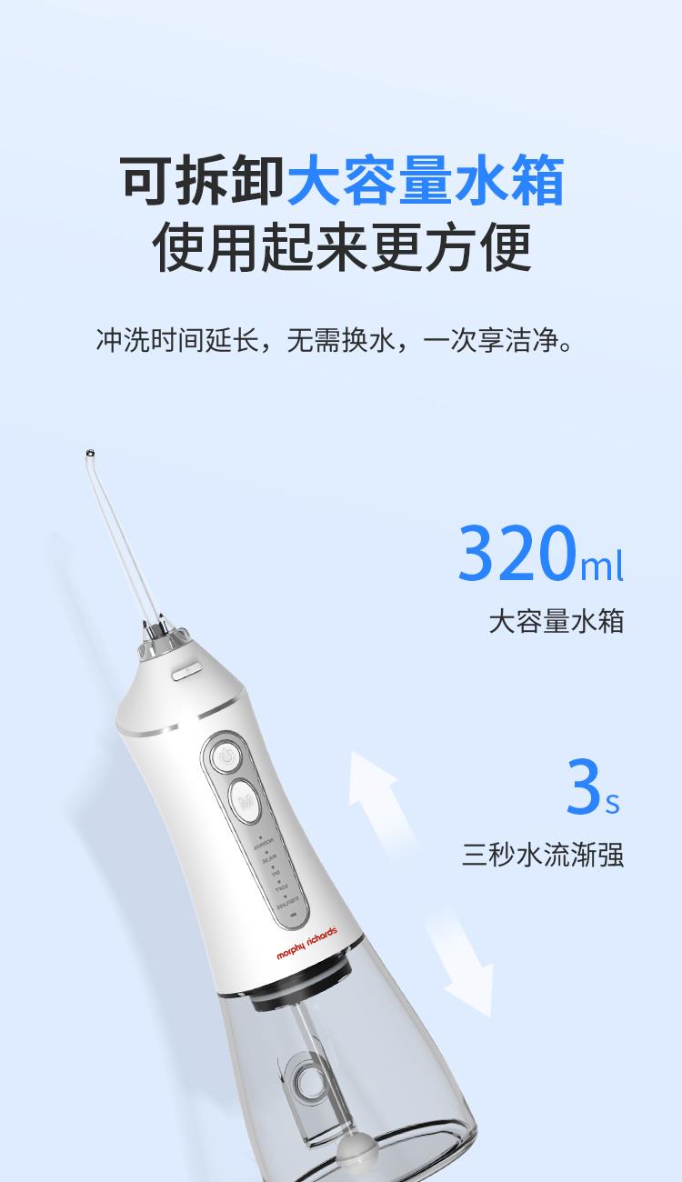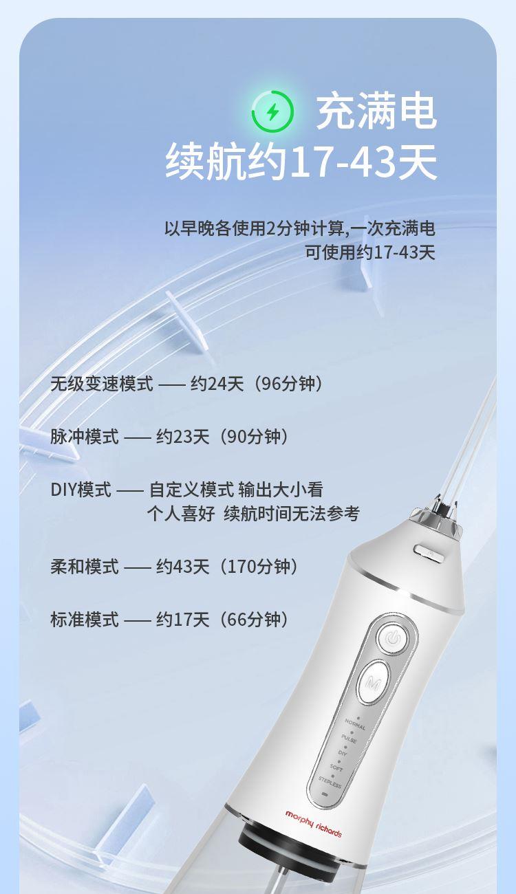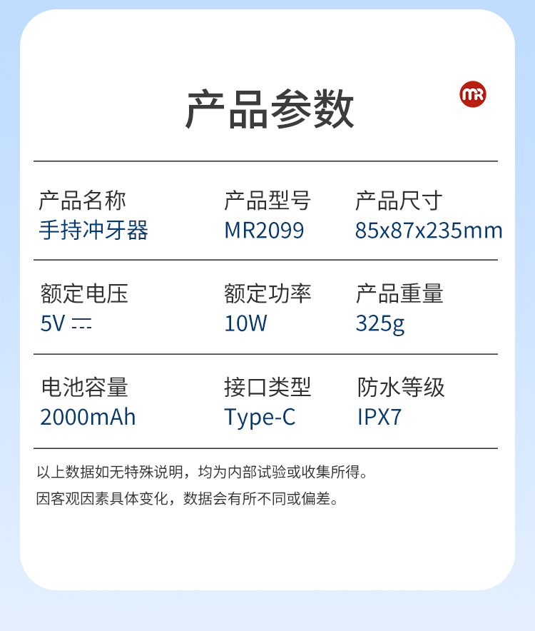 型号 MR2099 净重 308g 毛重 665g 包装尺寸 25X14X7.6cm 大箱尺寸 53.6x46x44cm 续航: ≈0.7h 充电时间:2.5小时±0.5小时 额定电压/电流:DC3.7V/1.5A 额定水压:5-140PSI 可调 脉冲:1600 次/分钟 充电接口:Type-C 电池容量:1400毫安 防水等级:IPX7 水箱容量:180ml 配件:主机*1,喷嘴(标准喷嘴*1 牙周袋喷嘴*1 舌刮喷嘴*1),充电线