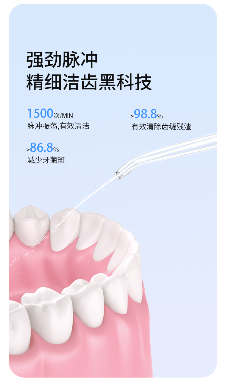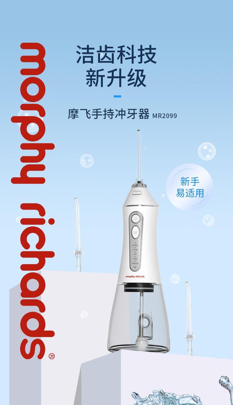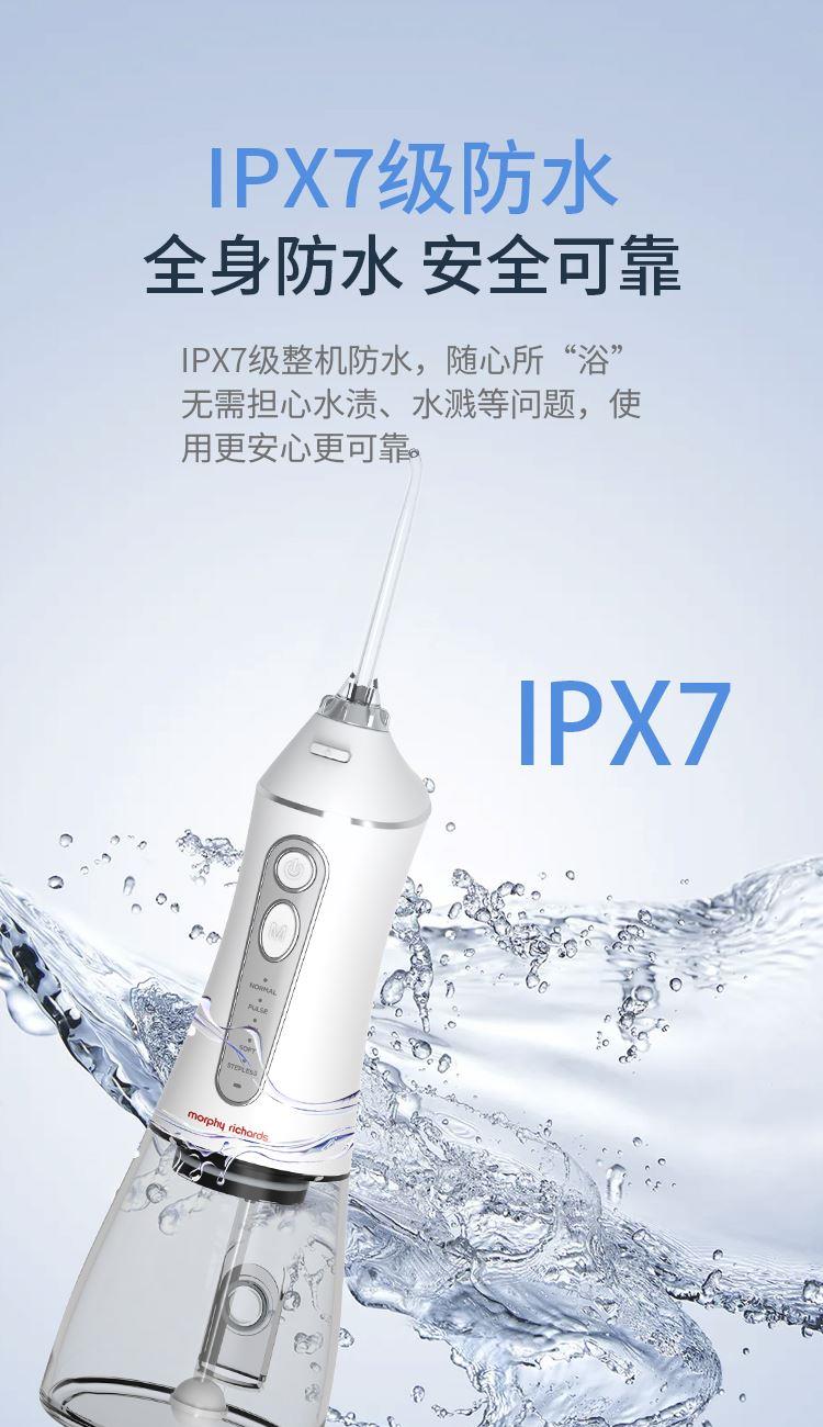 型号 MR2099 净重 308g 毛重 665g 包装尺寸 25X14X7.6cm 大箱尺寸 53.6x46x44cm 续航: ≈0.7h 充电时间:2.5小时±0.5小时 额定电压/电流:DC3.7V/1.5A 额定水压:5-140PSI 可调 脉冲:1600 次/分钟 充电接口:Type-C 电池容量:1400毫安 防水等级:IPX7 水箱容量:180ml 配件:主机*1,喷嘴(标准喷嘴*1 牙周袋喷嘴*1 舌刮喷嘴*1),充电线