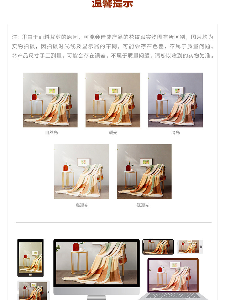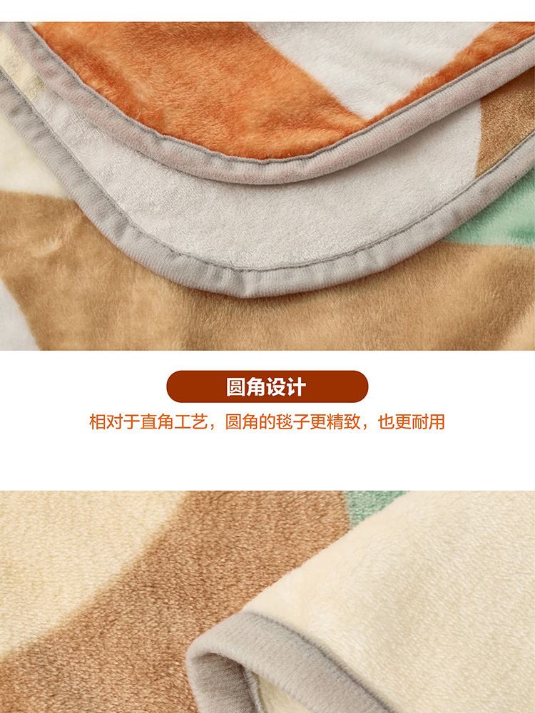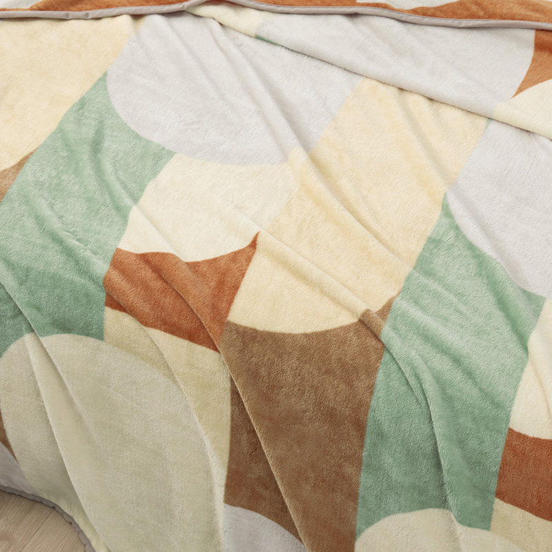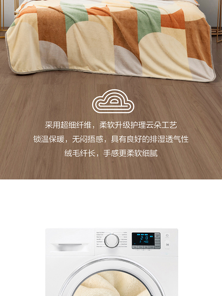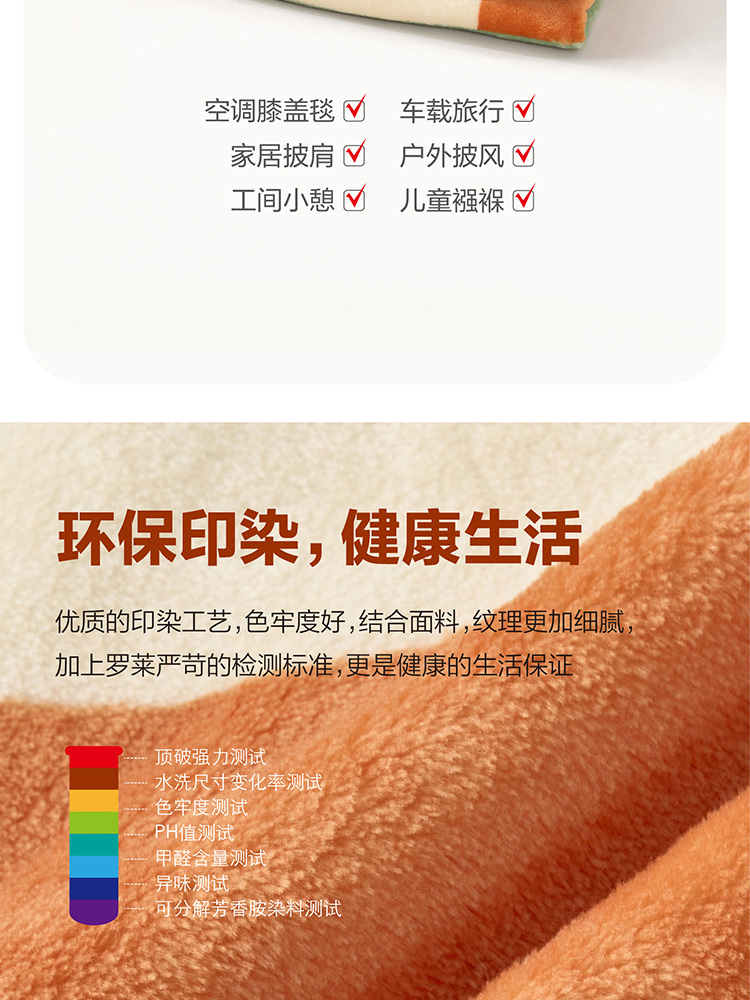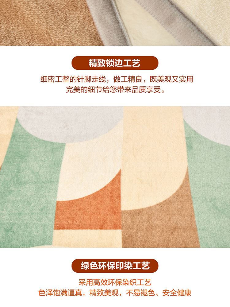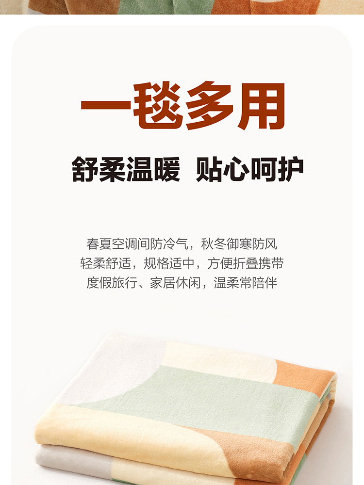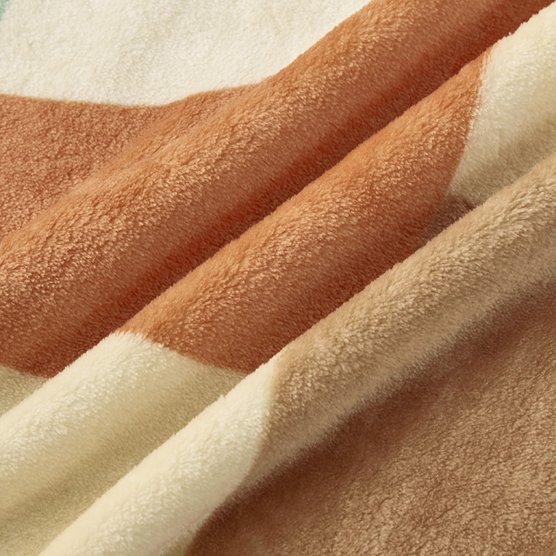 面料材质:聚酯纤维 规格尺寸:150×200cm 产品条重:840g 采用超细纤维,柔软升级护理云朵工艺,锁温保暖,无闷捂感,具有良好的排湿透气性,绒毛纤长,手感更柔软细腻,保暖性好,光泽度高; 灵感来源于近年来大热的孟菲斯设计风格,孟菲斯风格擅长采用波形曲线,曲面和直线,平面的组合。配色上多种撞色,选色明丽鲜艳,明快的橘色与灰、绿等色块构成视觉的平衡,温馨明快; 可作薄被、夏被、空调被、床单、盖毯使用;广泛用于办公室,外出、小憩及居家装饰。