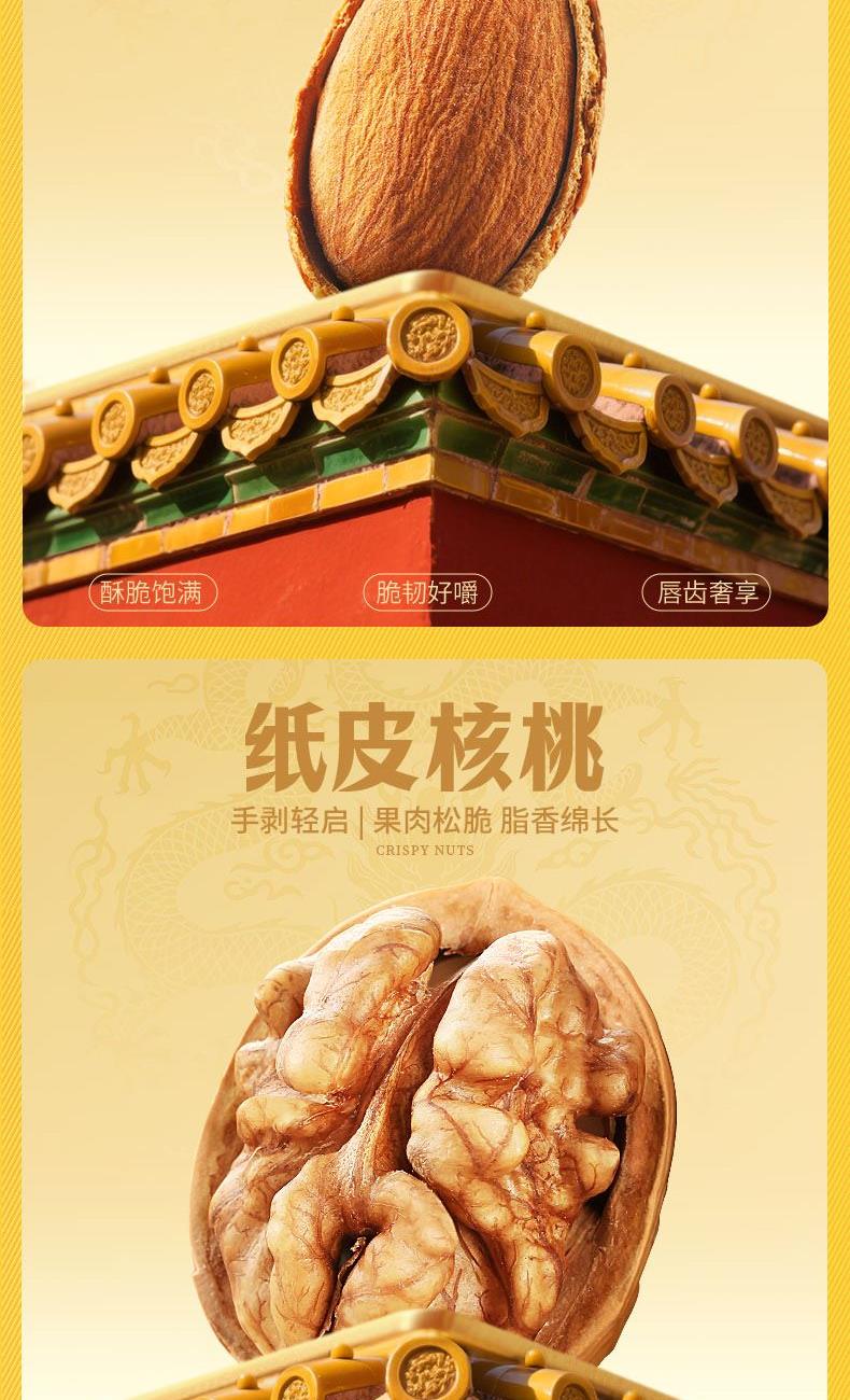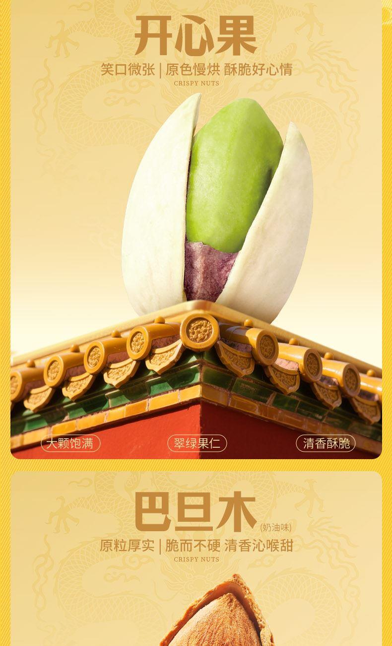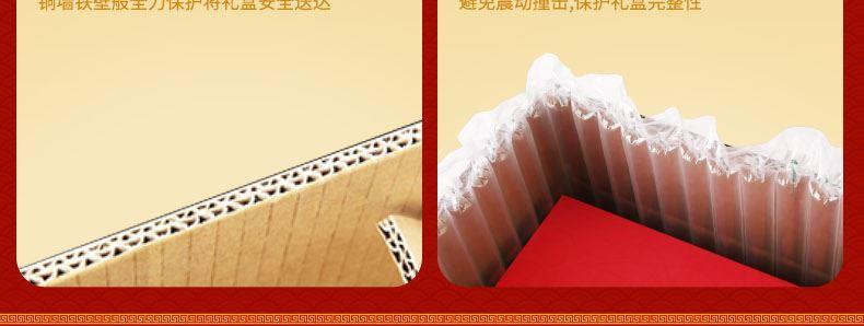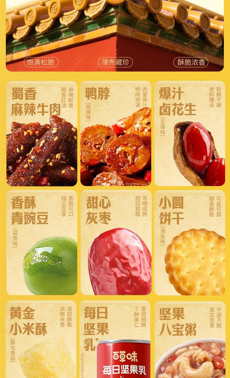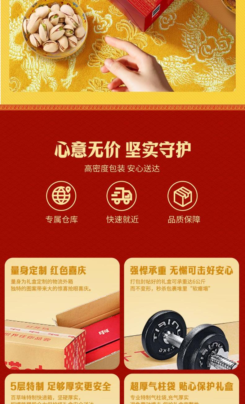 礼盒尺寸mm(长*宽*高):400*120*290 保质期:240天 内配:开心果60g 巴旦木(奶油味)60g 纸皮核桃 100g 蜀香麻辣牛肉60g 鸭脖(甜辣味)65g 爆汁卤花生(五香味)228g 香酥小豌豆(蒜香味) 120g 甜心灰枣 70g 小圆饼干(海盐味)100g 黄金小米酥(膨化食品)70g 每日坚果乳 310g 坚果八宝粥360g