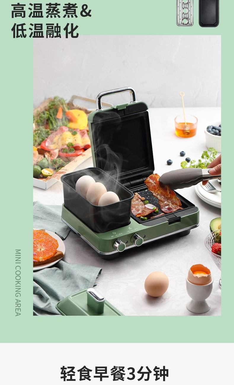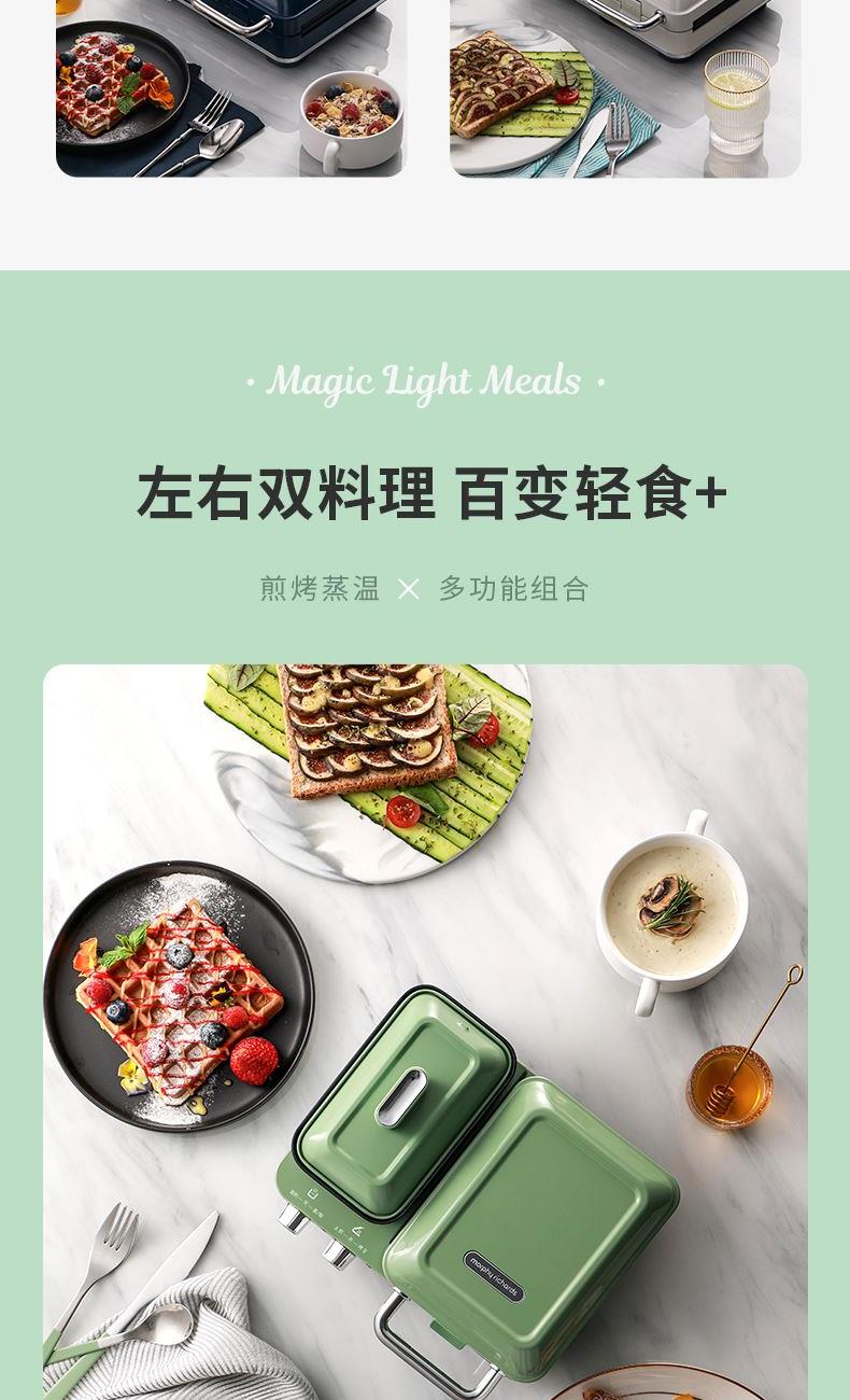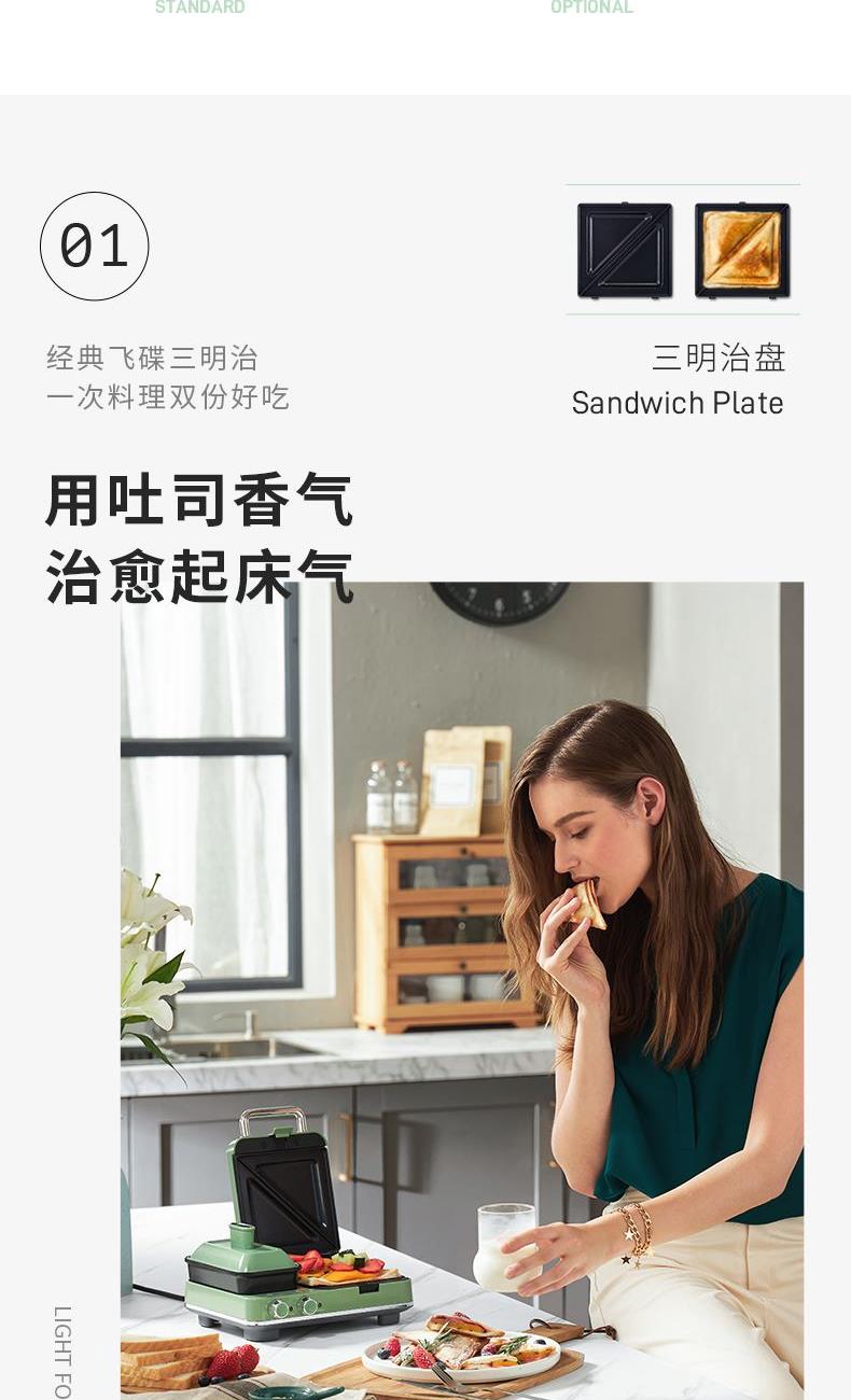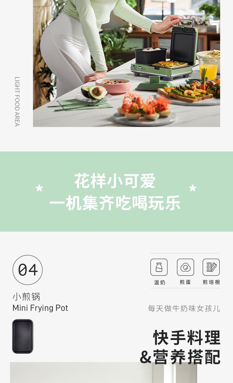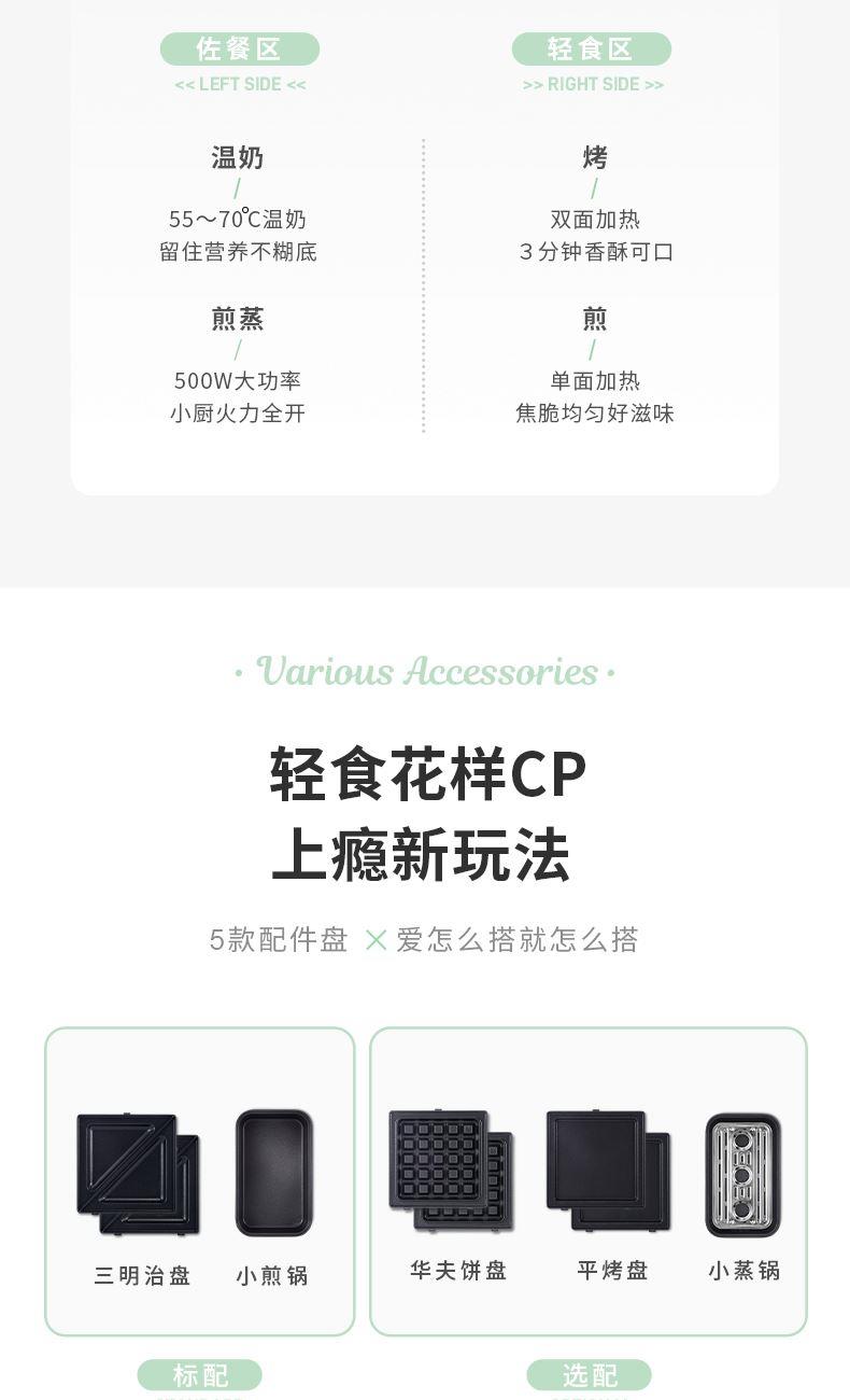 轻食早餐:具备三文治、华夫饼、蒸、煎、温奶等多种功能 蒸煎烤多种功能配件选择:采用压铸铝底材,提高加热效率,受热均匀、可拆易换、清洗方便!