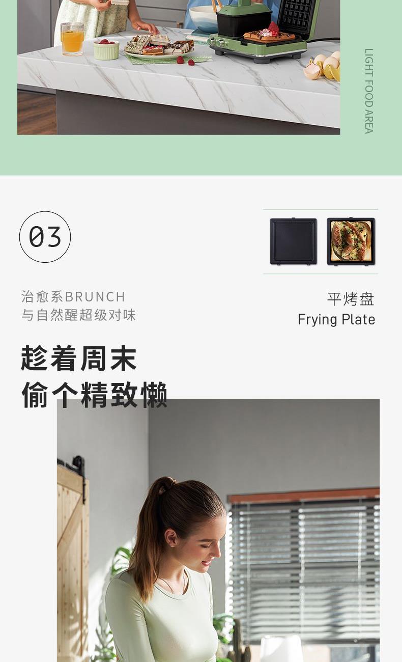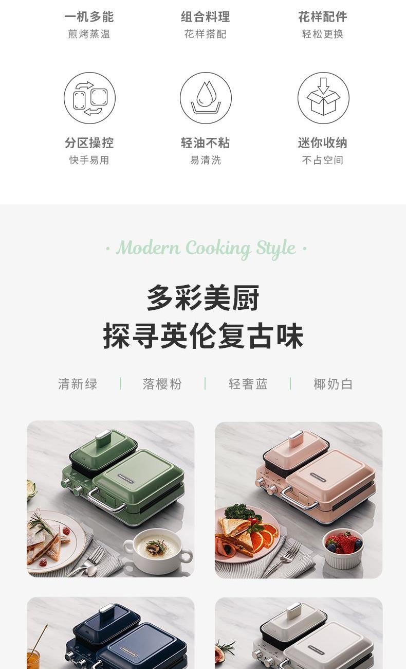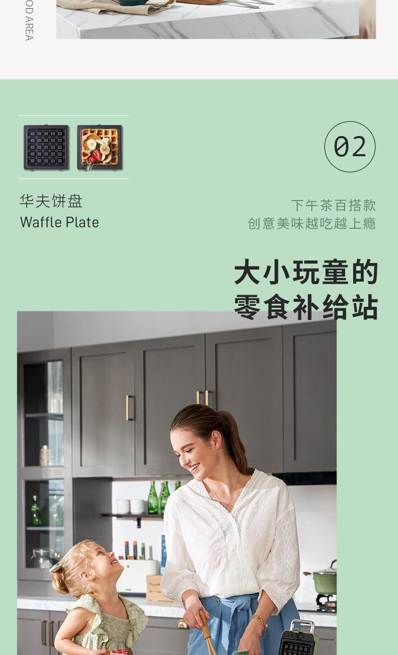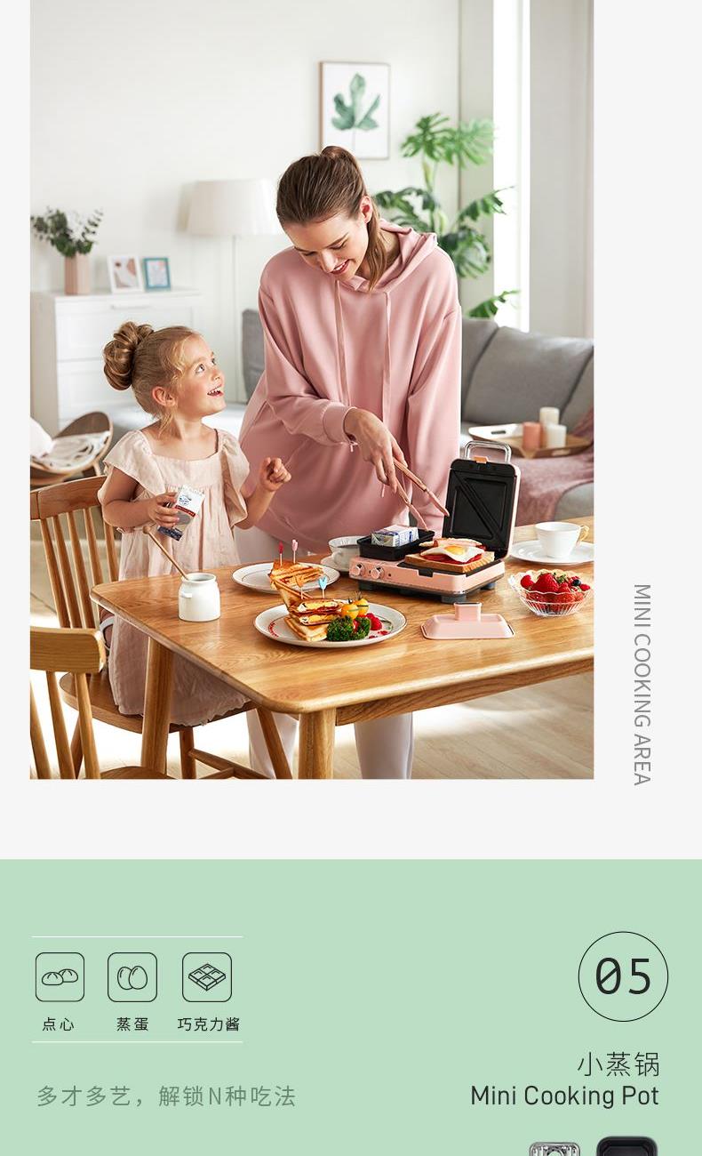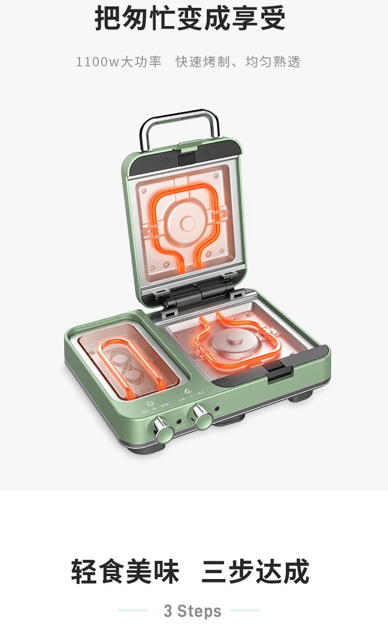 轻食早餐:具备三文治、华夫饼、蒸、煎、温奶等多种功能 蒸煎烤多种功能配件选择:采用压铸铝底材,提高加热效率,受热均匀、可拆易换、清洗方便!