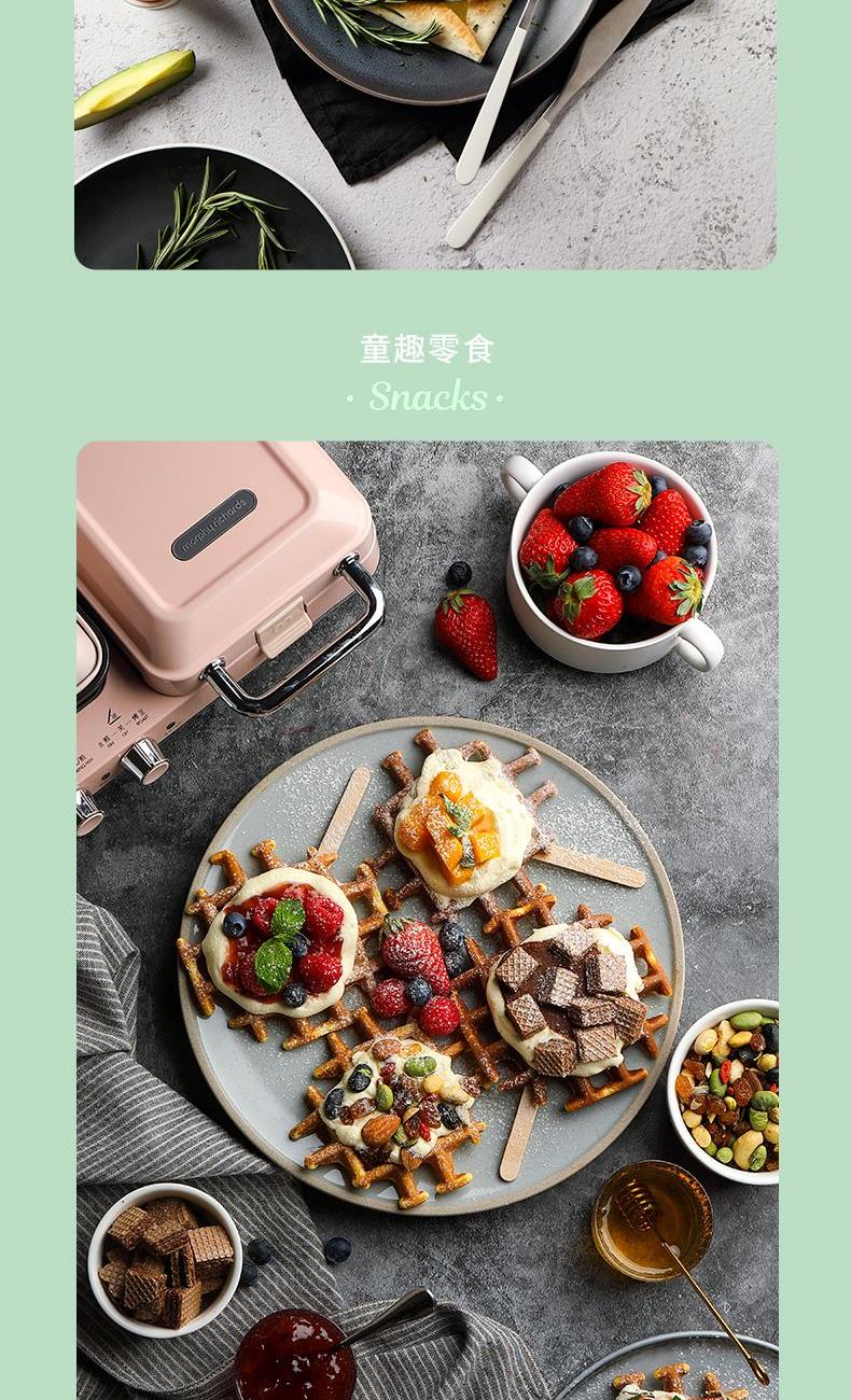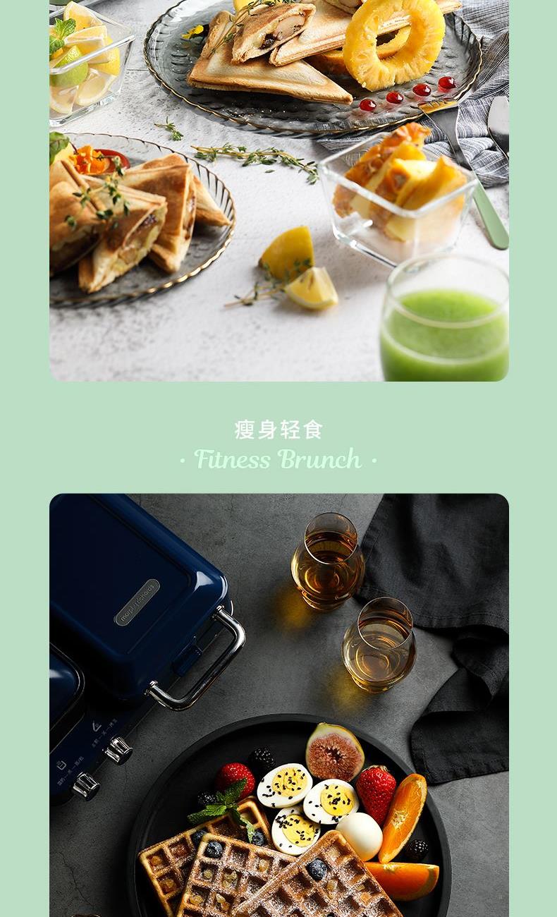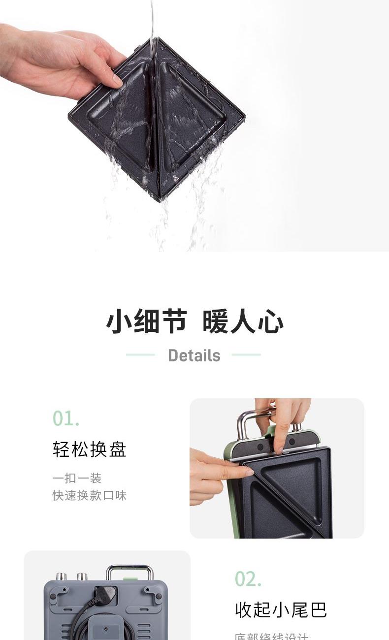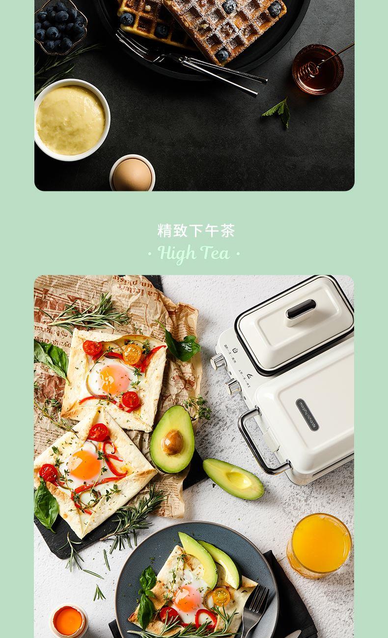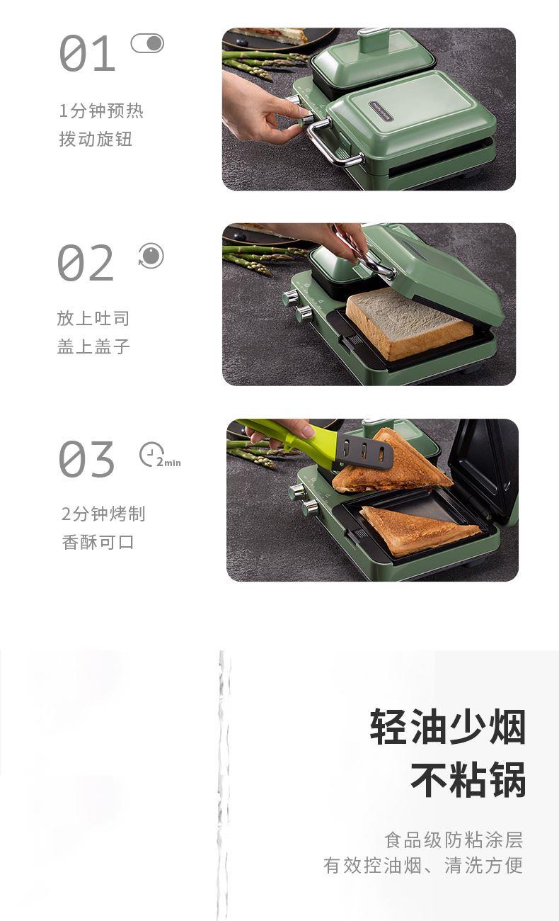 轻食早餐:具备三文治、华夫饼、蒸、煎、温奶等多种功能 蒸煎烤多种功能配件选择:采用压铸铝底材,提高加热效率,受热均匀、可拆易换、清洗方便!