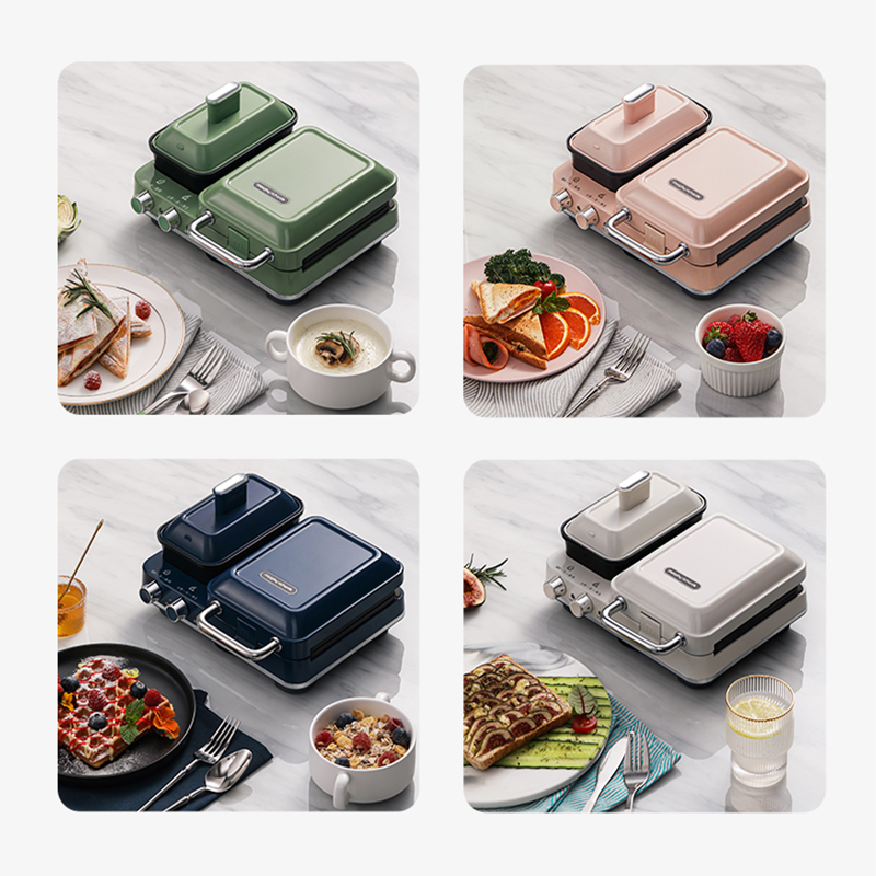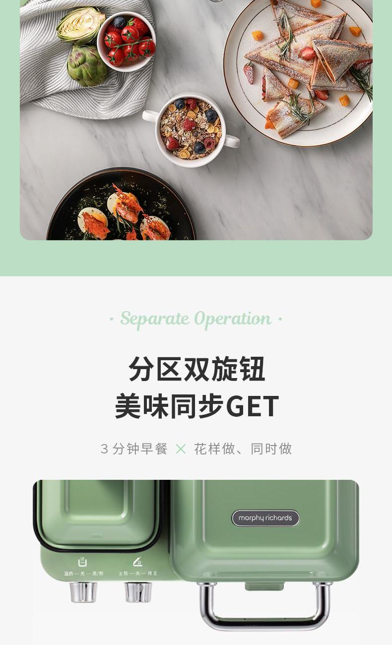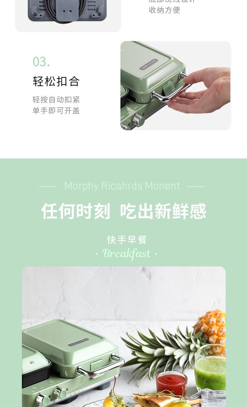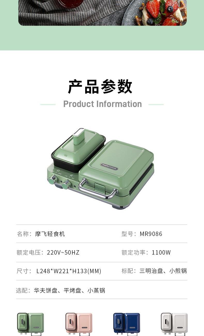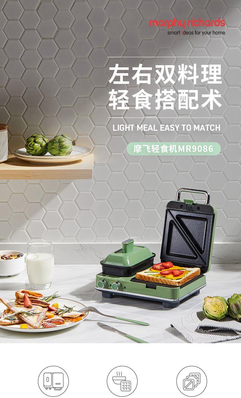 轻食早餐:具备三文治、华夫饼、蒸、煎、温奶等多种功能 蒸煎烤多种功能配件选择:采用压铸铝底材,提高加热效率,受热均匀、可拆易换、清洗方便!