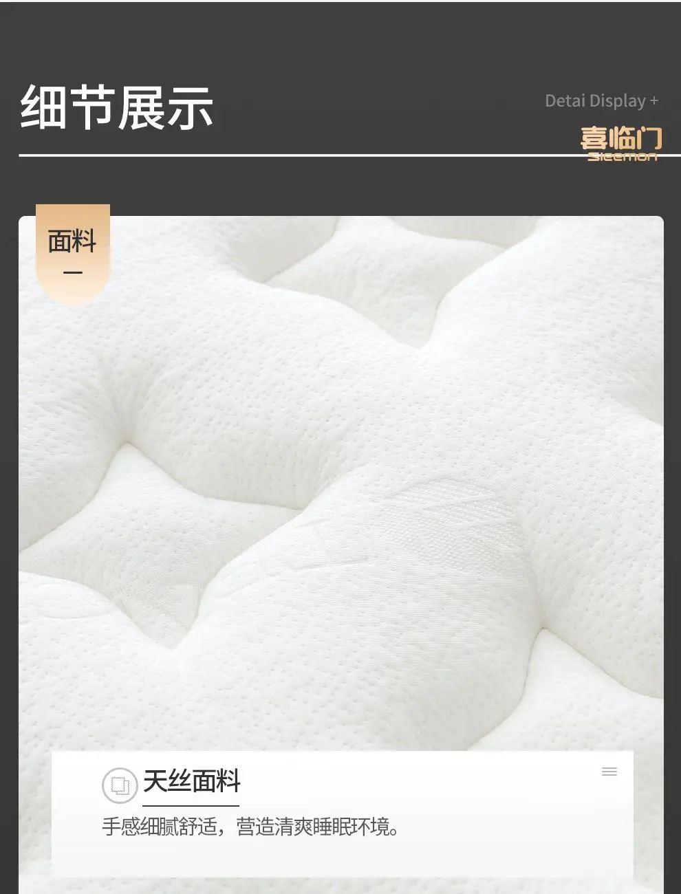 2.柔韧高弹,透气散热:主材采用进口天然乳胶和纳米竹炭海绵,饱满厚实、弹性优异,自动贴合不同睡姿,并且柔软透气,能及时散发人体热量