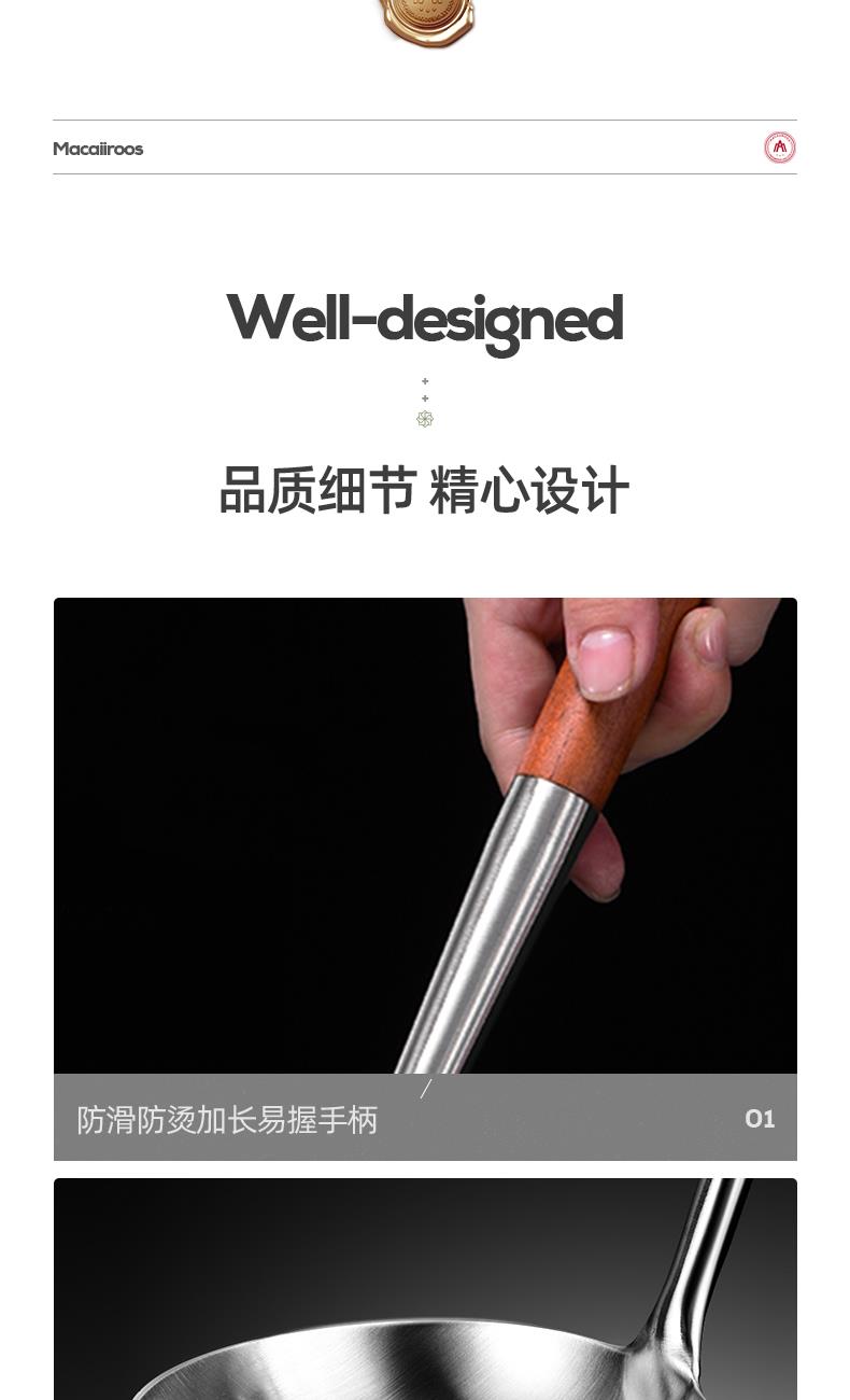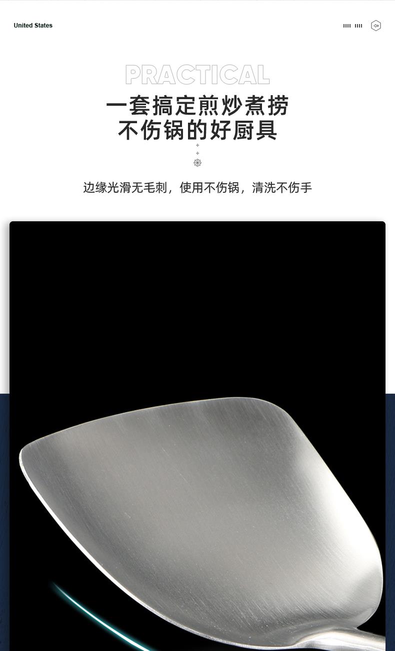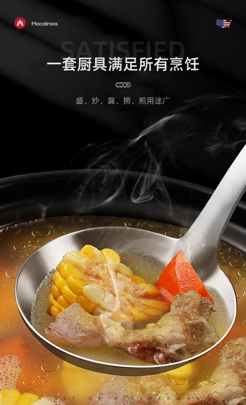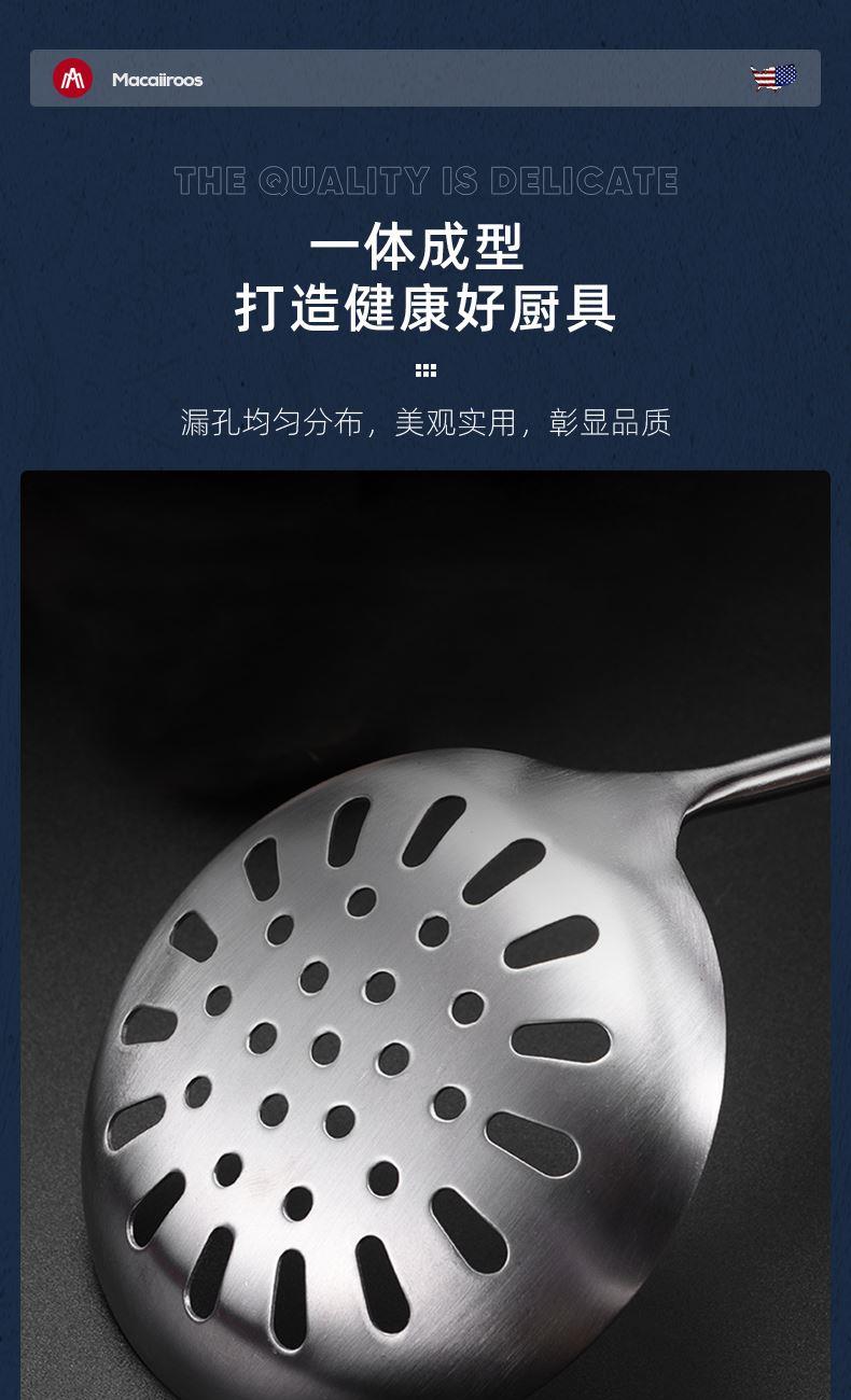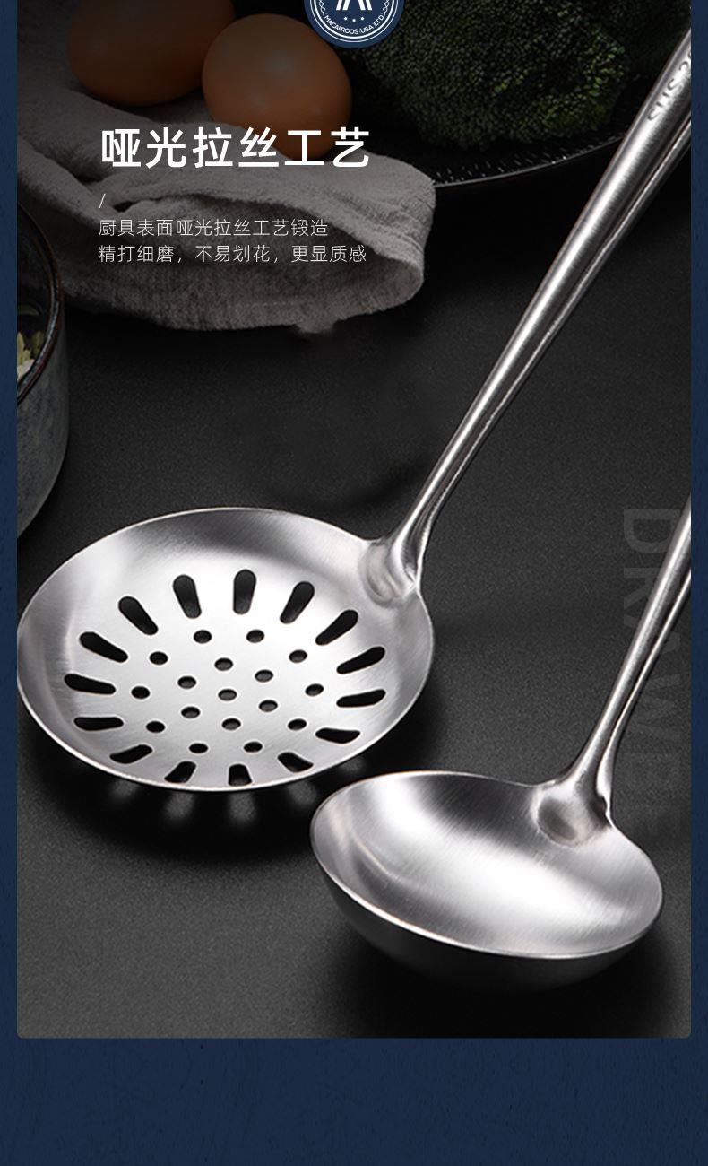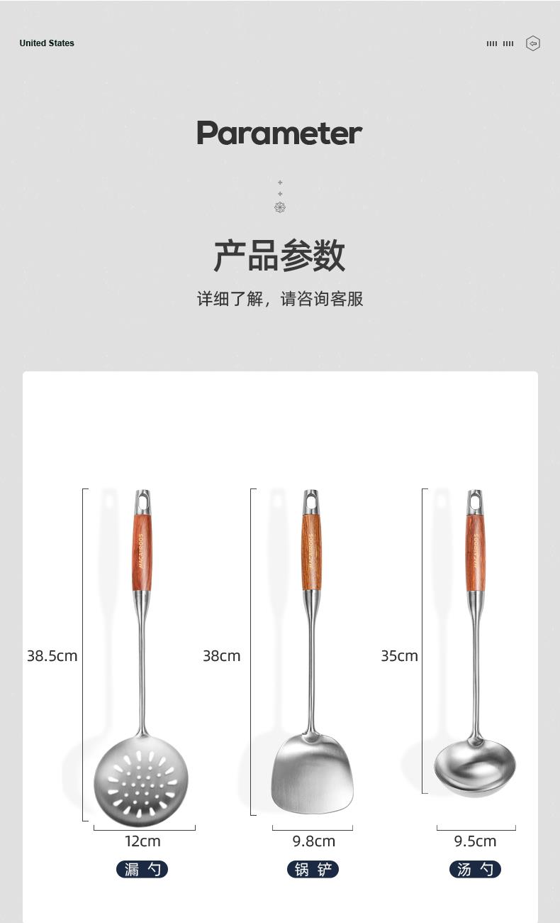 材 质:食品级不锈钢 产品净重:0.61kg 产品毛重:0.8kg 整箱重量:9.0kg 装 箱 数:10台/箱 产品尺寸:锅铲380x98mm 汤勺350x95mm 漏勺385x120mm 邮包尺寸:125x105x395mm 外箱尺寸:545x265x420mm