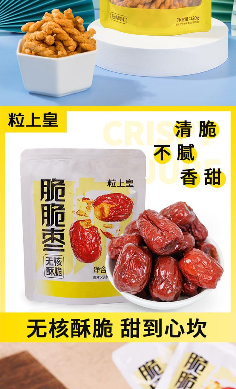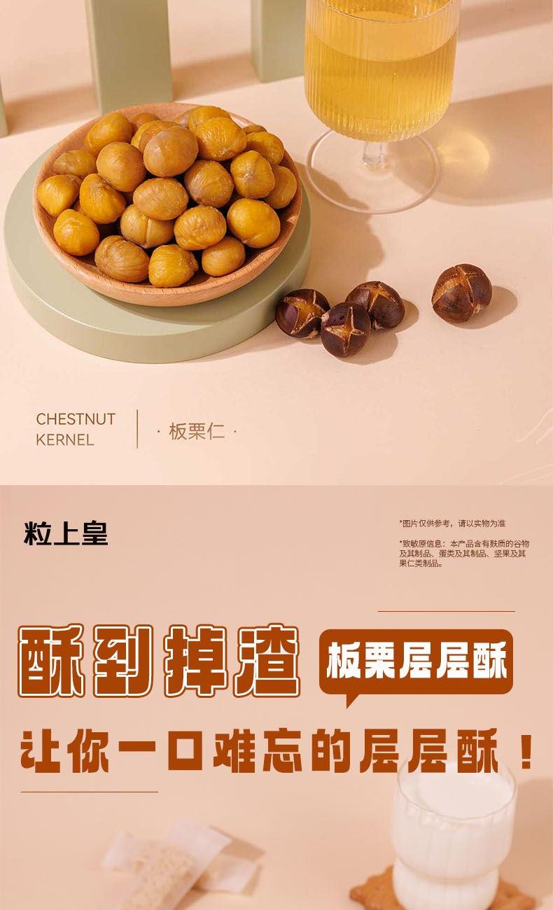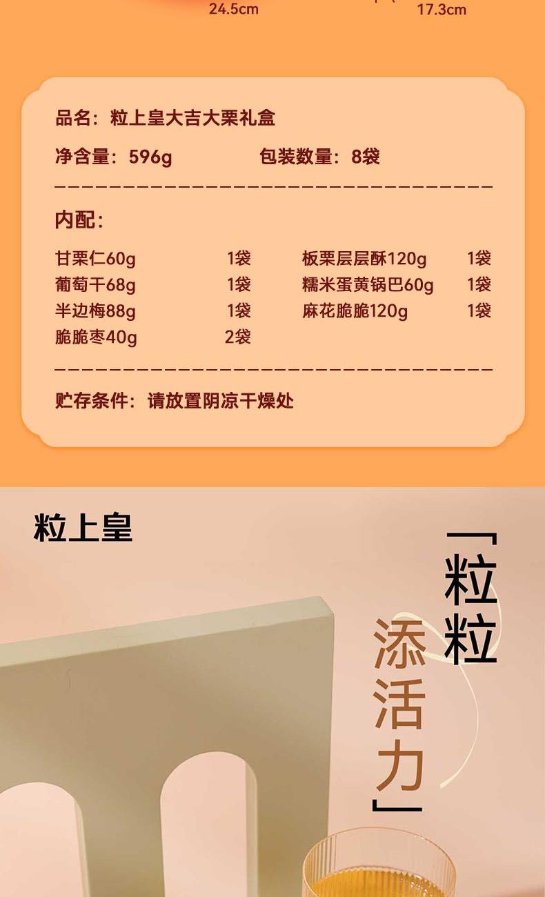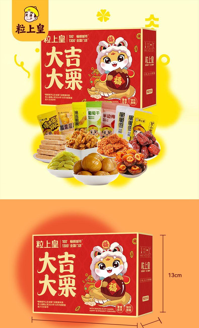 粒上皇甘栗仁60g*1 粒上皇葡萄干68g*1 粒上皇半边梅88g*1 粒上皇脆脆枣40g*2 粒上皇板栗层层酥120g*1 粒上皇糯米蛋黄锅巴60g*1 粒上皇麻花脆脆120g*1 红元素春节礼盒*1