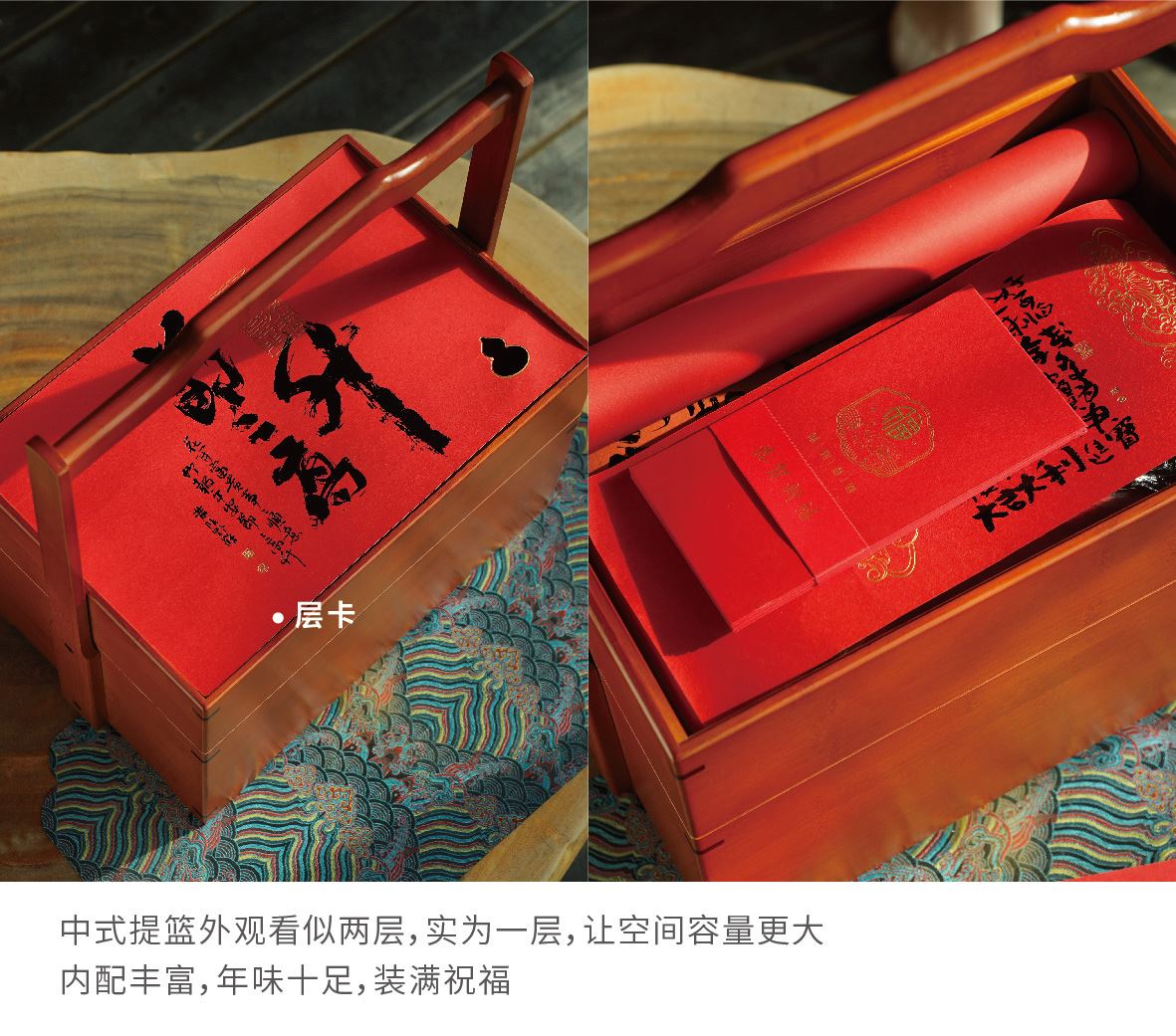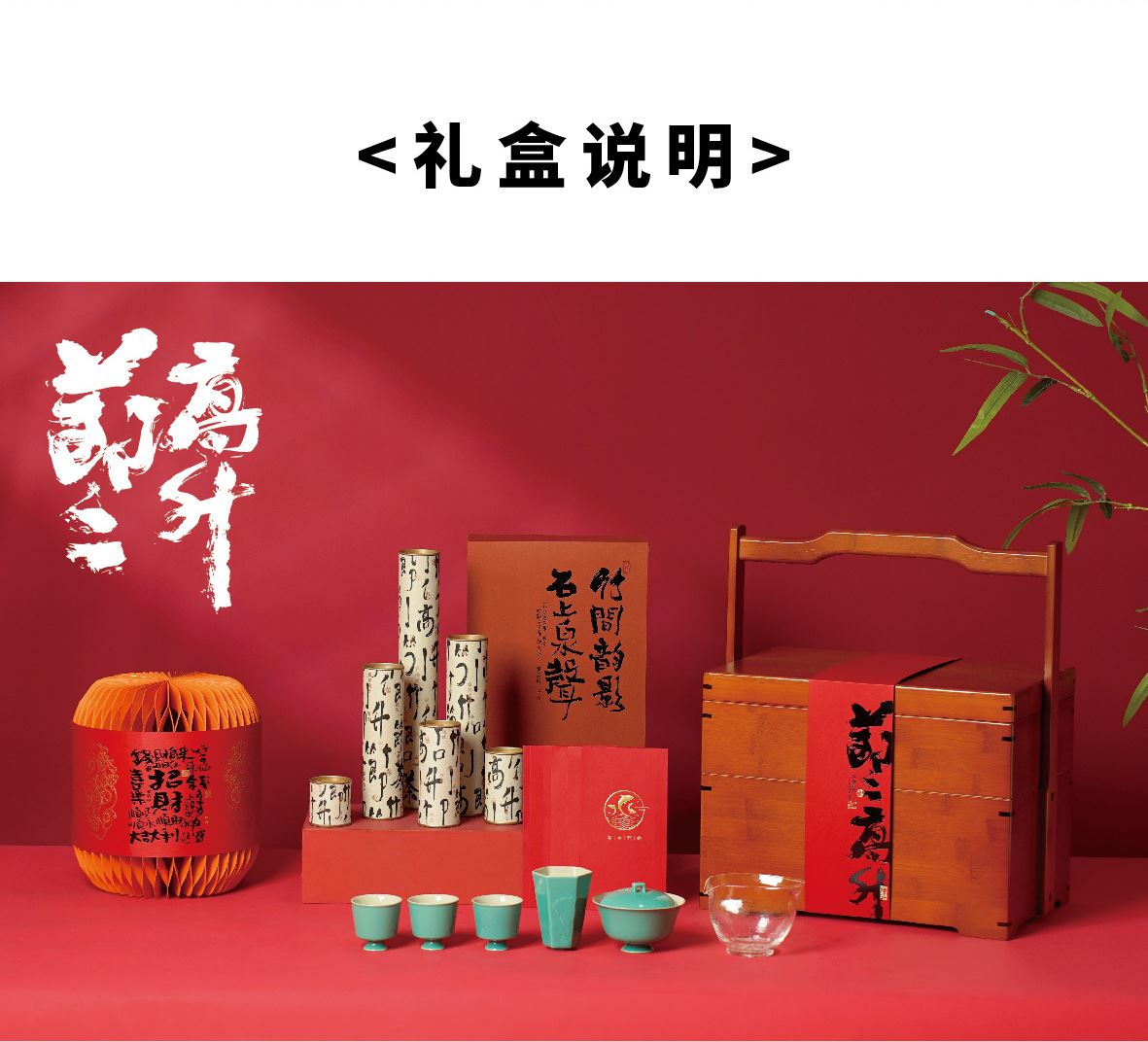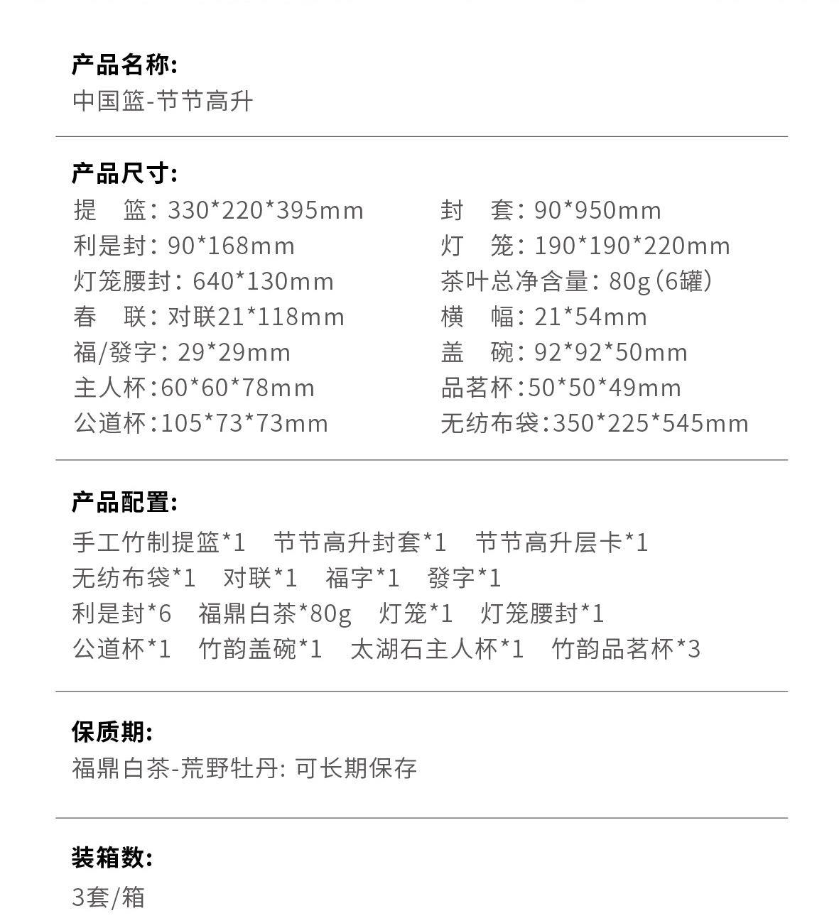 产品配置:手工竹制提篮*1 节节高升封套*1 节节高升层卡*1 对联*1 福字*1 發字*1 无纺布袋*1 利是封*6 福鼎白茶*80g 灯笼*1 灯笼腰封*1 公道杯*1 竹韵盖碗*1 太湖石主人杯*1 竹韵品茗杯*3 提篮尺寸:330*220*395mm 利是封尺寸:90*168mm 灯笼尺寸:190*190*220mm 春联尺寸:对联21*118mm 横幅21*54mm 福字/發字29*29mm