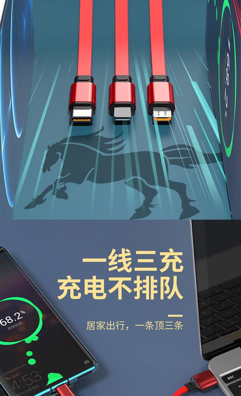 ● 66W-100W快充:提供高效的充电体验 ● 一线三充:支持三台手机同时充电 ● 伸缩设计:五个档位可调节 ● 加粗线芯:保护设备安全 ● 小巧易收纳:携带方便 告别凌乱